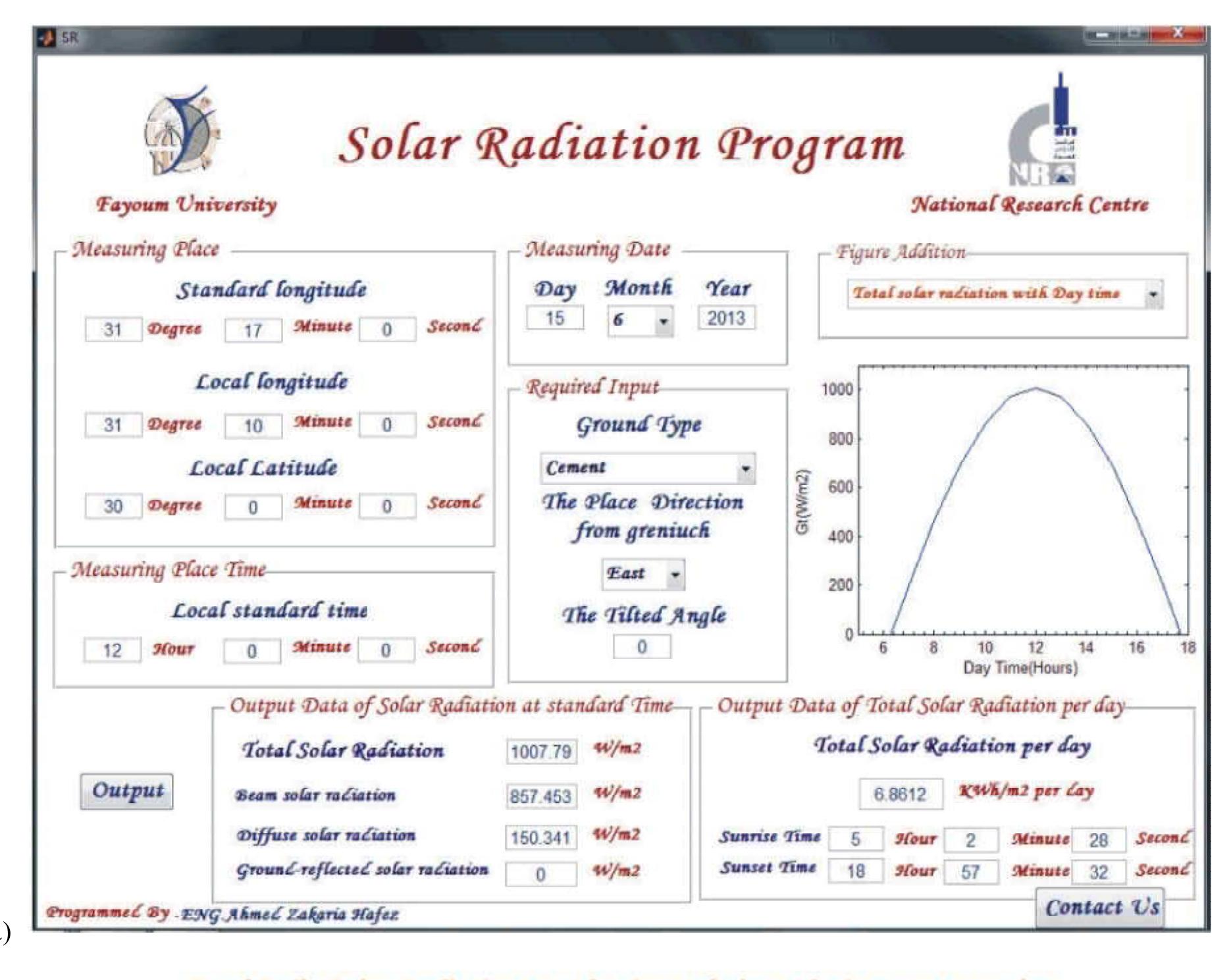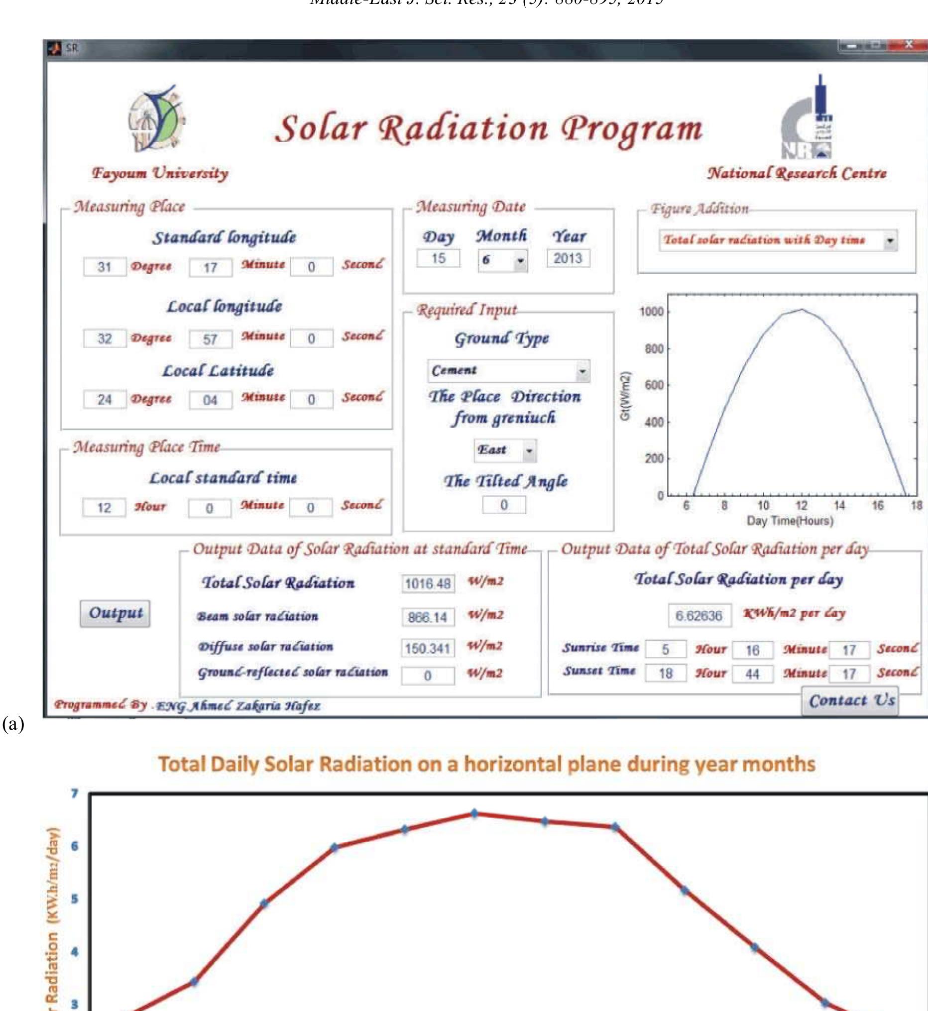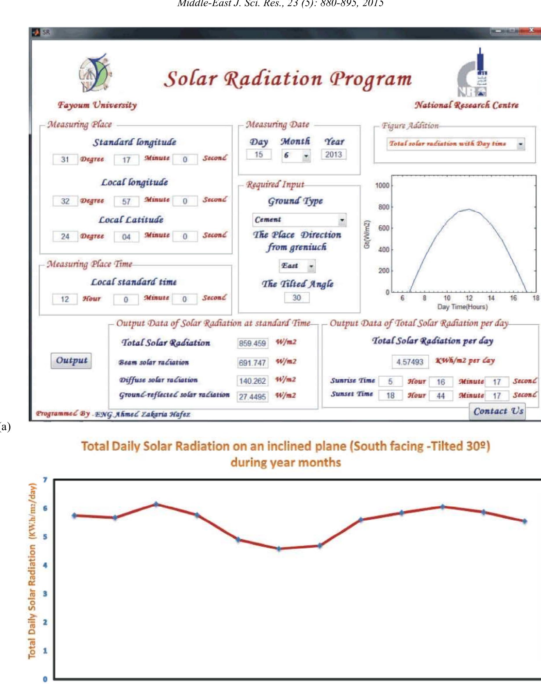 In this paper a study has been made to estimate average global radiation using hours of bright su... more In this paper a study has been made to estimate average global radiation using hours of bright sunshine and calculated solar radiation data available for different locations in Egypt. An empirical model is proposed for estimating daily global solar radiation on a horizontal and on a tilted, south-facing surface by the days of the year.Also, presents the implementation of a generalized solar radiation simulation model using MATLAB/GUI interface. The model is developed using basic equations of the solar radiation including effects of time change and different location of sites. The present study was carried out for the provinces and main cities of Egypt. The amount of hourly, monthly and yearly average of daily solar radiation are computed and discussed.This database contains normal direct and global horizontal irradiances as well as diffuses irradiance