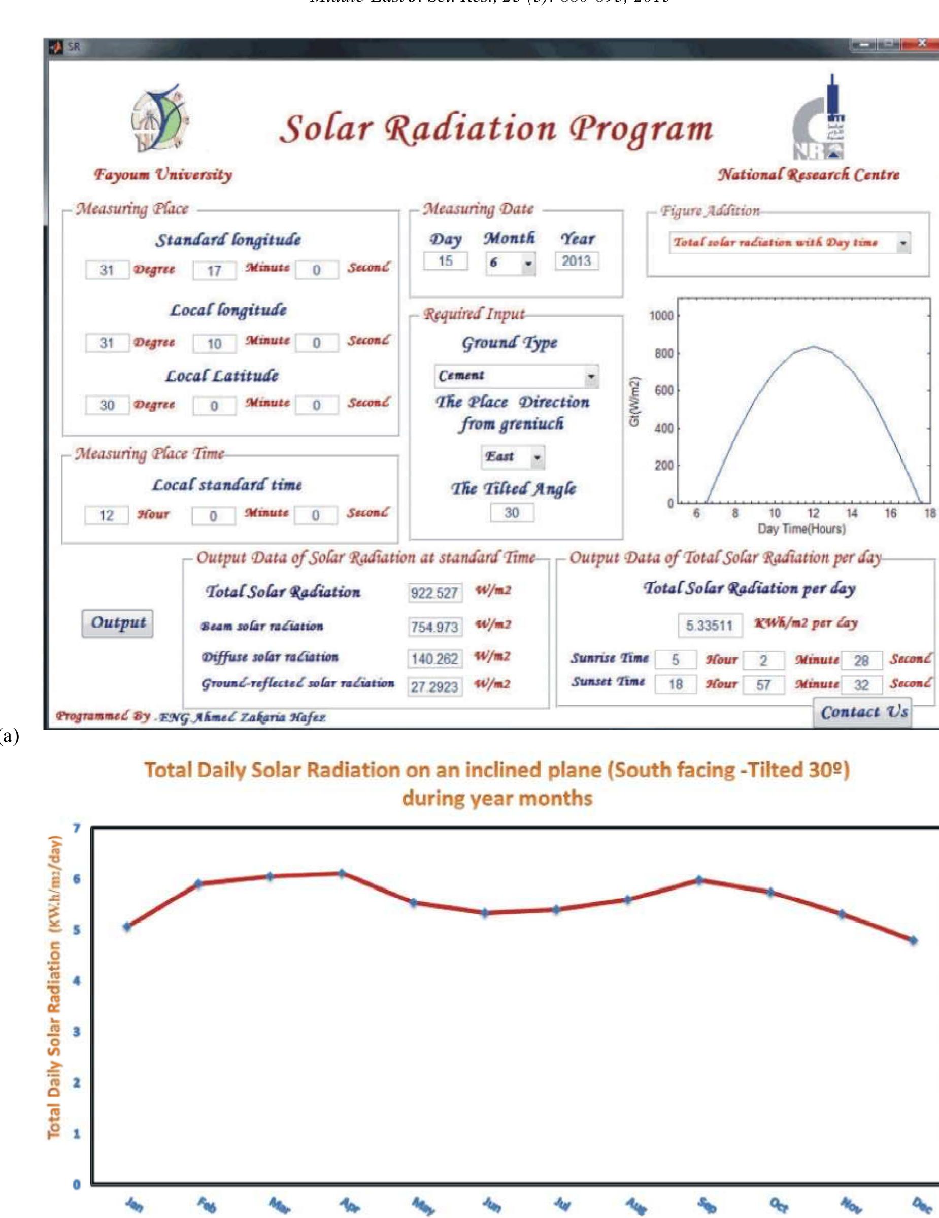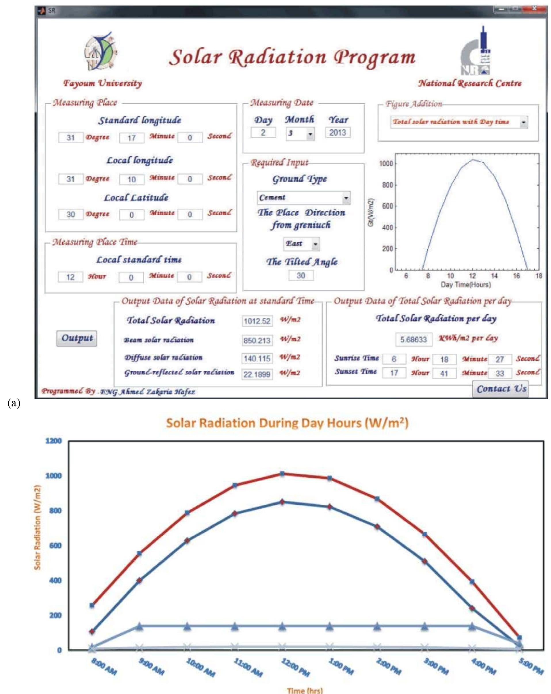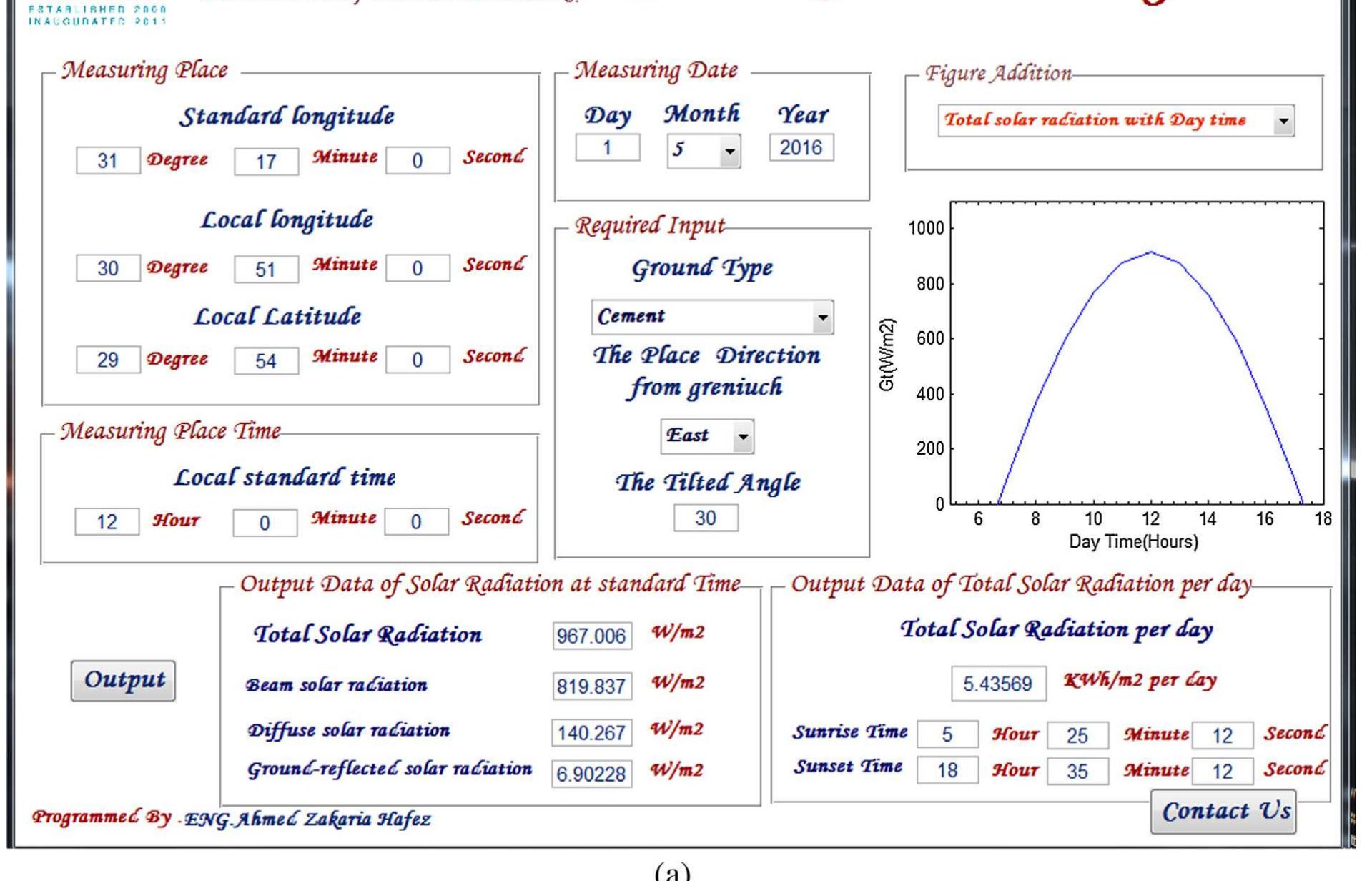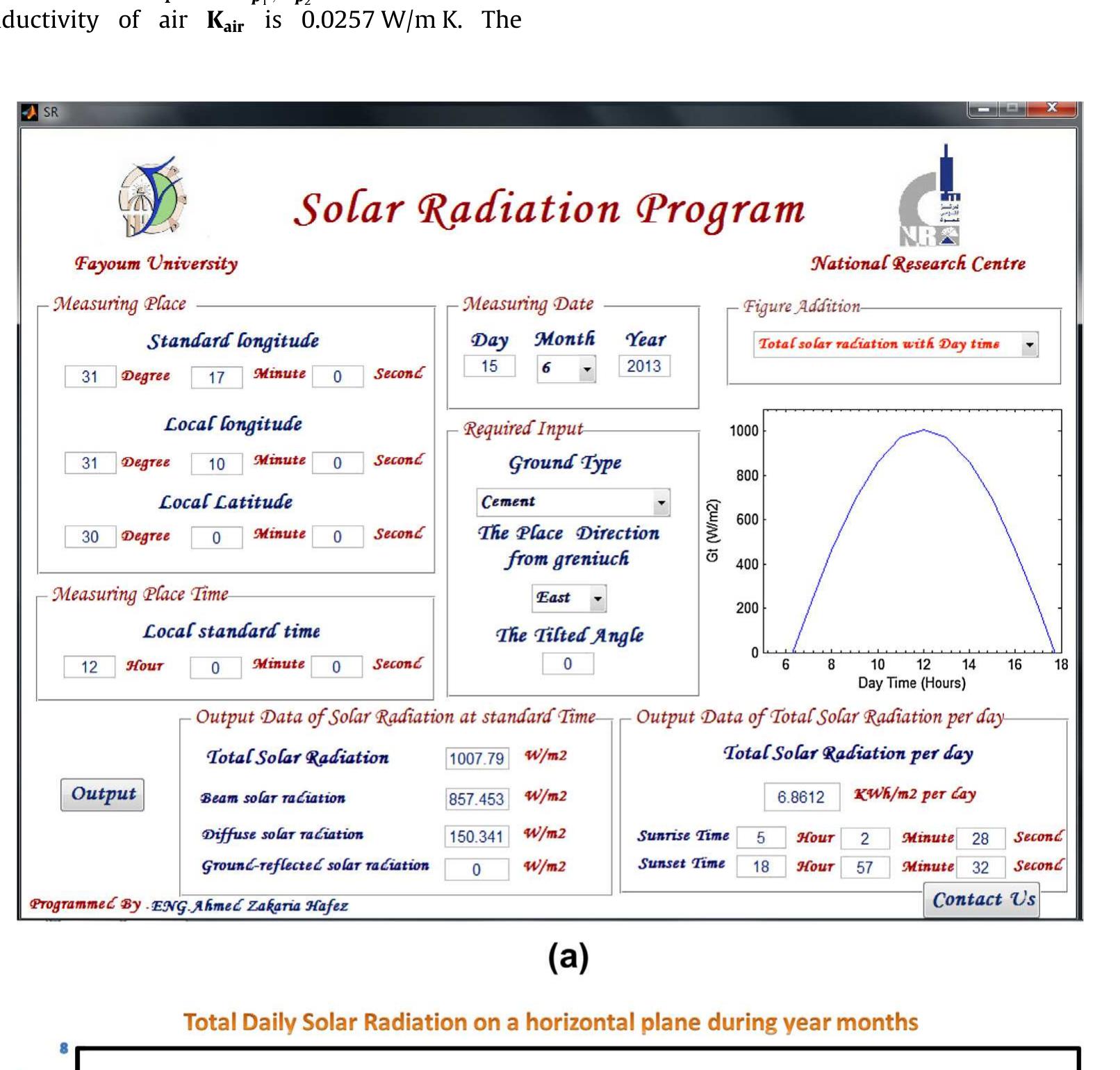 In this paper a study has been made to estimate average global radiation using hours of bright su... more In this paper a study has been made to estimate average global radiation using hours of bright sunshine and calculated solar radiation data available for different locations in Egypt. An empirical model is proposed for estimating daily global solar radiation on a horizontal and on a tilted, south-facing surface by the days of the year.Also, presents the implementation of a generalized solar radiation simulation model using MATLAB/GUI interface. The model is developed using basic equations of the solar radiation including effects of time change and different location of sites. The present study was carried out for the provinces and main cities of Egypt. The amount of hourly, monthly and yearly average of daily solar radiation are computed and discussed.This database contains normal direct and global horizontal irradiances as well as diffuses irradiance
