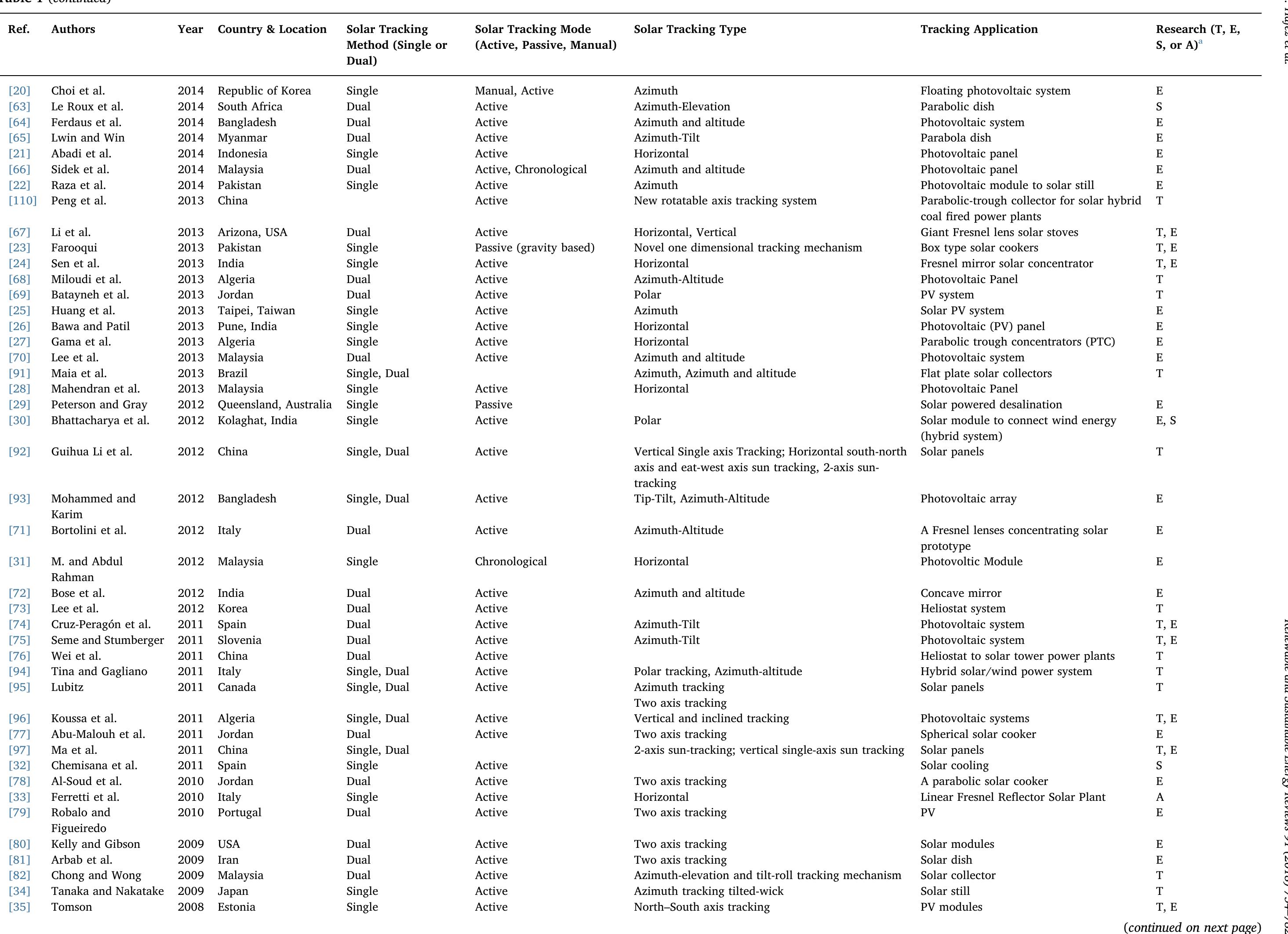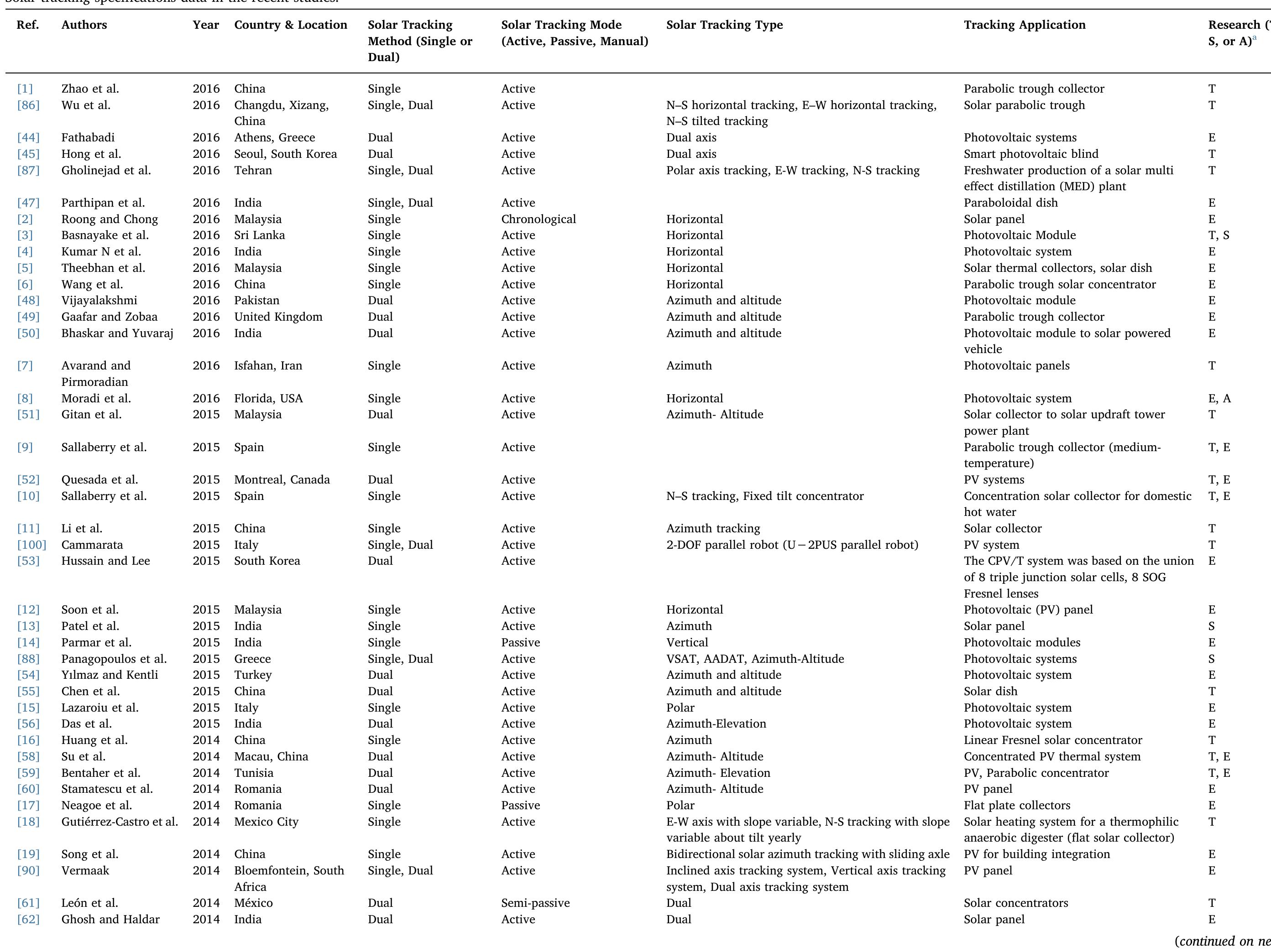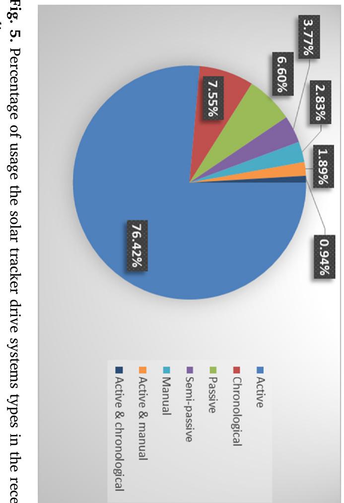 This paper presents a comprehensive review on solar tracking systems and their potentials in sola... more This paper presents a comprehensive review on solar tracking systems and their potentials in solar energy applications. The paper overviews the design parameters, construction, types and drive system techniques covering different usage application. There are two main solar tracking systems types that depending on their movement degrees of freedoms are single axis solar tracking system and dual axis solar tracking system, which are addressed in the recent studies. The solar tracker drive systems encompassed five categories based on the tracking technologies, namely, active tracking, passive tracking, semi-passive tracking, manual tracking, and chronological tracking. The paper described the various designs and components of the tracking systems. There are 42.57% of the studies discussed and presented single axis tracking systems while 41.58% of these studies to the dual axes tracking systems. In the recent research studies, the most common solar tracker drive type was active tracker by 76.42% usage in applications while in the second most impact type is the chronological solar tracker by 7.55%. Furthermore, in the solar tracking techniques, Azimuth and altitude tracking achieved 16.67% in usage, Horizontal tracking by 16.67%, Azimuth tracking by 10%, and polar tracking by 4.44%.