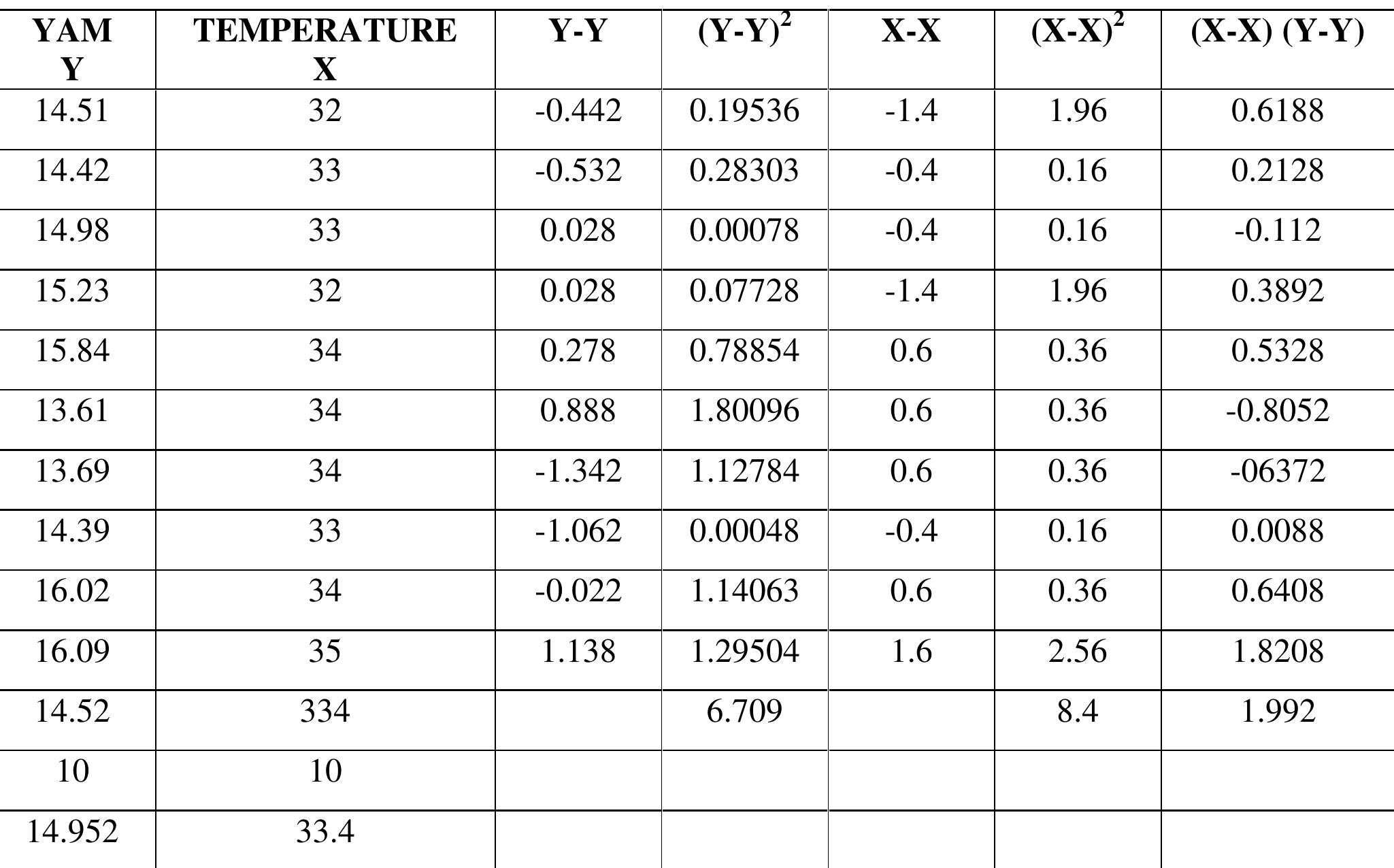 0.002x. Temperature and yam yield __ y = 6.936-0.24x. With the use of multiple regressions we obtained 0.14 between rainfall, temperature and yam yield is yield. We also discovered that 14% of the proportion variation of yam yield is explained by rain and temperature. The positive relationship obtained between yam and temperature, between yam rainfalls is in
