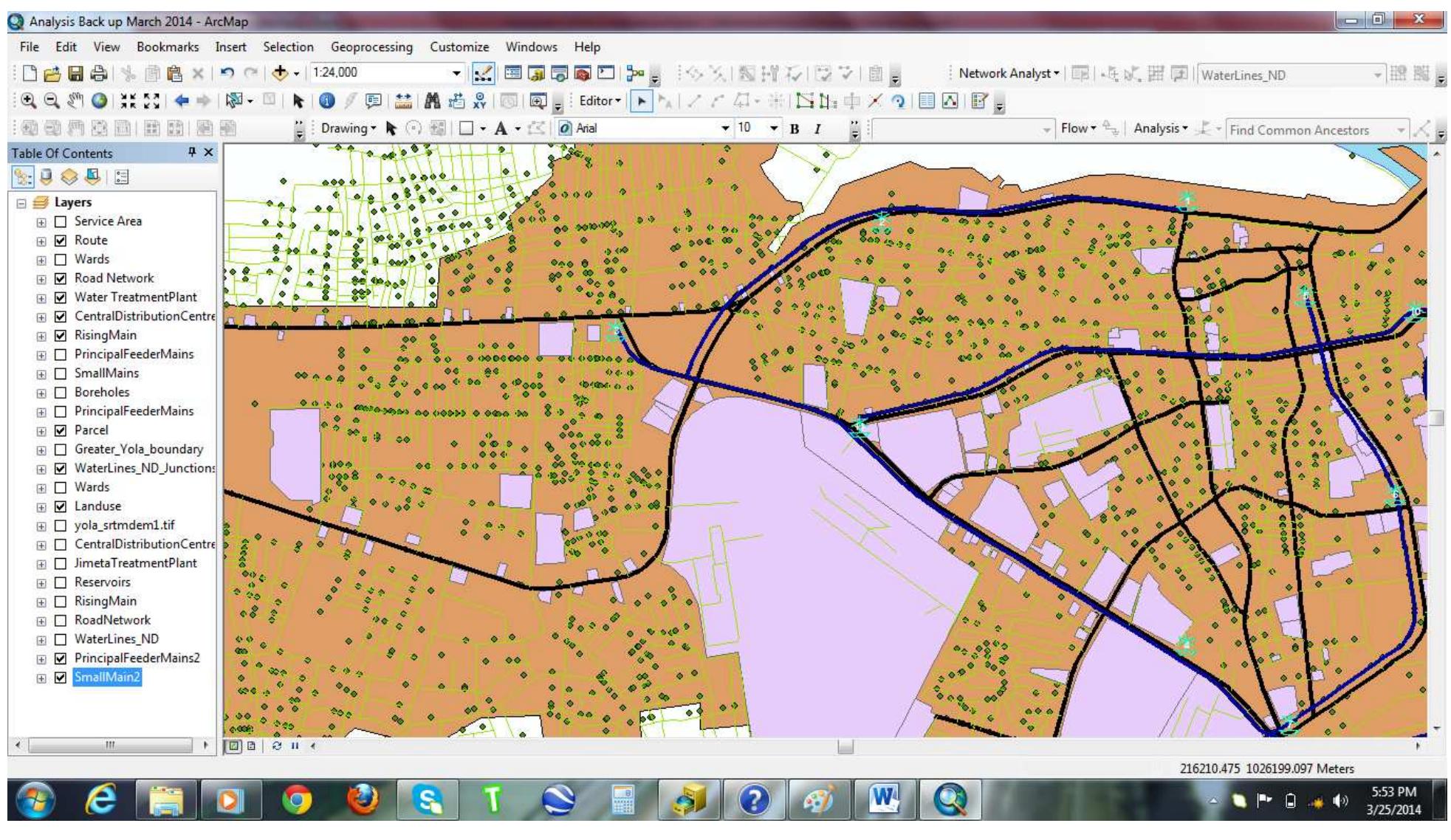 This paper focuses on optimal water distribution in Yola, Nigeria using the network analyst exten... more This paper focuses on optimal water distribution in Yola, Nigeria using the network analyst extension of ArcGIS 10.1. It is aimed at analyzing water distribution system in Yola with a view to Optimize distribution. The study covered the three hierarchies of water distribution namely; Trunk Main, Principal Feeder Mains and Small Mains. Five different datasets used for the study includes; Street data, existing pipeline network, Land use, Topographic and Population data. Network dataset was created with components of the network as feature datasets. The existing water distribution network was digitized on the street map, digital elevation model (DEM) was also generated using ArcGIS 10.1 to visualize the Topography of the study area. Suitable locations for reservoirs were determined by the DEM for smooth flow under gravity. Best route for Trunk mains that will serve the reservoirs were found by route analysis using the network dataset earlier created. Service (catchment) areas to be covered by each reservoir were also determined within each ward to ensure total coverage. A Model was developed for effective water distribution. This study concluded that route analysis using network analyst extension as well as suitable location analysis using DEM provides an optimal water distribution system.