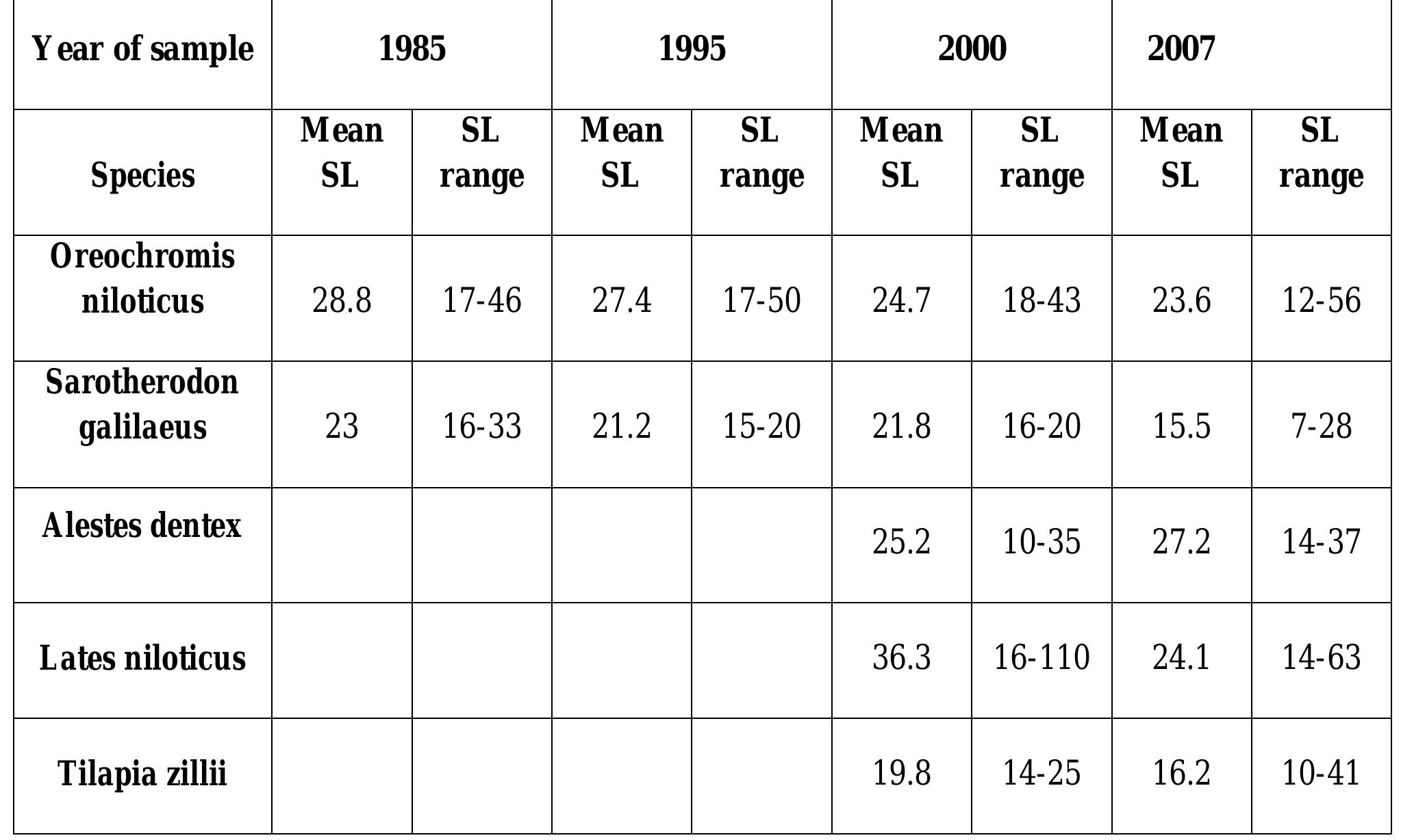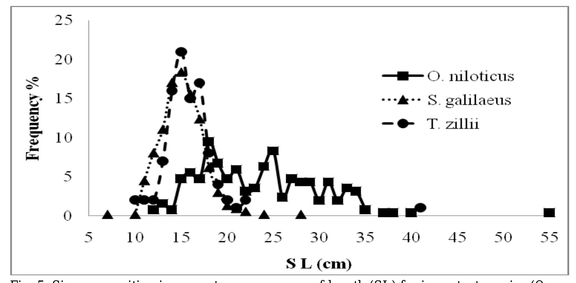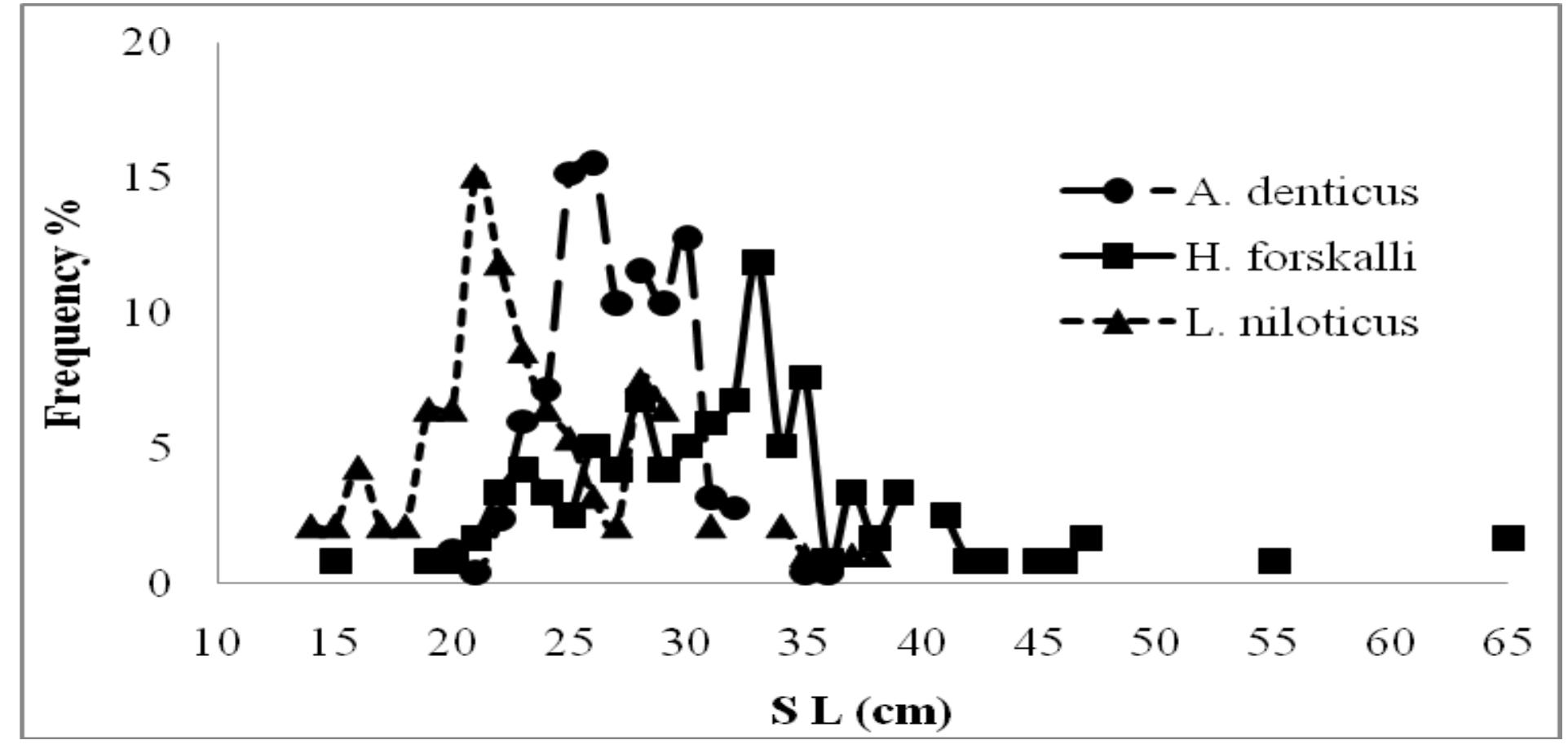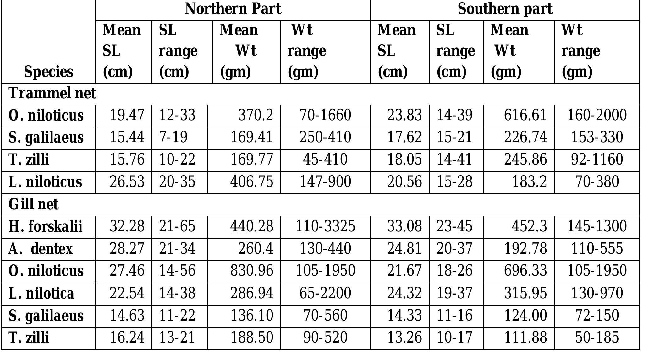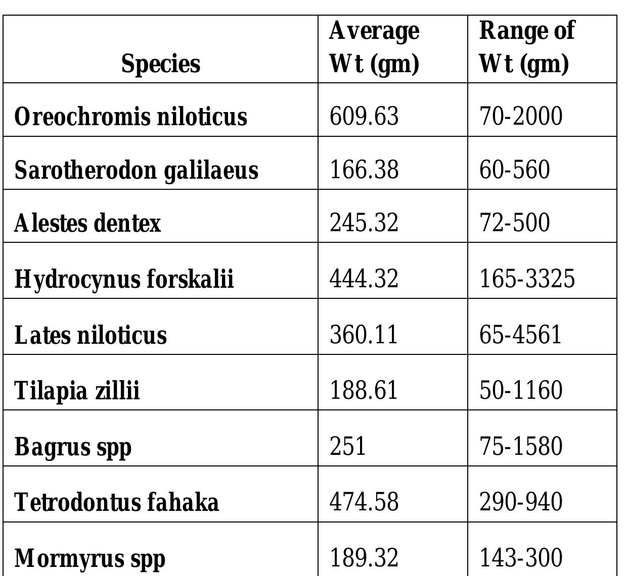 Artisanal fishery in the lake is conducted nearer to the shoreline in areas not more than 15m deep targeting only 6 species. The most dominant species were; Tilapia group (O. niloticus, S. galilaeus, and T. zillii), pelagic fishes (A. dentex and H. forskalii) and L. niloticus. A size-range of each species and their distribution pattern in different areas of the lake was described for the major fish species in the lake. The time series of size distribution showed high exploitation rate for most important commercial species in the Lake.