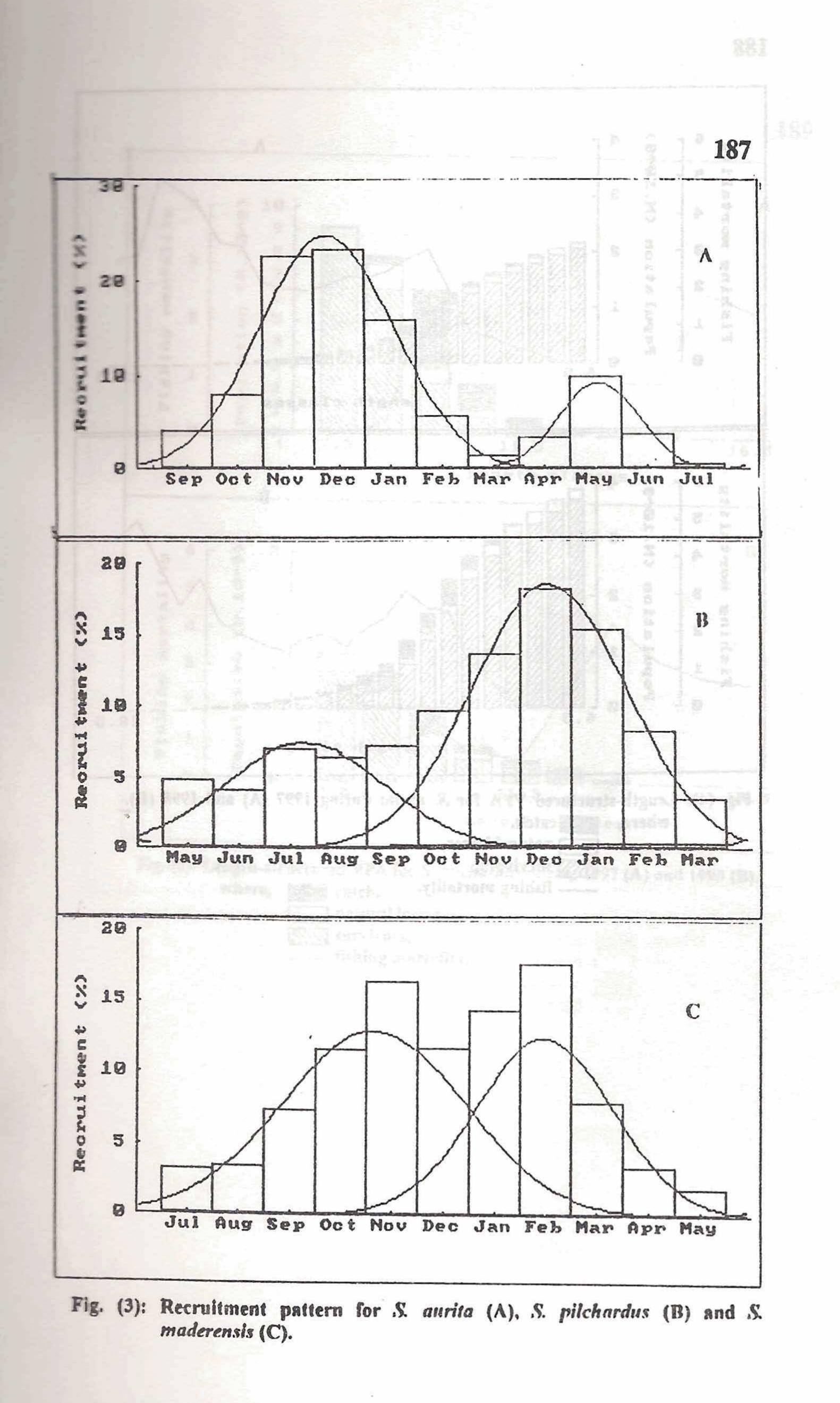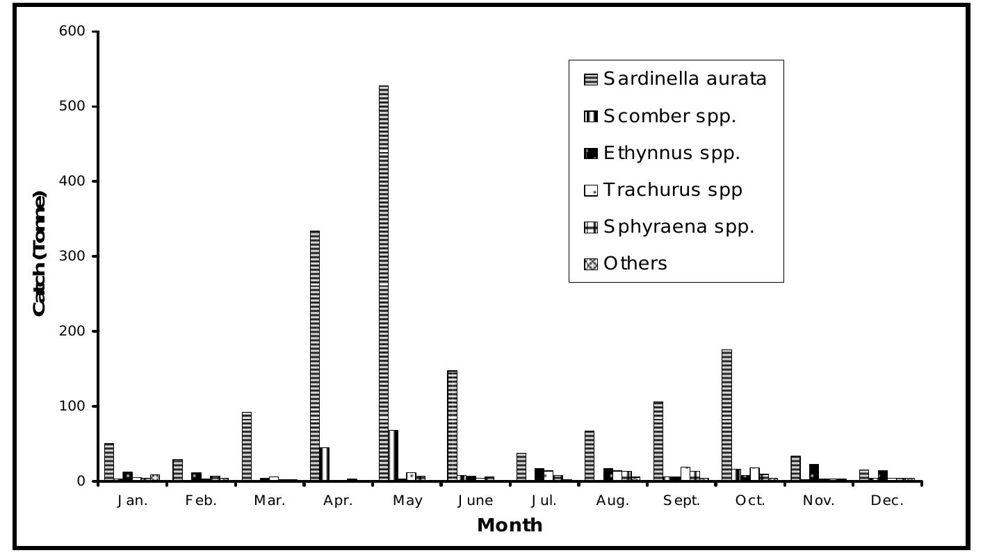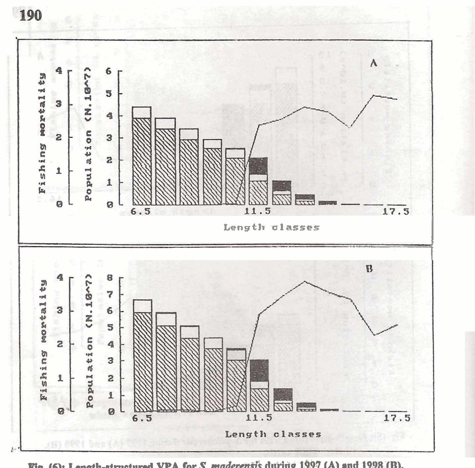 Species composition for a total of 14432 tonnes of sardine landings at four landing sites during ... more Species composition for a total of 14432 tonnes of sardine landings at four landing sites during 1997 and 1998 was determined. Three species, Sardinella aurita, Sardina pilchardus and Sardinella maderensis were found mainly constituting the whole sardine catch. Data-based estimates of growth parameters Loo, K & h) and mortality coefficients (Z, F & M) were estimated length structured virtual population analysis (VPA) revealed that the respective stock biomass of the three species (S. aurita, S. pilchardus and S. rnaderemis) increased &om 1805.17, 252.96 and 242.48 tonnes in 1997 to 3415.82, 3768.11 and 330.31 tonnes respectively in 1998.