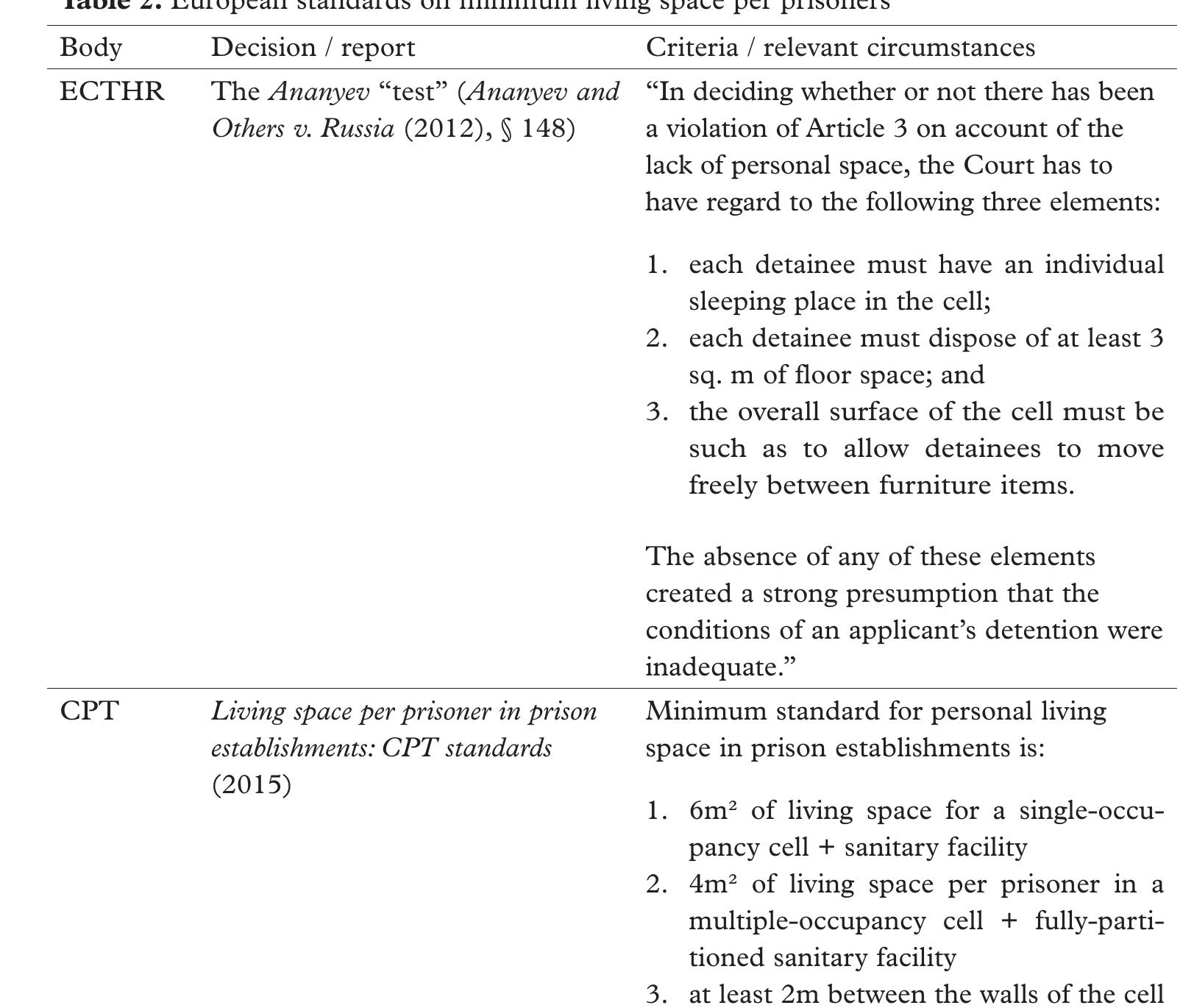 The article addresses the issue of prison overcrowding and how it can be tantamount to ill-treatm... more The article addresses the issue of prison overcrowding and how it can be tantamount to ill-treatment or torture under international law. Faced with such a broad phenomenon, the piece focuses on two elements that may help to assess this circumstance: the existence of a minimum standard with respect to living space, and the use of tools to establish the existence of harm caused by inhuman conditions of incarceration. The article will show novel jurisprudence of some Courts to secure reparation for victims (early release and reduction of sentence time as offsetting) and will address discussion on the scope and limitations of these decisions with the aim of proposing even more courageous measures to ensure group and generalised reparation measures to reduce the rates of structural institutional violence in prisons.