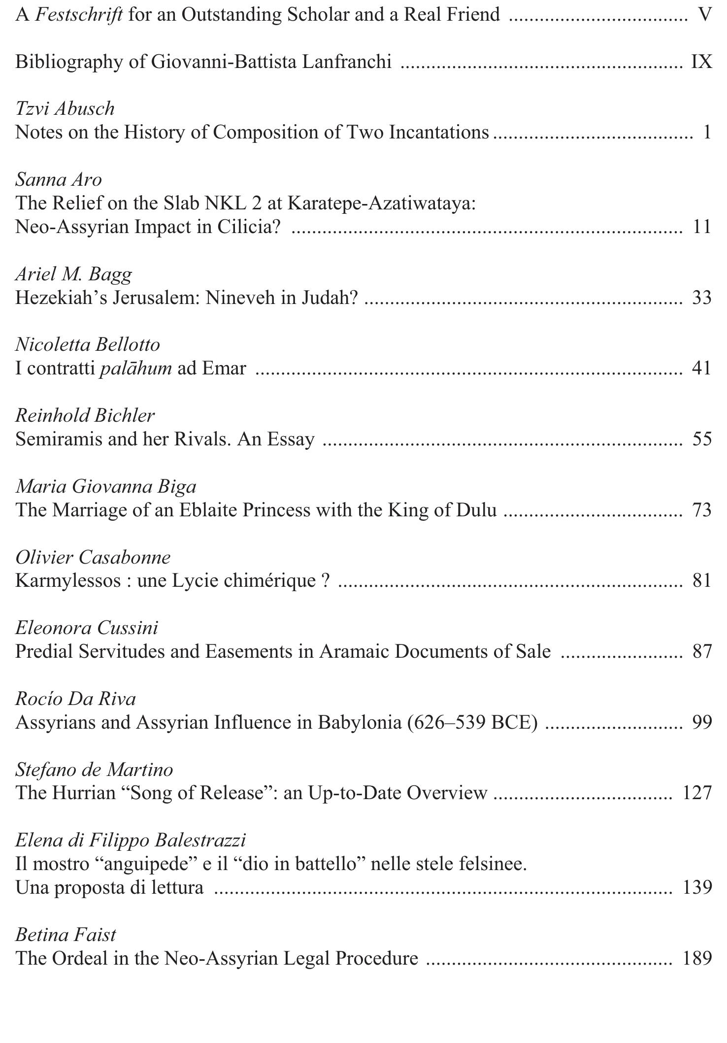 River Navigation and Transport in Northern Assyria. The Stone Quay-Walls of the Rivers Gomel and Al-Khazir in the Navkur Plain, Iraqi Kurdistan, in S. Gaspa, A. Greco, D. Morandi Bonacossi, S. Ponchia, R. Rollinger (eds.), From Source to History. AOAT 412, Münster, 2014, 441-453 Lo studio della Storia Antica è sempre stato, per Gianni, piacere intellettuale, dovere sociale e... more Lo studio della Storia Antica è sempre stato, per Gianni, piacere intellettuale, dovere sociale e morale e prosecuzione di quell'idea di "uomo di studio", imparata dal padre Luigi e così ben impressa nel suo cuore e nella sua mente. A lui, Gianni fa riferimento, quando studia, quando insegna, quando scrive. Fonti, documenti, testi, sono imprescindibili punti di partenza delle sue analisi, con il pensiero che guarda sempre al mondo dell'Oriente Antico. Uomo integerrimo e puro, non conosce la competizione e forse per questo, arriva sempre tra i primi. Ha molto a cuore i suoi allievi: di loro, non esita a metter in luce le qualità positive, soffocando in un "sono giovani" le intemperanze e gli umani difetti. Lo ammiro perché non conosce invidia, ira, malizia, sospetto: lo amo perché mi ha insegnato a guardarmi da questi subdoli amici. Ines