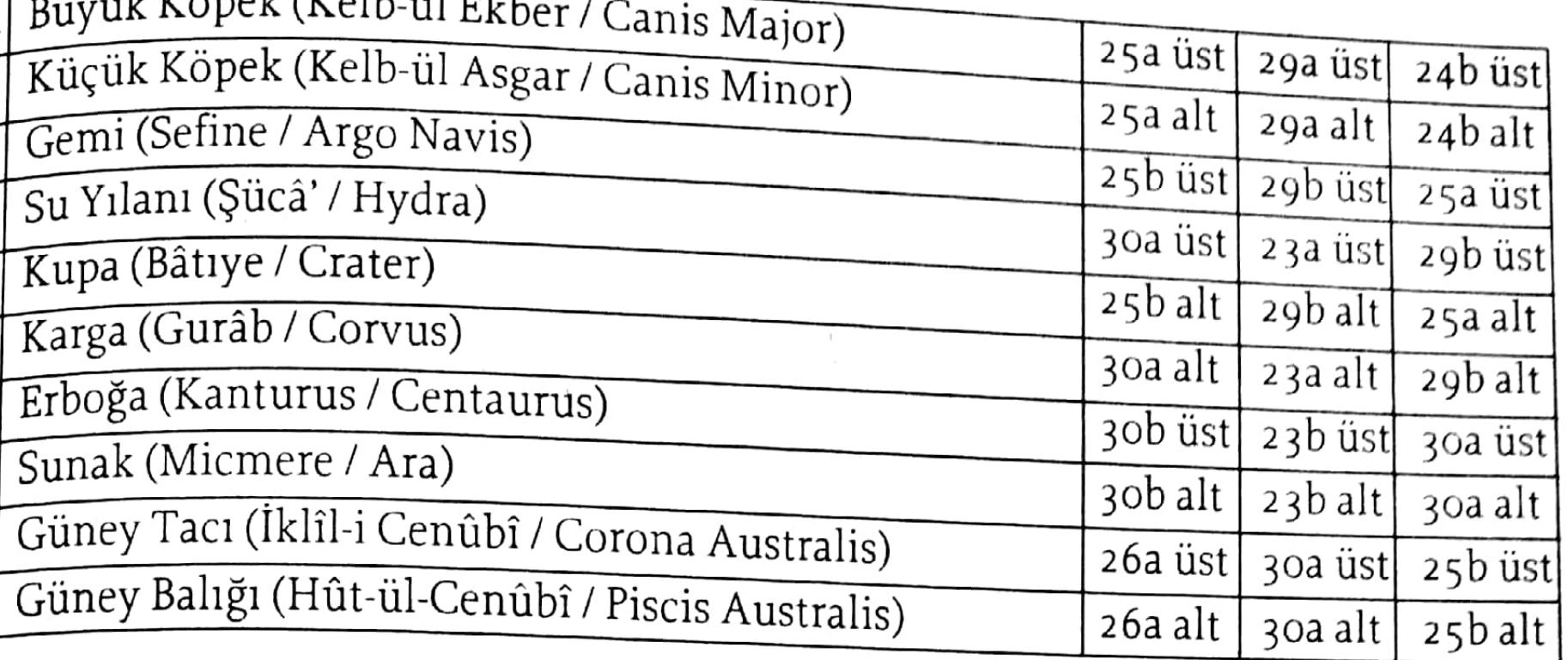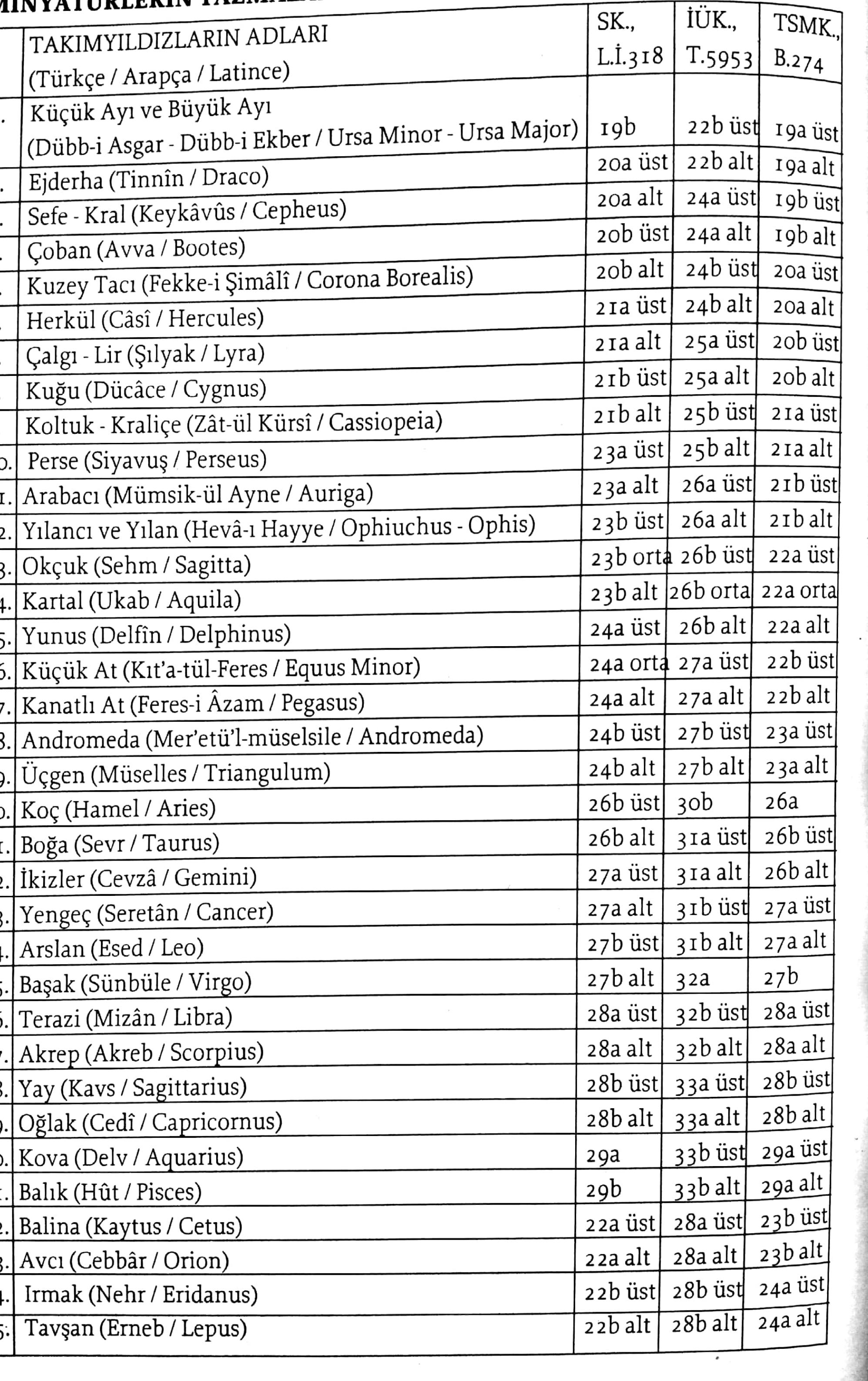 This paper revises miniatures of Tercüme-i Ikd al-Jumân fî Tarihi Ahl al-Zaman, a manuscript on world history by Imam Kadi Mahmud ibn Ahmed ibn Musa ibn Ahmed ibn Hüseyin ibn Yusuf ibn Mahmud Bedreddin al-Aynî of Antep, known as Imam Aynî. This manuscript desribes the events of history from the time of Adam up to the writer’s own time in the 15th century, and the first section of the first volume is about astronomy. This manuscript has three illustrated copies in three different libraries; İstanbul University Library (T.5953), Süleymaniye Library (Lala İsmail 318) and Topkapi Saray Museum Library (B.274) which were translated into Turkish at the first half of the 18th century. Scribes wrote introduction giving information about the author and his book, correcting some mistakes by Aynî on the subject of astronomy, and making some additions. Each copy has 45 miniature paintings depicting the fixed stars and zodiacal constellations. These illustrations were intended to give readers a better understanding of the astronomical subjects discussed by Bedreddin Aynî. In the brief explanations at the top of each of the miniatures, scribes give the name of each constellation and, with the exception of the zodiacal constellations, the number of stars they contain. The positions of the stars are marked on the miniatures.