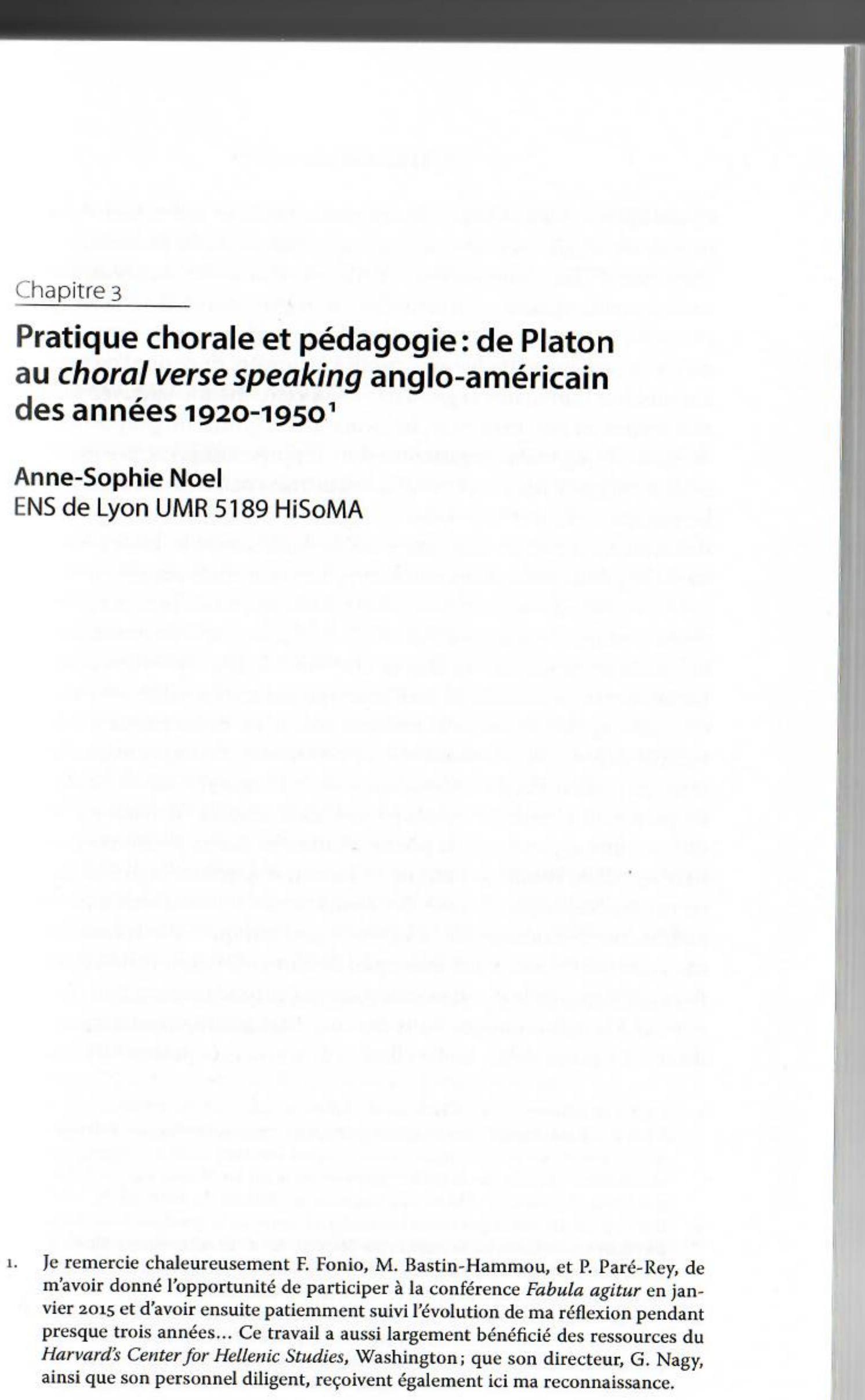 Noel A.-S., “Pratique chorale et pédagogie : de Platon au choral verse speaking des années 1920-1950,” in F. Fonio, M. Hammou-Bastin, P. Rey (eds), Fabula agitur! Pratiques théâtrales et artistiques, oralite et apprentissage des langues et cultures de l’Antiquité, ELLUG, Grenoble, 2019, p. 67-84. Ce chapitre pose la questions des pratiques chorales et des vertus tant pédagogiques que politiqu... more Ce chapitre pose la questions des pratiques chorales et des vertus tant pédagogiques que politiques qui leur sont attribuées, à partir de l'étude de textes anciens (notamment les écrits de Platon sur la choreia) et de la pratique modern du "choral-verse speaking", mouvement aux formes multiples qui s'est développé en Europe et aux États-Unis dans l'entre-deux-guerres. Cette pratique de chœur parlée, librement inspirée du chœur antique, connut un succès d'ampleur internationale en se présentant comme un moyen d'apprentissage linguistique et poétique privilégié en même temps qu'un exercice en acte des valeurs démocratiques.