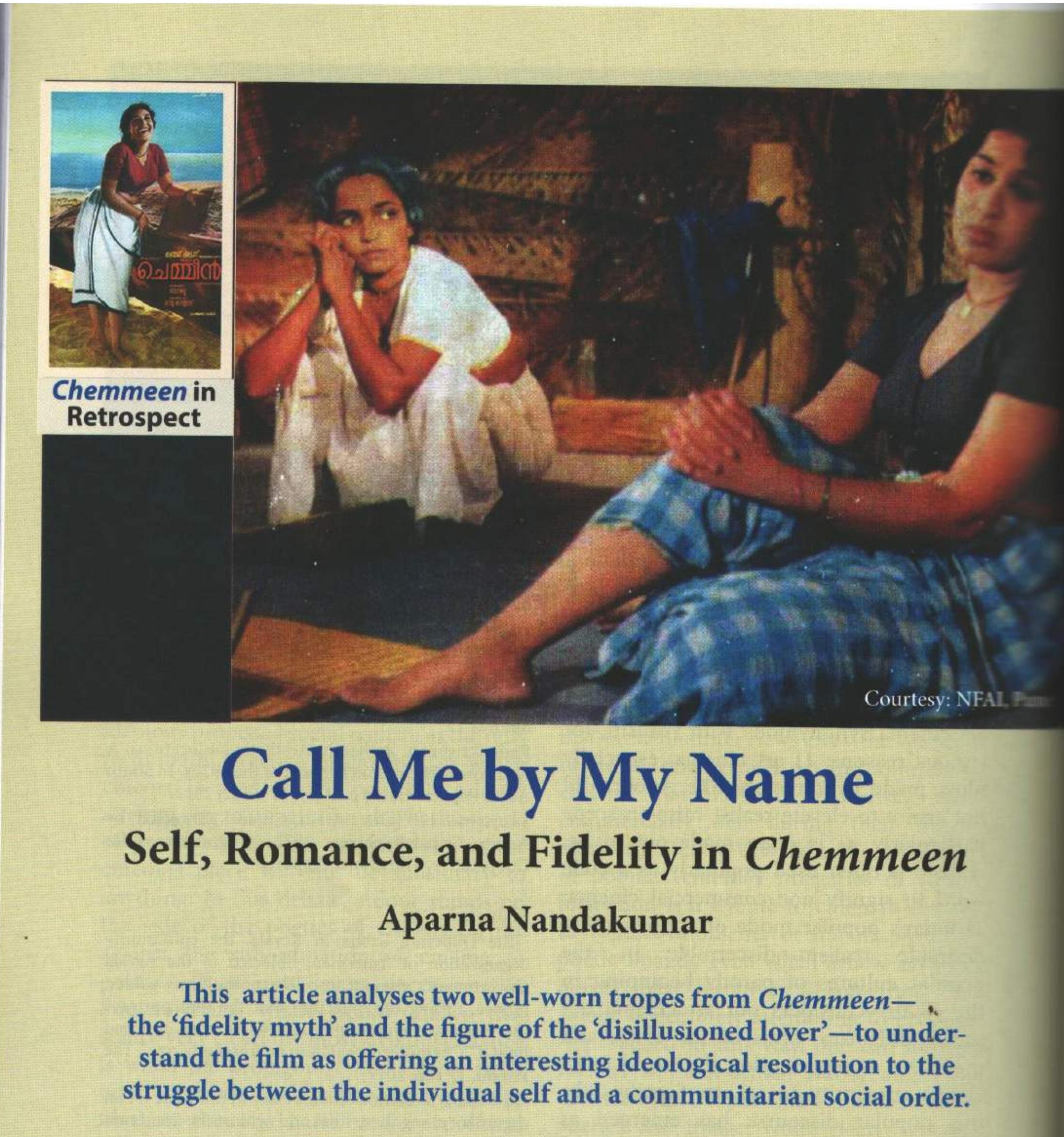 In this paper, I attempt to analyse two well-worn tropes from the Malayalam film Chemmeen (Prawns... more In this paper, I attempt to analyse two well-worn tropes from the Malayalam film Chemmeen (Prawns, directed by Ramu Karyat, 1965)—the ‘fidelity myth’ of the fisher community around which the narrative revolves, and the figure of the ‘disillusioned lover’ embodied by Pareekkutty, one of the film’s protagonists. The aim here is to understand the film as offering a new ideological resolution to the struggle between the individual self and a communitarian social order.