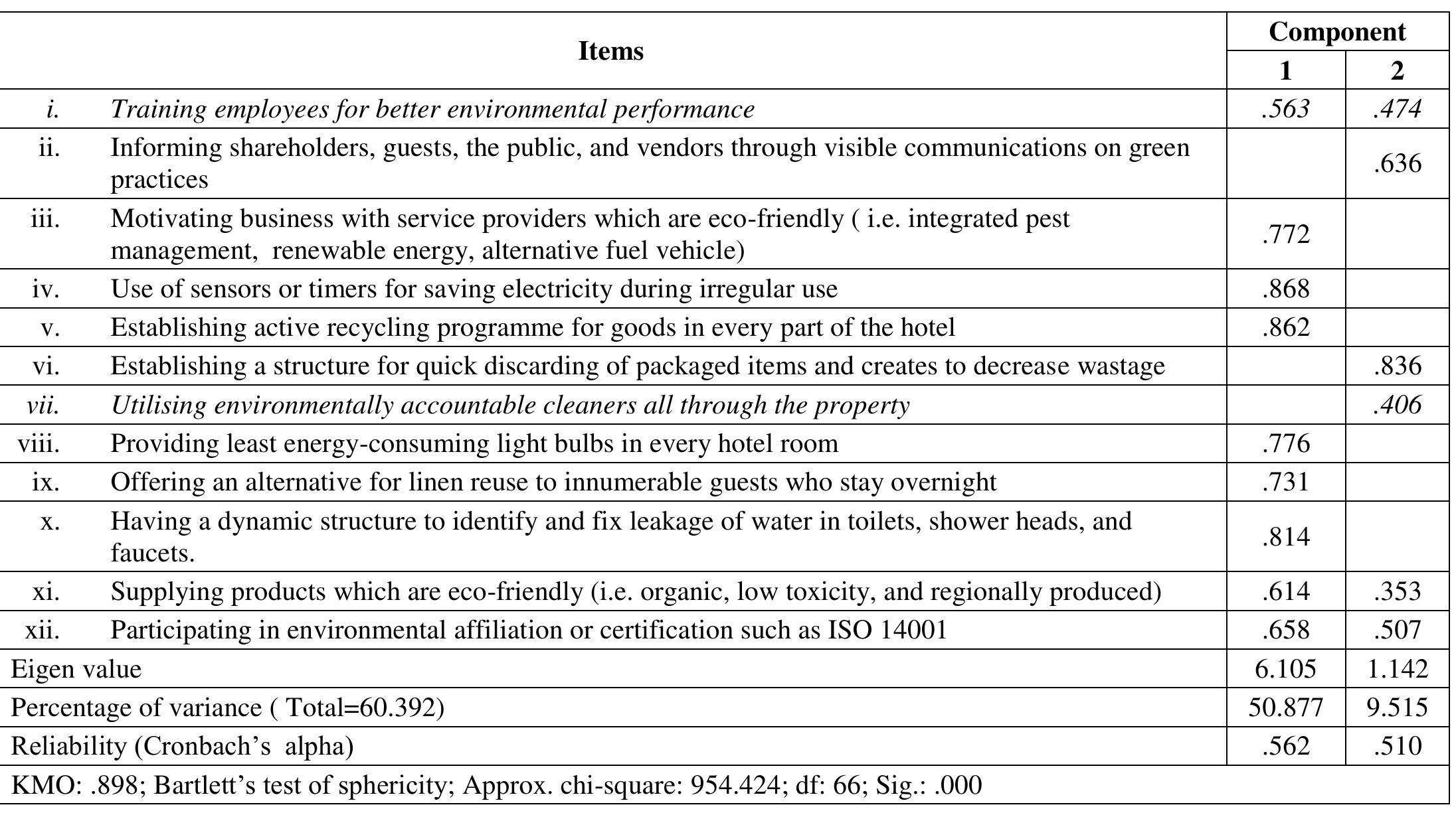 as lack of knowledge about eco-friendly products or services, ineffective advertising by corporates, and lack of uniformity in governmental norms and regulations. Therefore, the objective of this paper is to determine the perception of customers towards sustainable practices in star hotels through factor analysis approach. A sample of 147 customers from a variety of location including several star hotels of GHMC, airports, railway station, and difference events and educational fairs are collected. As a result, this study identifies six factors such as Desireness, trustworthy, favourites, morals, consciousness, initiatives, social welfare and