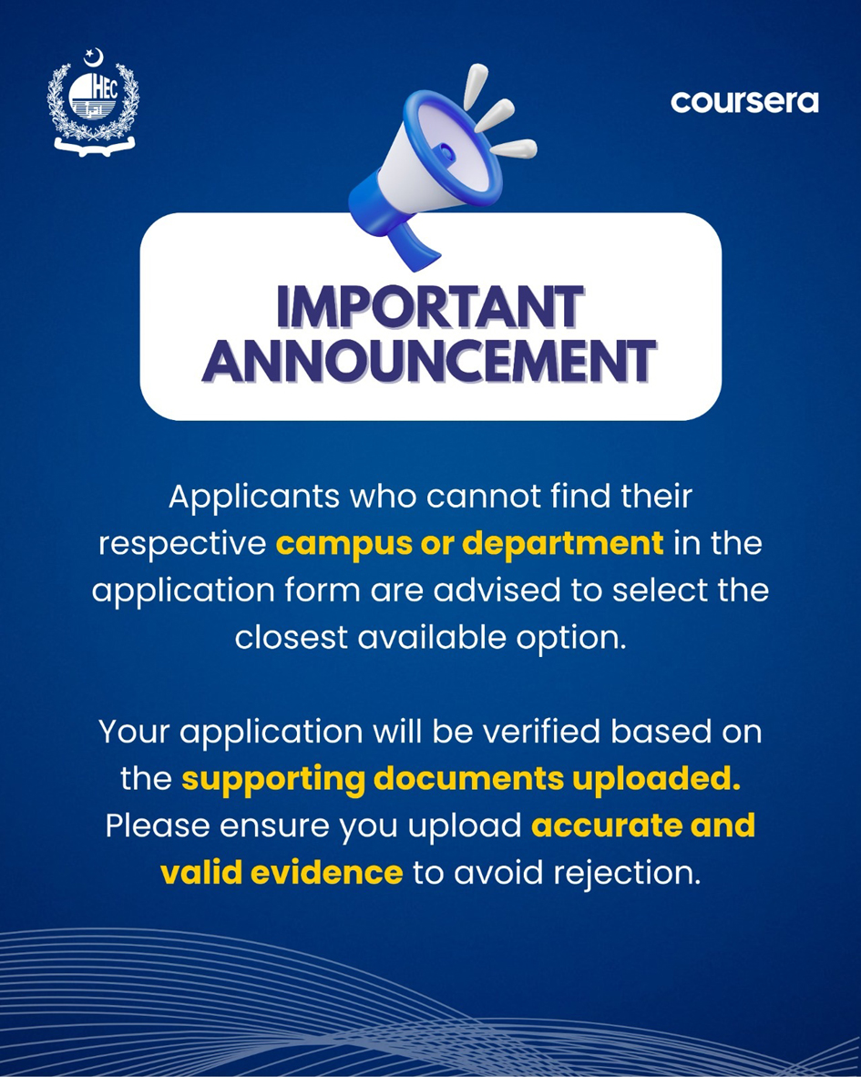 The Digital Learning & Skills Enrichment Initiative (DLSEI) is an initiative of the Higher Education Commission (HEC) Pakistan in partnership with Coursera. DLSEI intends to enhance online learning and skills development among passionate students. They will be able to access courses and certifications from top universities of the world and get an opportunity to enroll themselves in the highest-ranked and most expensive online courses. | |||||||||||||||||||||
