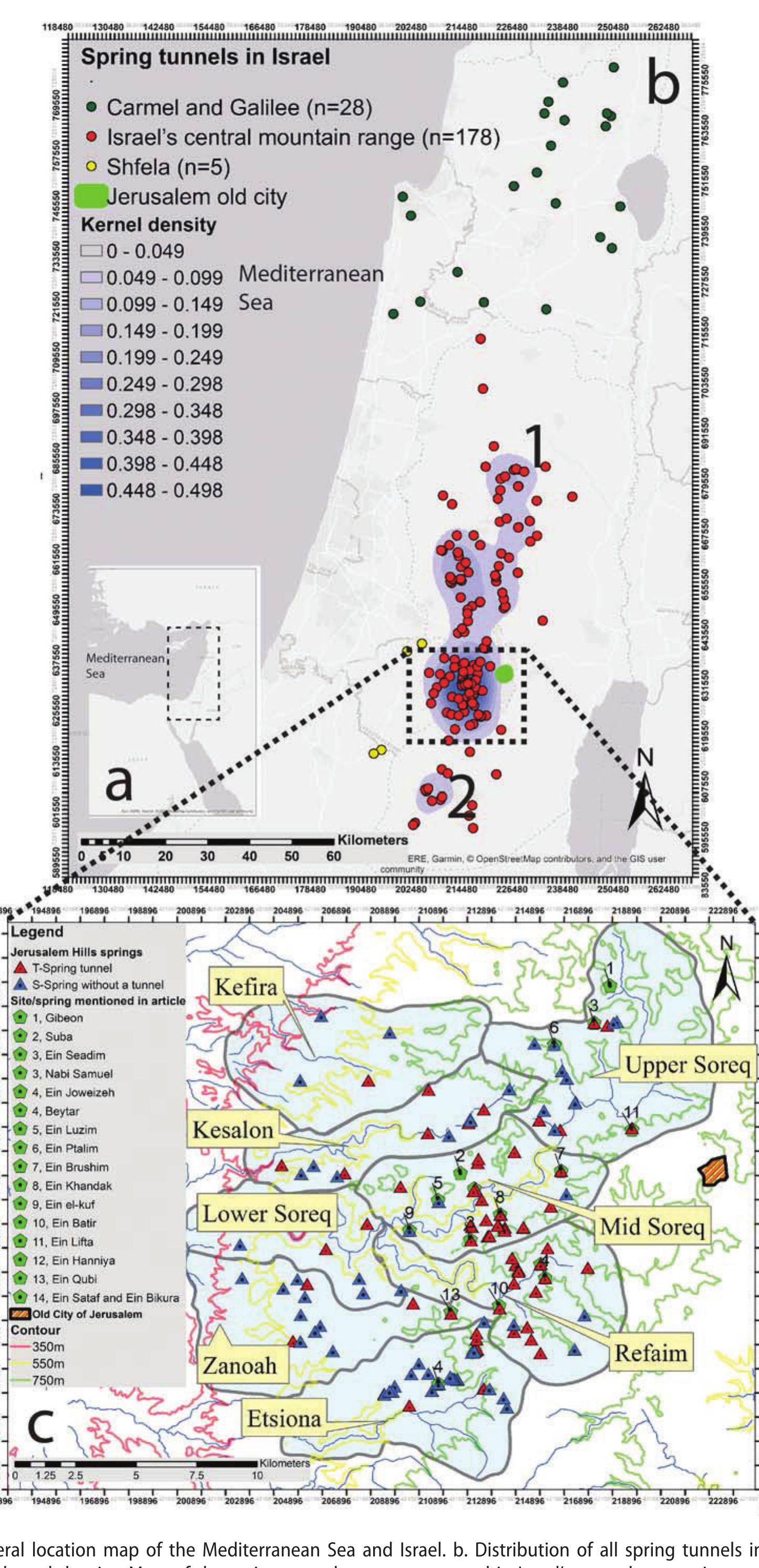 About 210 spring tunnels were developed in Israel, most of them within its central mountain range... more About 210 spring tunnels were developed in Israel, most of them within its central mountain range and especially in the Jerusalem Hills. This phenomenon probably first appeared in Israel during Iron Age II, around the 8th century BCE. Spring tunnels are associated with the development of irrigated agricultural systems, landscape design and the establishment of rural settlements. This study presents for the first time a comprehensive statistical picture of this phenomenon, with particularly emphasis on the Jerusalem Hills. We have analysed statistically 21 different parameters of two types of springs in the Jerusalem Hills: 70 with tunnels and 60 without tunnels. The selected parameters fall into three categories: (1) geological-geomorphological (formation, surface slope and group, dip); (2) physicalhydrological (precipitation, discharge, etc.); (3) spatial (dispersion, springs elevation ASL, etc.). The results of this study emphasise the spatial aspects of this phenomenon, especially the accessibility to the Old City of Jerusalem. In addition, there is a clear connection between the karstic aquifer overlying the Moza geological formation and the spring tunnels. This study highlights the physical advantages of Jerusalem's hinterland at the eastern sections of the Soreq and Refaim river basins, consistent with the rich archaeological record in these areas.