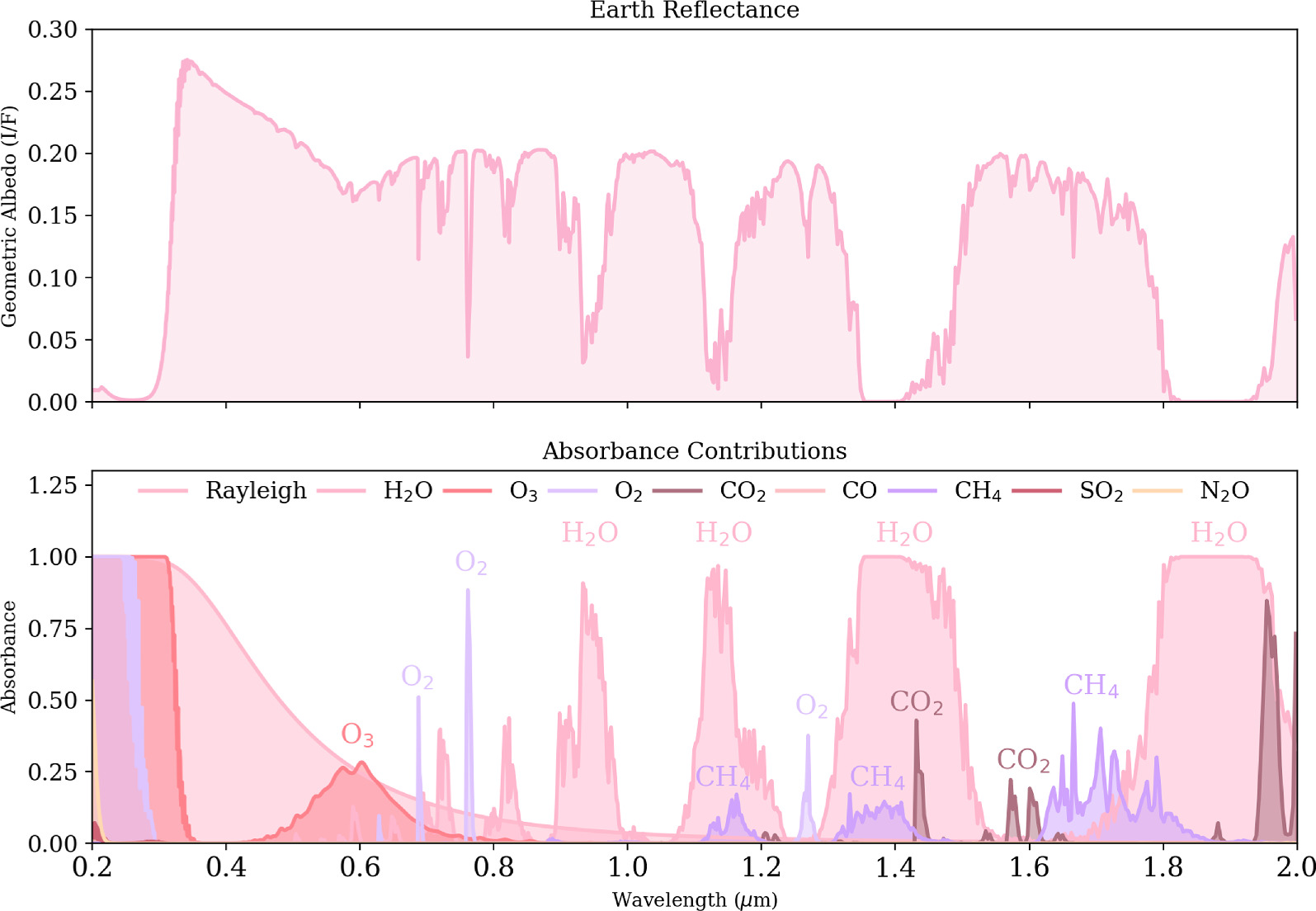 Figure 1. In the top panel, we present a representative spectrum from our work where molecular contributions are visible, with the y-axis representing the geometric albedo. In the bottom panel, we present the absorbance contributions of every molecule available in the KEN grids, as well as the Rayleigh scattering also included: H2O, O2, O3, CH4, CO, CO2, SO2, and N2O, with the y-axis representing absorption. The x-axes are both the full wavelength range of the KEN grids (0.2–2 μm). Note that SO2 and N2O absorb at 0.2 μm very minimally, without features in other locations in this wavelength range.