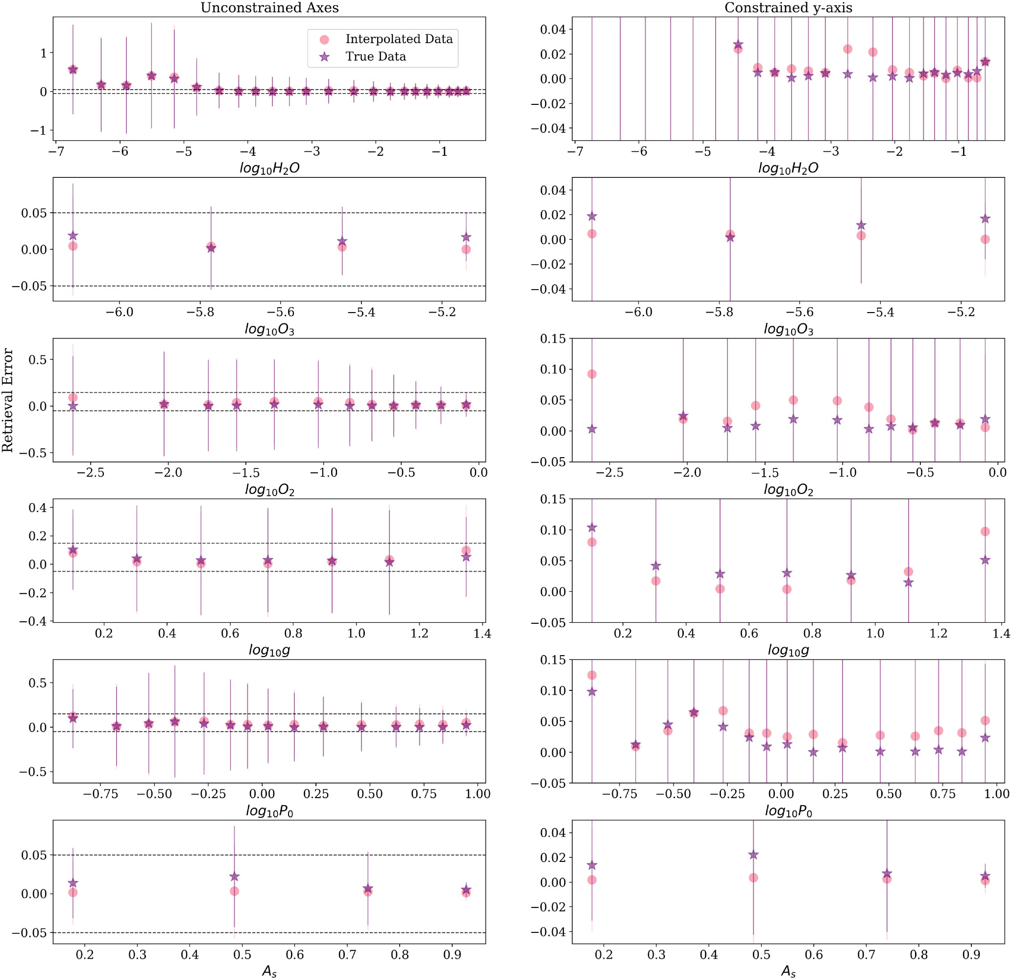 Figure 3. Interpolation error across a 6D retrieval across parameter space. The retrieval error is defined as the difference between the true and retrieved values. The pink dots represent retrievals performed on a spectrum interpolated from the KEN grid, and the purple stars represent retrievals performed on a PSG-calculated spectrum. The error bars on these points are drawn as the 68% credible regions. The left column shows the full y-axes, and the right column zooms in to the portion on the y-axes contained within the horizontal dashed black lines that cover the areas of lowest error.