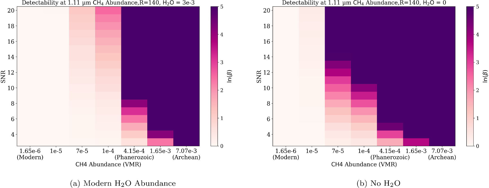 Standard image High-resolution imageLooking at the full range of abundance values in our study, we present a heat map showing detection strength as a function of SNR (y-axis) and CH4 abundance (x-axis) in Figure 6(a). The color bars represent the range of 0–5 lnB, between unconstrained and strong detection. We see here that CH4 is not strongly detectable until 4.15 × 10−4 (Phanerozoic), at which point an SNR of 9 is required. Moving to higher abundances significantly drops the required SNR for strong detection, with 1.65 × 10−3 (early Phanerozoic) requiring an SNR of 5 and 7.07 × 10−3 (Archean) detectable at all SNRs. At low abundances, such as a modern-Earth value of 1.65 × 10−6, CH4 is not detectable at any SNR. Interestingly, at 1 × 10−4 a weak detection is possible at an SNR of 20, with the next value of 4.15 × 10−4 only requiring an SNR of 9 for strong detection as mentioned, and an SNR of 6 for weak detection. This results in a very drastic change in CH4 detection over a relatively small change in abundance of CH4.
