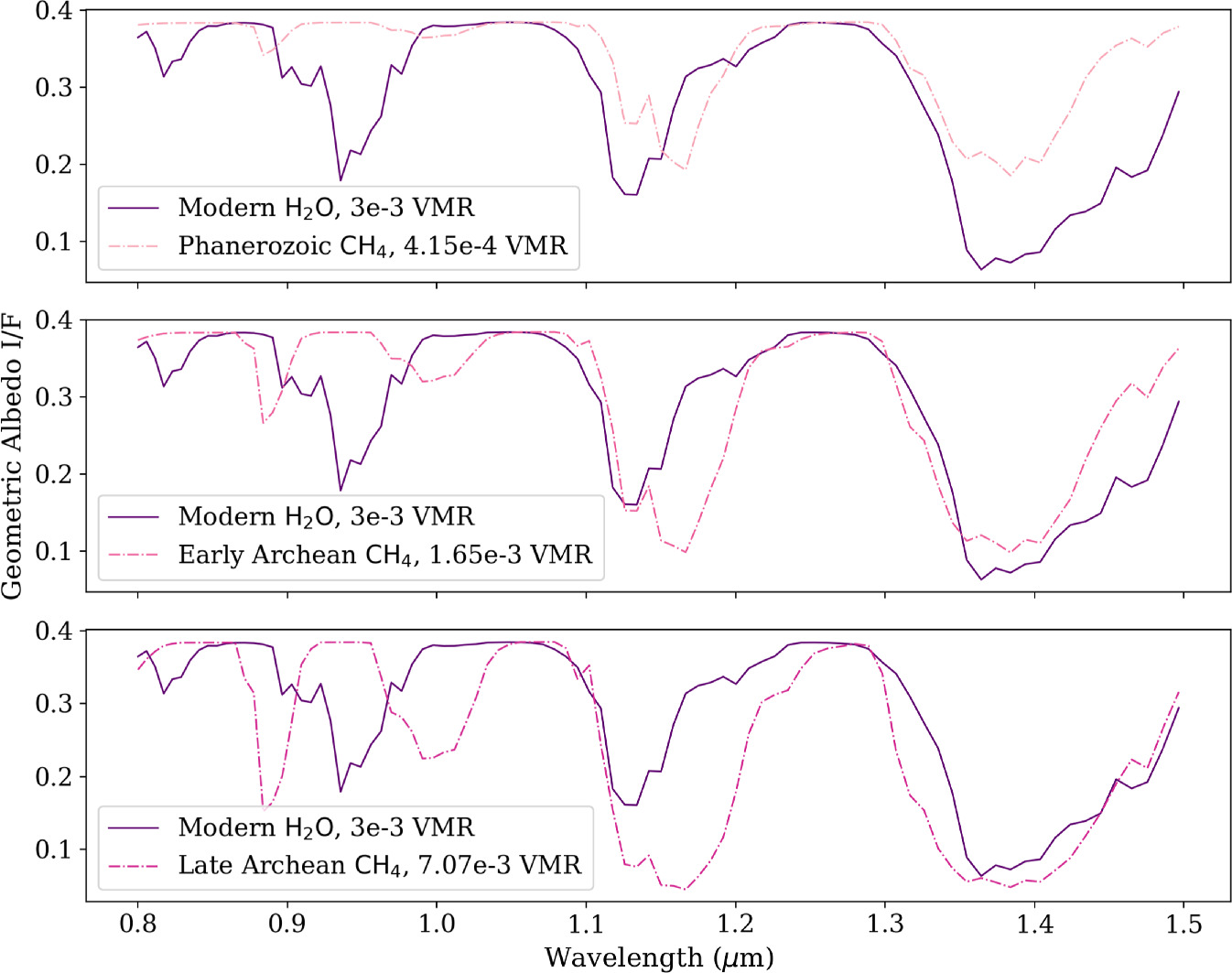 Figure 7. Multipanel plot illustrating overlap of H2O and CH4 features in the NIR wavelength regime. Wavelength is on the x-axis, geometric albedo (I/F) is on the y-axis. Each panel shows a modern level of H2O in dark purple, and a Phanerozoic, early Archean, and late-Archean abundances of CH4 in the top, middle, and bottom panels with a dotted–dashed line with a shade of pink, respectively.