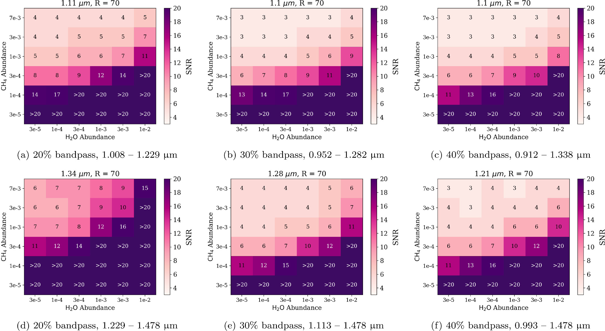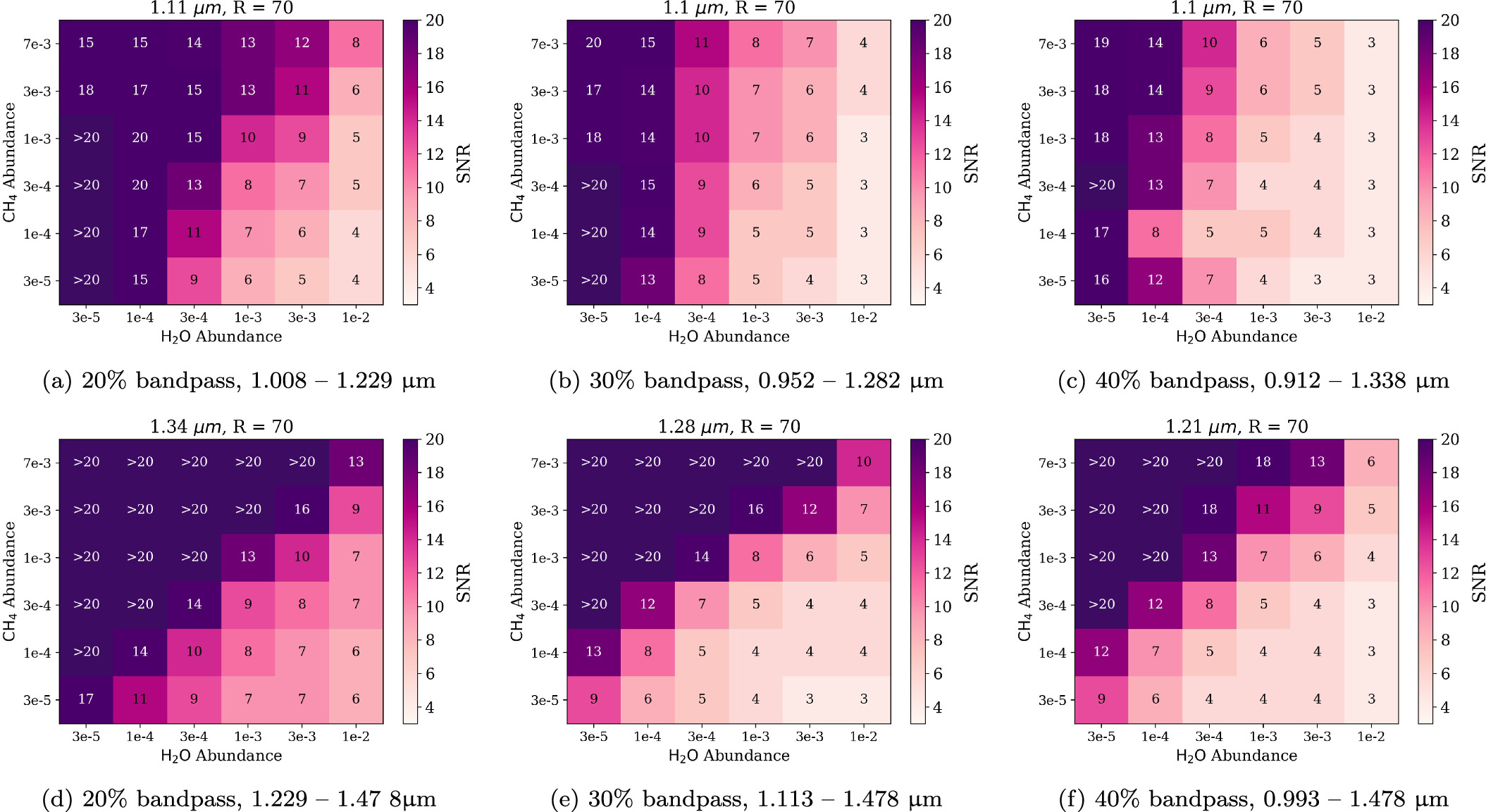 Figure 8. SNRs for strong CH4 detection. Heat maps of CH4 detectability as a function of molecular abundance for R = 70, at 1.11 μm (top row) and centered on the 1.3 μm feature (bottom row). We present 20%, 30%, and 40% bandpass widths. y-axis: CH4 abundance, x-axis: H2O abundance, and heat: SNR. Required SNRs for strong detection are written on the associated block, unless there is no strong detection, thus labeled “>20.”