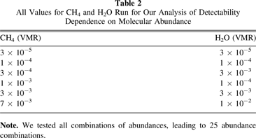 Table 2. All Values for CH4 and H2O Run for Our Analysis of Detectability Dependence on Molecular Abundance