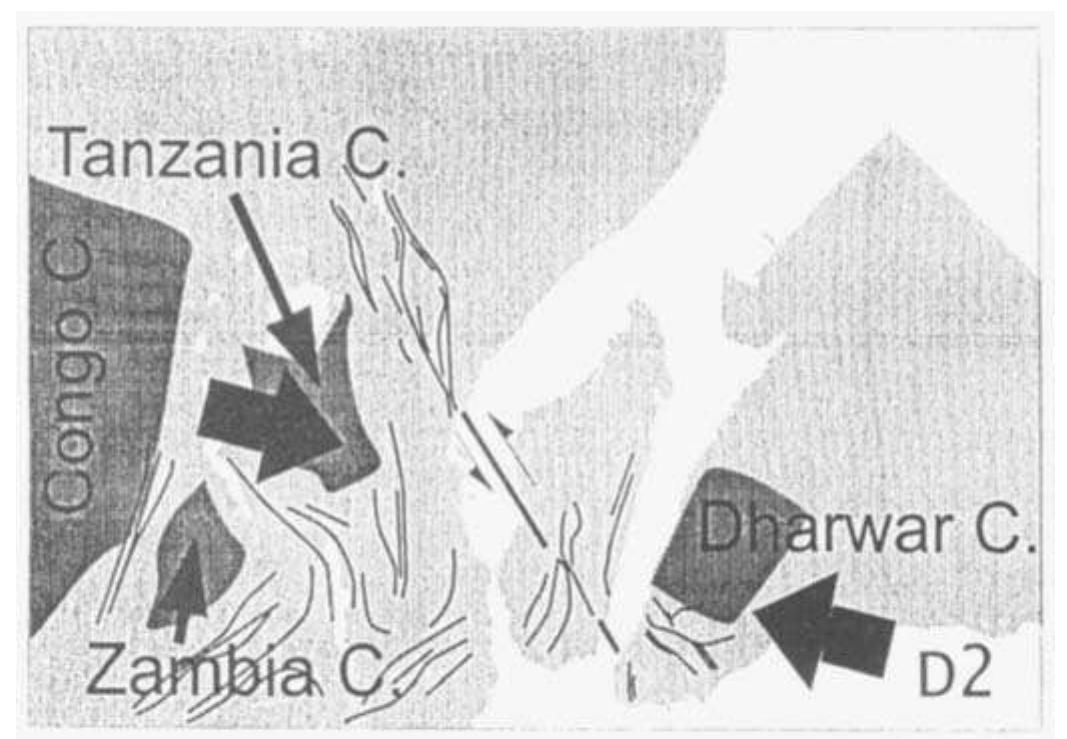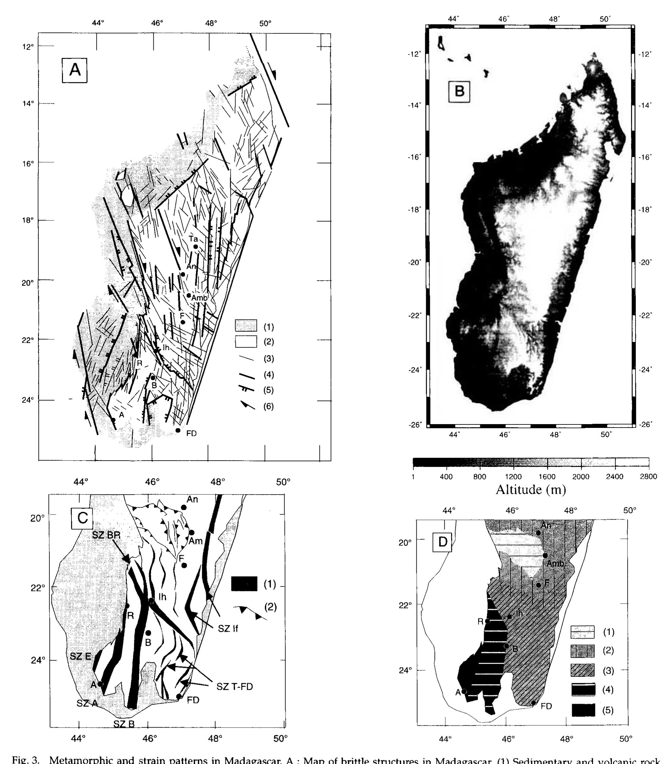 This paper examines the thermo-mechanical evolution of the lower crust, in Precambrian times, wit... more This paper examines the thermo-mechanical evolution of the lower crust, in Precambrian times, with an example from southern Madagascar. The finite strain pattern is derived from the study of satellite images complemented by field structural analysis. The finite geometry reflects the superposition of two distinct finite strain patterns, D1 and D2. The geodynamic significance of the D1 event remains unclear. However, the D2 finite strain pattern is partitioned between a network of kilometric vertical shear zones and folded domains, and is consistent in the Mozambique belt with east-west shortening in a transpressive regime.The metamorphic conditions associated with the two finite strain fields show that rather uniform, high temperatures were ubiquitous in southern Madagascar. By contrast, regional pressure differences were controlled primarily by the major shear zones (D2). Chronological constraints obtained from monazite (U-Th-Pb electron microprobe dating) indicate ages of 590 -530 Ma for the D1 event and 530-500 Ma for the D2 event. The two distinct strain fields D1 and D2 are continuous in time.The late pan-African transpressional tectonic regimes, contemporaneous with granulitic facies metamorphic conditions, resulted in strong strain partitioning between shear zones and folded domains. The D2 transpression was efficient and pervasive enough to exhume pieces of the lower crust. The amount of exhumation was controlled by the D2 strain gradient (amount of pure shear with respect to simple shear).