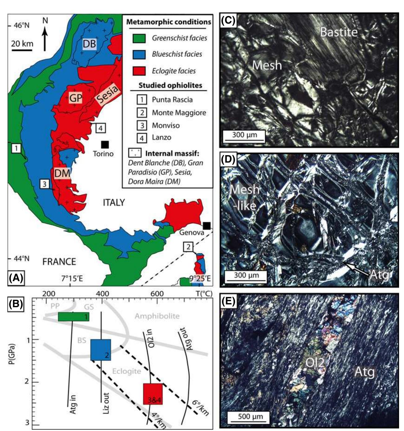 Serpentine minerals in natural samples are dominated by lizardite and antigorite. In spite of num... more Serpentine minerals in natural samples are dominated by lizardite and antigorite. In spite of numerous laboratory experiments, the stability fields of these species remain poorly constrained. This paper presents petrological observations and the Raman spectroscopy and XRD analyses of natural serpentinites from the Alpine paleo-accretionary wedge. Serpentine varieties were identified from a range of metamorphic pressure and temperature conditions from sub-greenschist (P b 4 kbar, T~200-300°C) to eclogite facies conditions (P > 20 kbar, T > 460°C) along a subduction geothermal gradient. We use the observed mineral assemblage in natural serpentinite along with the T max estimated by Raman spectroscopy of the carbonaceous matter in associated metasediments to constrain the temperature of the lizardite to antigorite transition at high pressures. We show that below 300°C, lizardite and locally chrysotile are the dominant species in the mesh texture. Between 320 and 390°C, lizardite is progressively replaced by antigorite at the grain boundaries through dissolution-precipitation processes in the presence of SiO 2 enriched fluids and in the cores of the lizardite mesh. Above 390°C, under high-grade blueschist to eclogite facies conditions, antigorite is the sole stable serpentine mineral until the onset of secondary olivine crystallization at 460°C.