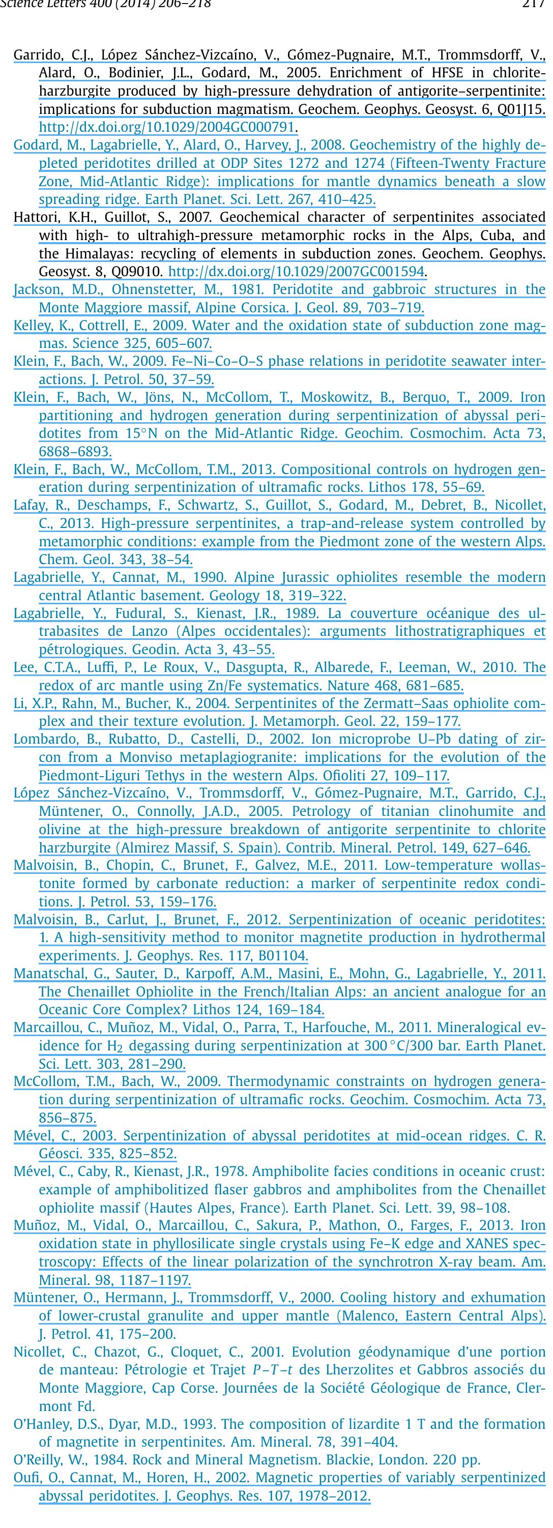 Serpentinites are an important component of the oceanic lithosphere that formed at slow to ultra-... more Serpentinites are an important component of the oceanic lithosphere that formed at slow to ultra-slow spreading centers. Serpentine could thus be one of the most abundant hydrous minerals recycled into the mantle in subduction zones. Prograde metamorphism in subducted serpentinites is characterized by the destabilization of lizardite into antigorite, and then into secondary olivine. The nature of the fluid released during these phase transitions is controlled by redox reactions and can be inferred from oxidation state of Fe in serpentine minerals. We used bulk rock analyses, magnetic measurements, SEM observations and μXANES spectroscopy to establish the evolution of Fe 2 O 3 Tot (BR) and magnetite content in serpentinite and Fe oxidation state in serpentine minerals from ridge to subduction settings. At mid-ocean ridges, during the alteration of peridotite into serpentinite, iron is mainly redistributed between magnetite and oceanic serpentine (usually lizardite). The Fe 3+ /Fe Total ratio in lizardite and the modal percentage of magnetite progressively increase with the degree of local serpentinization to maxima of about 0.8 and 7 wt%, respectively, in fully serpentinized peridotites. During subduction, the Fe 2 O 3 Tot (BR) of serpentinite remains constant (∼7-10 wt%, depending on the initial Fe content of the peridotite) while the modal percentage of magnetite decreases to less than 2% in eclogite facies rocks. The Fe 3+ /Fe Total ratio in serpentine also decreases down to 0.2-0.4 in antigorite at eclogite facies. Our results show that, in the first 70 km of subduction, the transition from lizardite to antigorite is accompanied by a reduction of Fe in bulk rock samples and in serpentine minerals. This redox reaction might be coupled with the oxidation of reduced oceanic phases such as sulfides, and the formation of oxidized fluids (e.g. SO X , H 2 O, CO X ). At greater depths, the beginning of antigorite dehydration leads to an increase of Fe 3+ /Fe Total in relict antigorite, in agreement with the preferential partitioning of ferric iron into serpentine rather than into olivine.