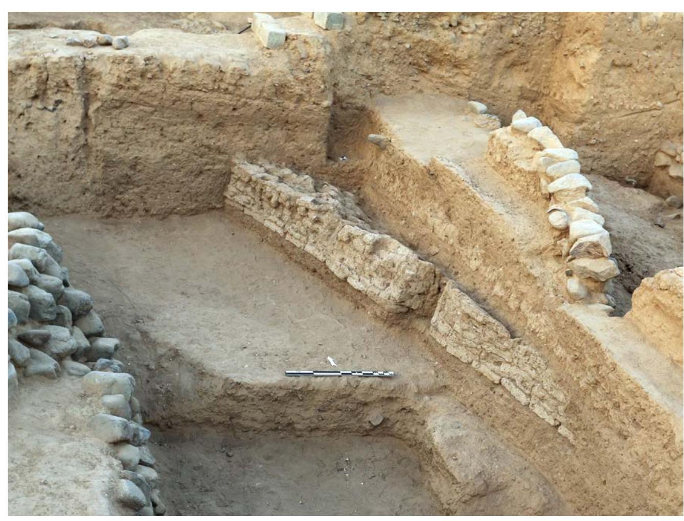 The ongoing fieldwork at Kalba (K4) in the Gulf of Oman focused on the area outside the Early Bronze Age ditch construction and its subsequent use in the later Bronze Age and Iron Age periods. Our previous investigations have exposed a mud-brick wall section in the lower eastern profile of the trench whose function and specific dating were unclear. The excavated superimposed architectural remains in this area indicate that approximately the same spatial dimensions of the sites' central part were continuously enclosed.