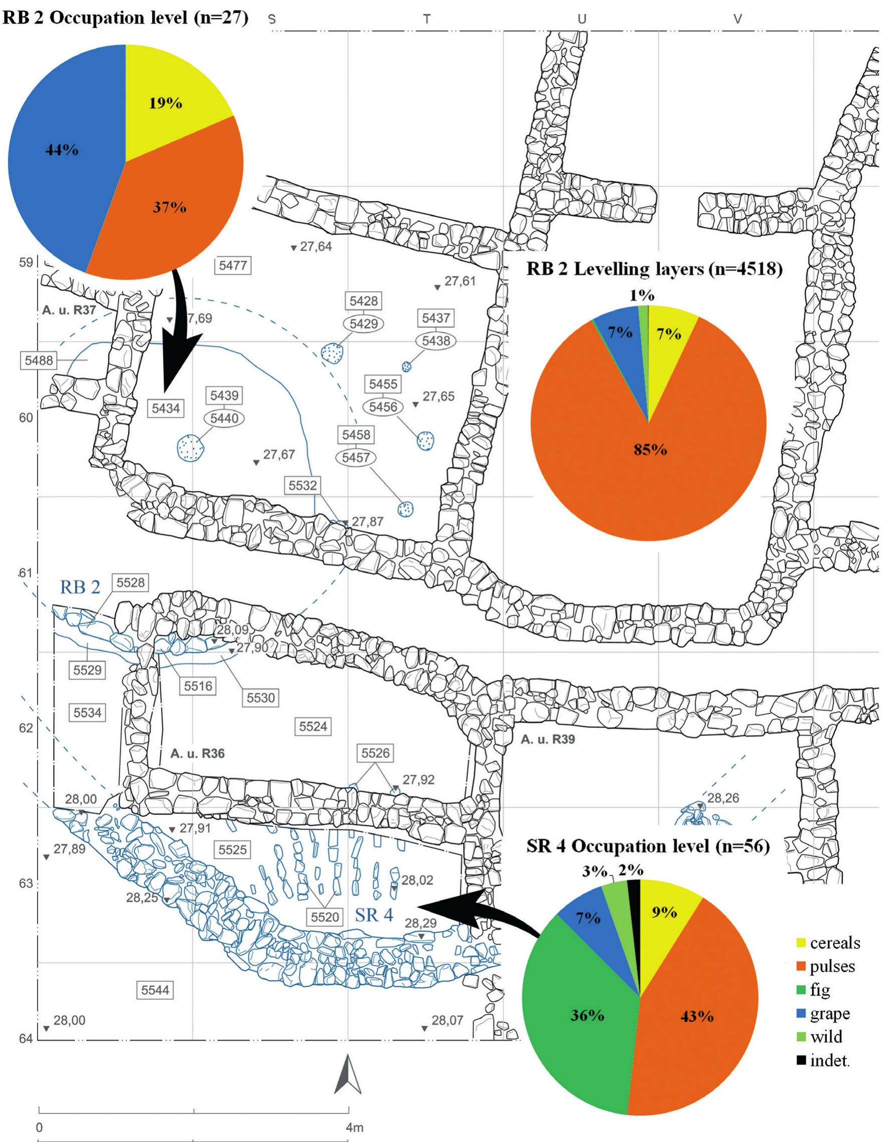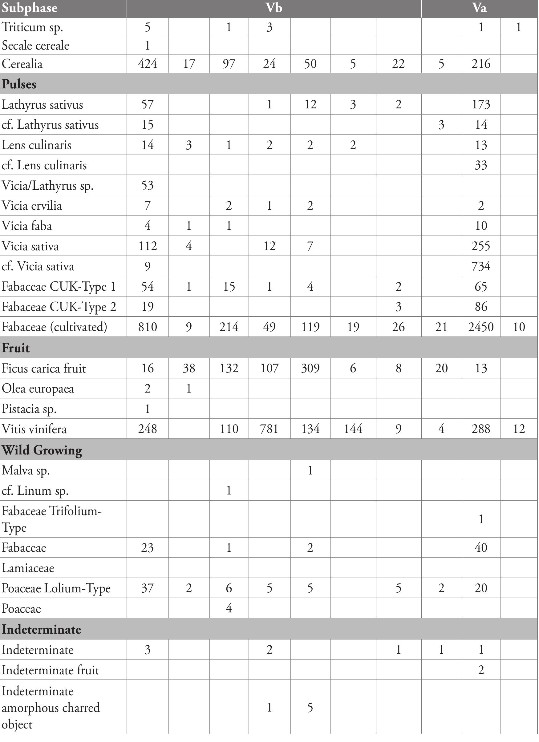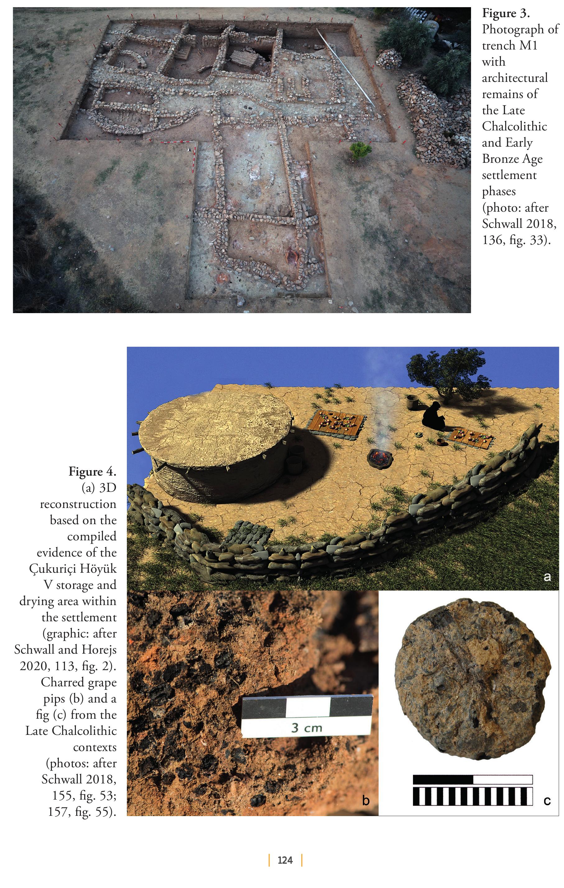The excavations of the Late Chalcolithic settlement phases at Çukuriçi Höyük produced important data on storage facilities and food processing activities. This paper focuses on the botanical remains to reveal detailed information on the inhabitant’s subsistence strategies. Since the settlements of the Late Chalcolithic in 4th millennium BC and the initial Early Bronze Age 1 dating around 3000 cal. BCE were destroyed by fire, the assemblage offers ideal conditions for archaeobotanical studies. The analyses show that cereals, pulses, figs, and grapes are dominating and can be associated with food processing and storage installations. For Late Chalcolithic Çukuriçi Höyük the results indicate a coastal community based on a well-scheduled subsistence strategy with intentional surplus production and storage of food. Moreover, the high number of fruits indicate that so called “cash crops”—targeted overproduction of food—may have already played an economic role in the Late Chalcolithic as exchange goods.