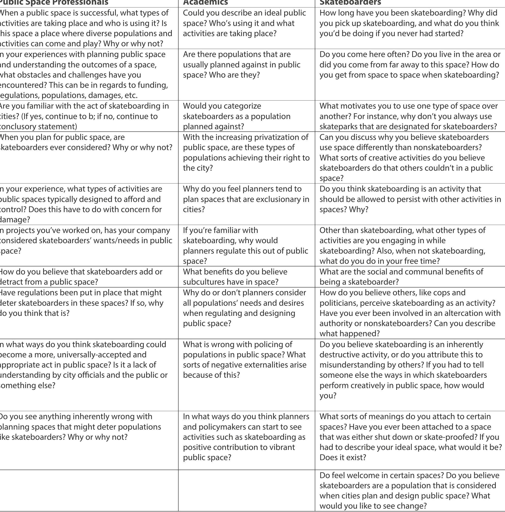Today, street skateboarding has transformed from a subcultural pursuit to a mainstream urban ende... more Today, street skateboarding has transformed from a subcultural pursuit to a mainstream urban endeavor, as more than 50 million people partake in the activity globally. Cities respond to skateboarders’ spatial movements by imposing contradictory legal prescriptions and physical design barriers in public and private spaces. The point of departure for this thesis is that planning reactions provide subpar public skate spaces while imposing regulations that ban/stigmatize skateboarding outside of these sanctioned skate spots. A sizable population is denied their full right to the city, proscribed from partaking in the everyday organicism of democratic spatial experience and life. These exclusionary planning/design practices/regulations warranted further investigation. The purpose of this research was to undertake an ethno-geographic inquiry into skateboarders’ performances and transgressions in two public skateparks and two privately-owned plazas in Los Angeles, CA. My research questions were: What can planners learn from a ethno-geographic analysis of a subculture in space? Are current planning practices and engagement strategies allowing skateboarders to have citizen control and dictate how spaces are designed in order to provide quality, designated skate/recreational facilities? What planning tools and policies can provide multi-use, just spaces that celebrate diverse, cultural consumption and the social production of space? I conducted mixed methods research (i.e., field observations, interviews, photography, behavior mapping) following an actor-network theory (ANT) framework, rejecting the separation of humans/nonhumans, embracing materiality, and seeing space as a heterogeneous assemblage of constituent fluid realities/forms. I analyzed my findings through Lefebvre’s trialectic conceptualization of space. Skateboarders’ artistic spatial performances provide spectacles, reinterpret the functionality of objects, and transgress planned regulatory/physical boundaries. Ubiquitous handrails, stairs, and ledges as well as challenges posed by exclusionary spaces motivate skaters to blur traditional binaries of appropriate/inappropriate users in public/private spaces. Motivated by Sandercock’s (2004) challenge for more imaginative planning and Beauregard’s (2003) call to incorporate diverse storytelling and discursive democracy to build bases for collective planning action, I encourage planners to expand their politics, be creatively audacious, and adopt therapeutic tools for planning in 21st-century cities. I recommend one strategic occupation tactic for skateboarders to performatively represent themselves and engender planning responses. Using traditional planning tools (i.e., zoning incentives, engagement workshops, programming), I recommend four policies for cities to plan, design, and celebrate equitable, vibrant spaces where diverse publics can produce social space, create spectacles for cultural consumption, and represent themselves as legitimate actors in everyday urban life.