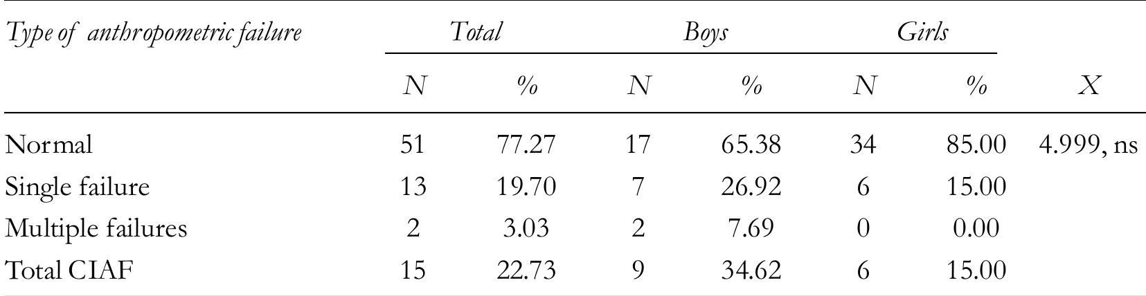 Background: Assessment of the overall nutritional status among children by CIAF is an important t... more Background: Assessment of the overall nutritional status among children by CIAF is an important technique. For achieving the goal of sustainable development, CIAF stands concrete evidence of the real picture of undernutrition. Objectives: The objective of the present study is to determine the total anthropometric failure among Juang children and adolescents. Material and Methods: The present cross-sectional study was carried out among 237 (106 male and 131 female) Juang children and adolescents aged 1 to 17 years. Results: The prevalence of Underweight, Stunting and Underweight children are 5.91%, 6.33% and 4.22% respectively; and other combined anthropometric failures of Stunting and Underweight; Wasting and Underweight; and Underweight, Stunting and Wasting are 2.95%, 16.46% and 16.03% respectively. Conclusion: In the present study, the overall anthropometric failure is a very serious condition. Immediate intervention programmes based on food, and correct health awareness among parents may help to achieve the SDG goals for zero hunger.