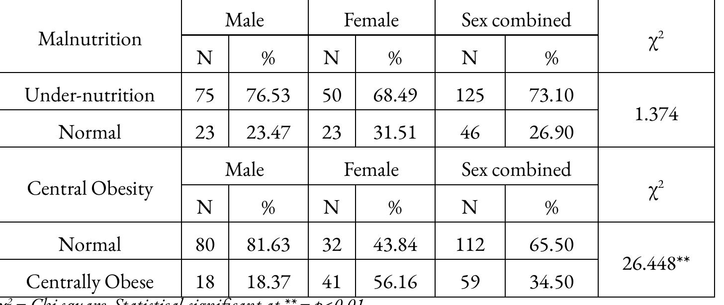 Assessment of the nutritional status is a major public health concern in India. Thinness (low BMI... more Assessment of the nutritional status is a major public health concern in India. Thinness (low BMI-forage) is an important anthropometric measure of undernutrition. In the present scenario, tribal children were facing undernutrition due to lack of income, inadequate food intake, and suffering with various diseases. The objectives of the present study were to determine age groups and sex specific prevalence of thinness among children and adolescents of the Juang tribe of Keonjhar district in Odisha, India. The present cross-sectional study was carried out among 237 (106 male and 131 female) Juang children and adolescents aged 1-17 years. The prevalence of thinness was assessed by using proposed age-sex specific international reference. We used standard statistical technique for comparing the BMI-forage z-score (BMIZ) means across the educational categories. The overall prevalence among the studied children was 15.61% and educational category wise prevalence of thinness among preschool, school going children, and adolescents were 11.94%, 19.05% and 15.12% respectively. Present scenarios of nutritional health status among Juang children and adolescents have