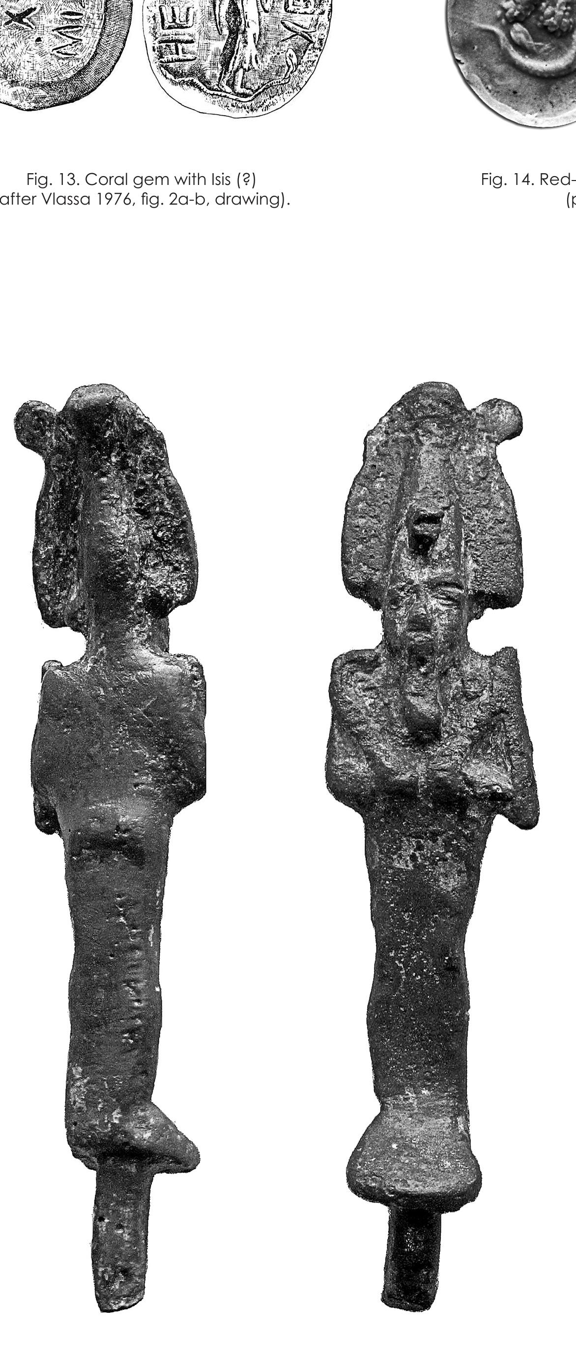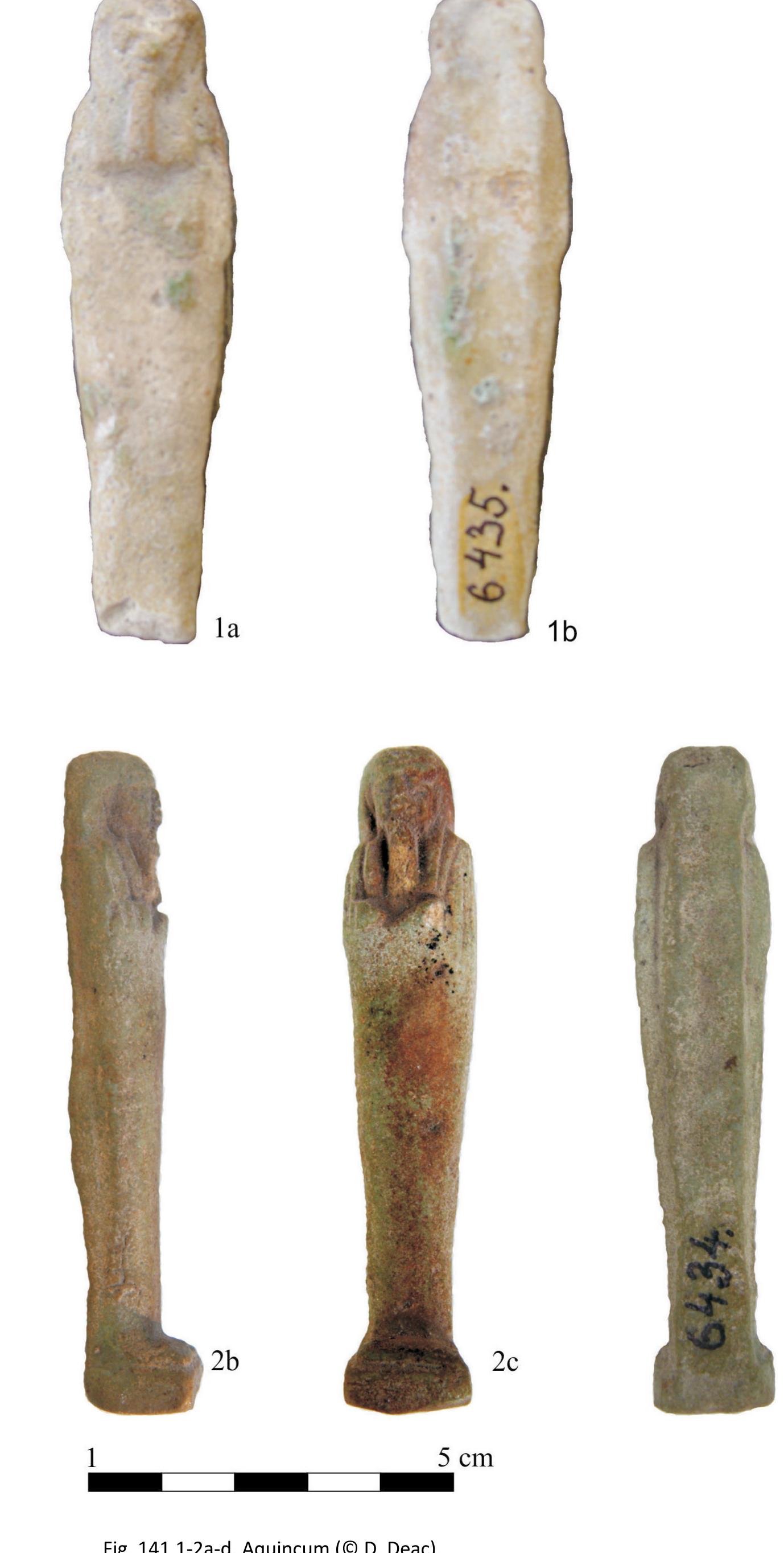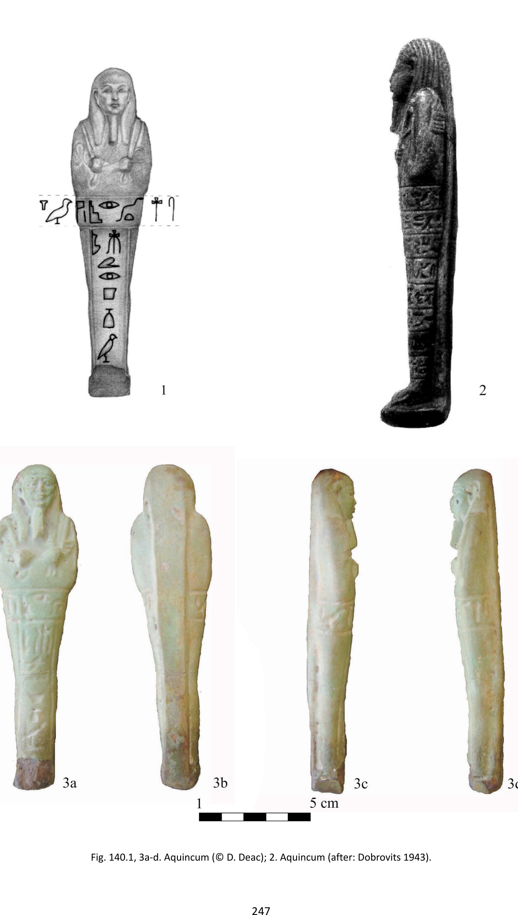 În perioada greco-romană acestea de regulă nu mai sunt inscripționate și sunt produse în număr mult mai redus, mai ales în zona centrelor cultice dedicate Isidei sau lui Osiris. Această statuetă reprezintă prima descoperire de acest fel făcută cu certitudine într-o așezare de pe teritoriul Daciei romane însă nu se poate afirma cu certitudine dacă a fost adusă dintr-un centru isiac puternic (ca suvenir) sau a fost produsă pe plan local, fiind o dovadă a unui cult al paredrei Isis-Osiris/ Sarapis în așezarea de la Tibiscum.