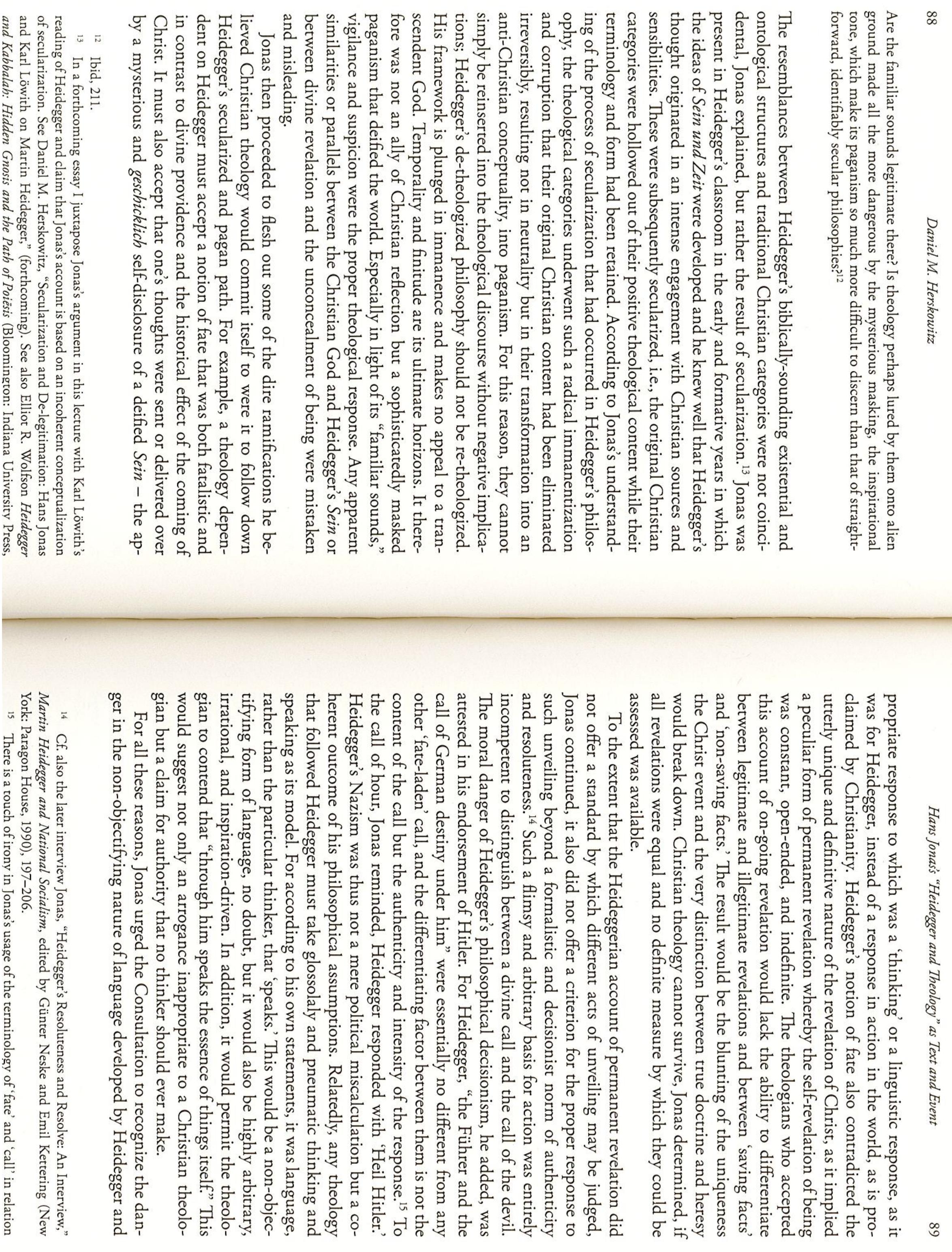 This study argues that the bond between ‘secularization’ and ‘de-legitimation’ is not only borne ... more This study argues that the bond between ‘secularization’ and ‘de-legitimation’ is not only borne out in debates over grand historical narratives relating to the status of modernity, as argued by Hans Blumenberg, but in debates over the appraisal of specific modern philosophical programs as well. It does this by examining how the category of ‘secularization' is used to delegitimize Martin Heidegger's thought, from both theological and secular perspectives, by two of his former students, Hans Jonas and Karl Löwith. By analysing their interpretation of Heidegger and their understanding of secularization, legitimacy, and the philosophy-theology relationship, this study sheds light on the intellectual projects of these three thinkers – master and two students – and demonstrates the application of secularization as a hermeneutical category of de-legitimization on the basis of ‘insufficiency’ – either insufficiently secular or insufficiently religious.