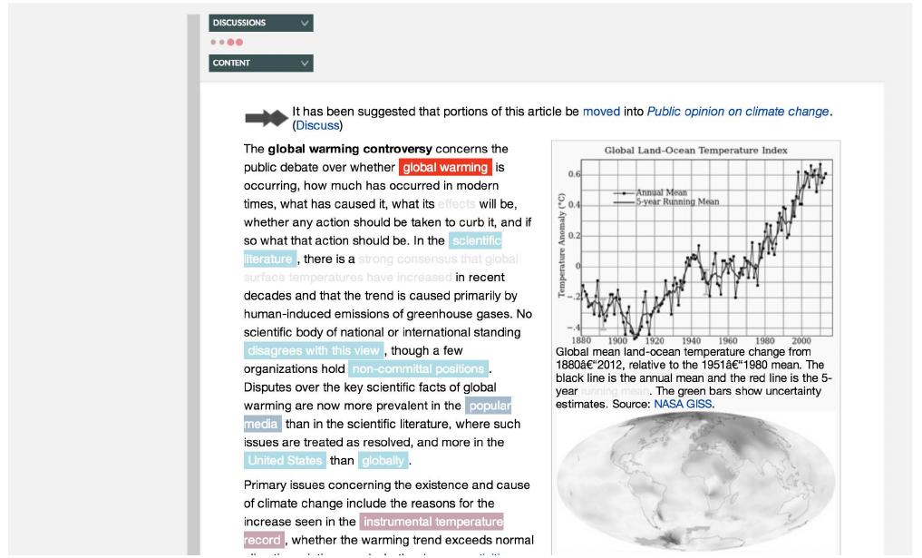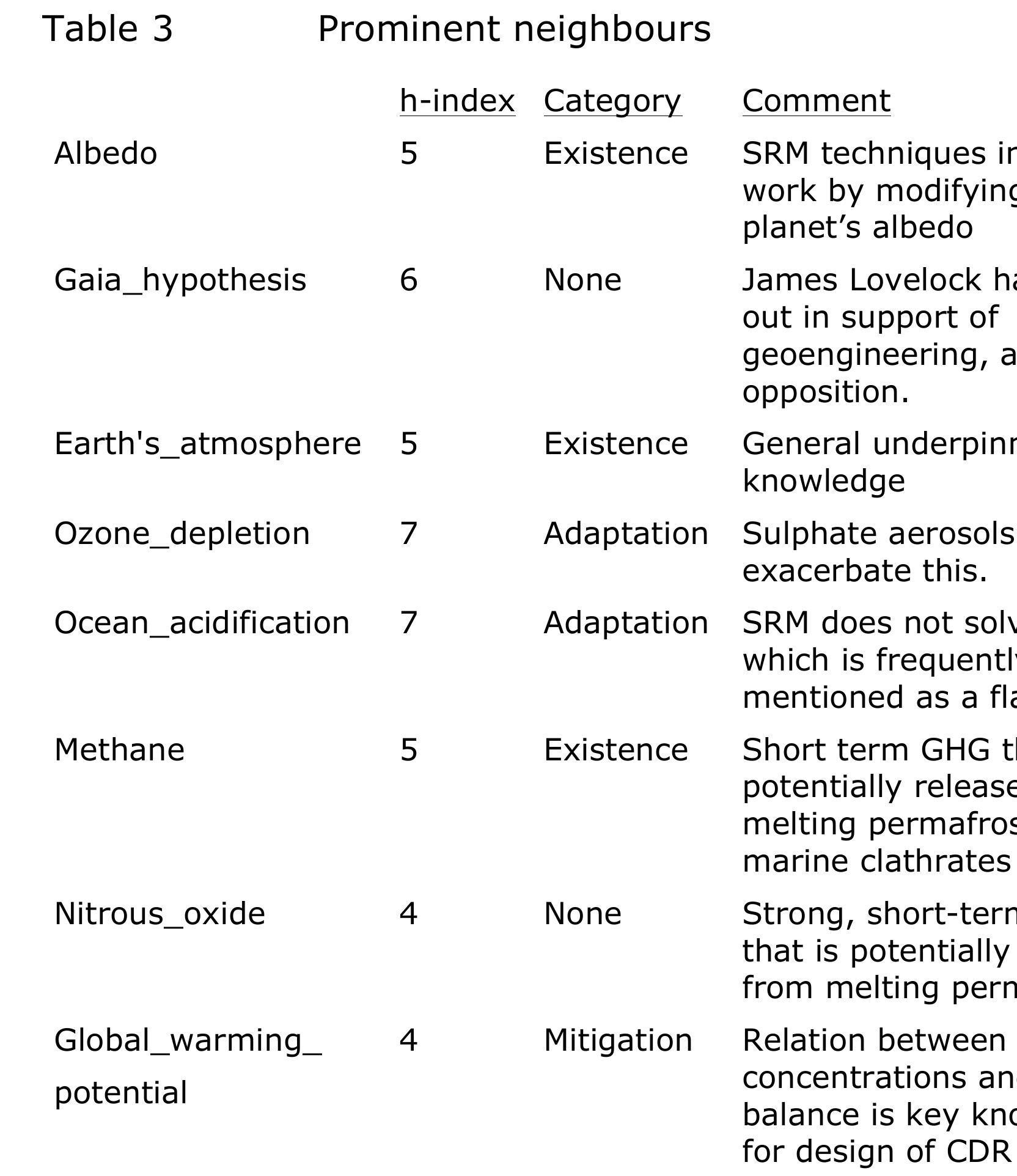 The main finding is that a distinction is made on Wikipedia between two groups of geoengineering methods. On the one hand, there is a group of land-based sequestration technologies, strongly related to adaptation and mitigation discourse, and on the other hand a set of geoengineering technologies, including solar radiation management, ocean iron fertilisation, weather modification and planetary engineering, that is relatively separate from the overall climate change discourse on Wikipedia.