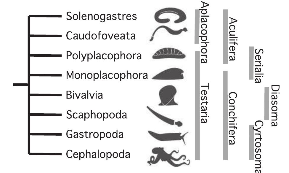 Mollusks are the most morphologically disparate living animal phylum, they have diversified into ... more Mollusks are the most morphologically disparate living animal phylum, they have diversified into all habitats, and have a deep fossil record. Monophyly and identity of their eight living classes is undisputed, but relationships between these groups and patterns of their early radiation have remained elusive. Arguments about traditional morphological phylogeny focus on a small number of topological concepts but often without regard to proximity of the individual classes. In contrast, molecular studies have proposed a number of radically different, inherently contradictory, and controversial sister relationships. Here, we assembled a dataset of 42 unique published trees describing molluscan interrelationships. We used these data to ask several questions about the state of resolution of molluscan phylogeny compared to a null model of the variation possible in random trees constructed from a monophyletic assemblage of eight terminals. Although 27 different unique trees have been proposed from morphological inference, the majority of these are not statistically different from each other. Within the available molecular topologies, only four studies to date have included the deep-sea class Monoplacophora; but 36.4% of all trees are not significantly different. We also present supertrees derived from 2 data partitions and 3 methods, including all available molecular molluscan phylogenies, which will form the basis for future hypothesis testing. The supertrees presented here were not constructed to provide yet another hypothesis of molluscan relationships, but rather to algorithmically evaluate the relationships present in the disparate published topologies. Based on the totality of available evidence, certain patterns of relatedness among constituent taxa become clear. The internodal distance is consistently short between a few taxon pairs, particularly supporting the relatedness of Monoplacophora and the chitons, Polyplacophora. Other taxon pairs are rarely or never found in close proximity, such as the vermiform Caudofoveata and Bivalvia. Our results have specific utility for guiding constructive research planning in order to better test relationships in Mollusca as well as other problematic groups. Taxa with consistently proximate relationships should be the focus of a combined approach in a concerted assessment of potential genetic and anatomical homology, while unequivocally distant taxa will make the most constructive choices for exemplar selection in higher-level phylogenomic analyses.