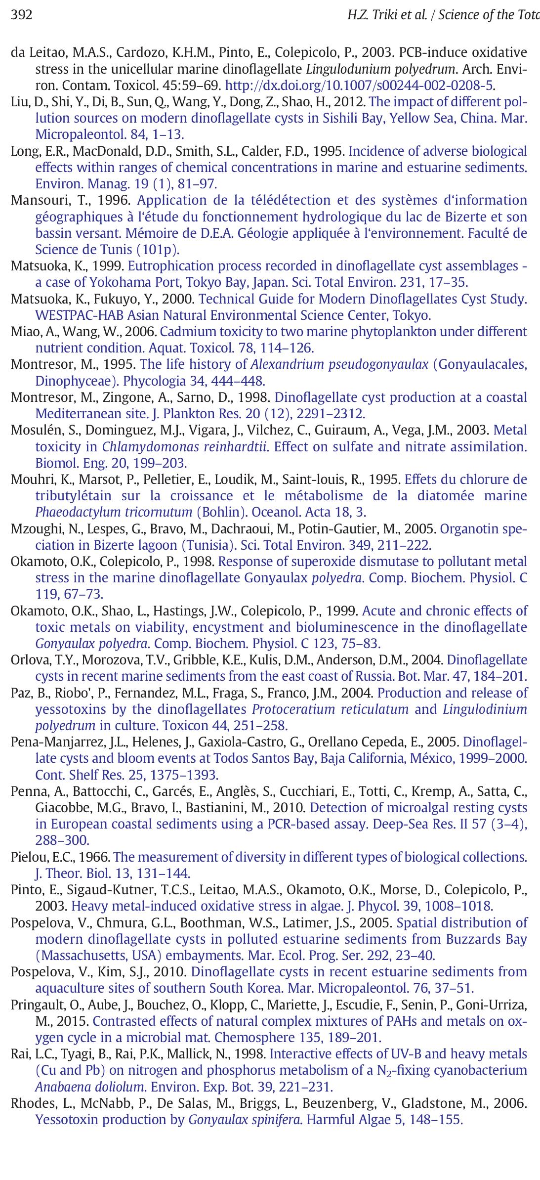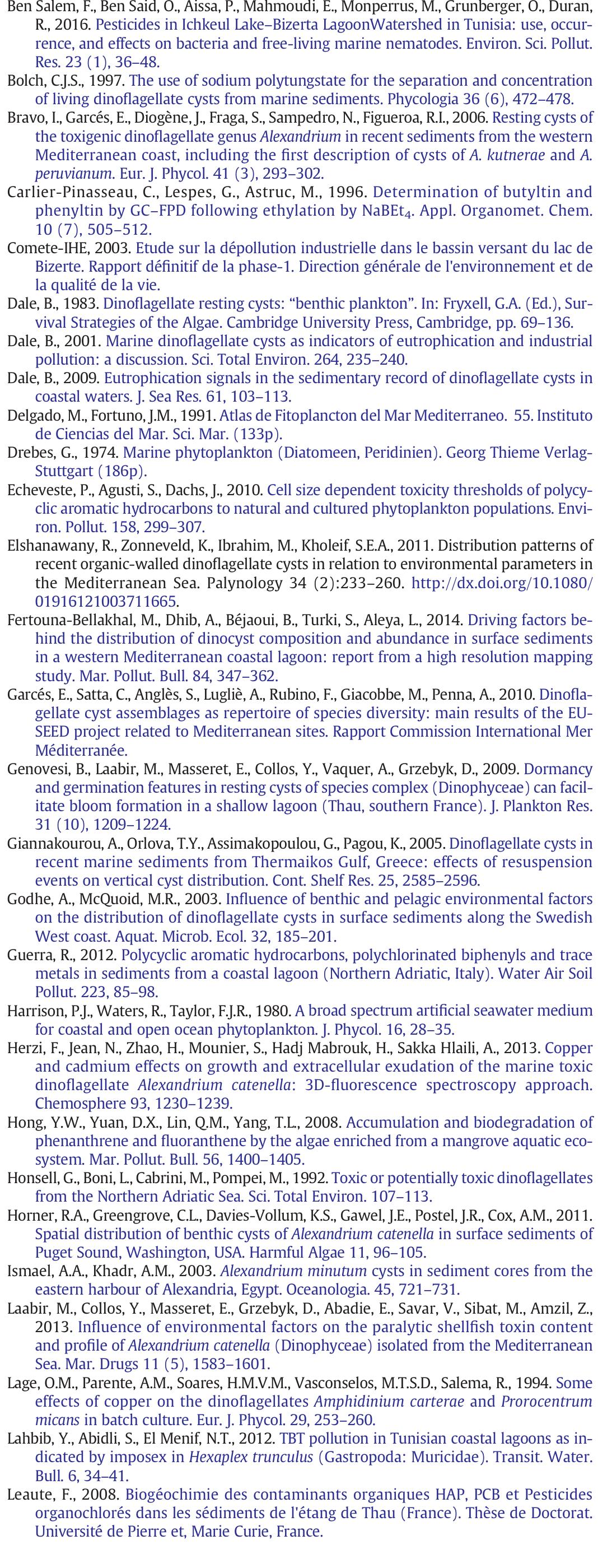We studied the relationships between sediment industrial pollutants concentrations, sediment char... more We studied the relationships between sediment industrial pollutants concentrations, sediment characteristics and the dinoflagellate cyst abundance within a coastal lagoon by investigating a total of 55 sampling stations within the Bizerte lagoon, a highly anthropized Mediterranean ecosystem. The sediment of Bizerte lagoon is characterized by a high dinocyst abundance, reaching a maximum value of 2742 cysts·g −1 of dry sediment. The investigated cyst diversity was characterized by the presence of 22 dominant dinocyst morphotypes belonging to 11 genera. Two dinoflagellate species dominated the assemblage: Alexandrium pseudogonyaulax and Protoperidinium claudicans, representing 29 to 89% and 5 to 38% of the total cyst abundance, respectively, depending on the station. Seven morphotypes belonging to potentially toxic species were detected, including Alexandrium minutum, A. pseudogonyaulax, Alexandrium catenella/tamarense species complex, Lingulodinium polyedrum, Gonyaulax cf. spinifera complex, Prorocentrum micans and Protoceratium reticulatum. Pearson correlation values showed a positive correlation (α = 0.05) between cyst abundance and both water content and fine silt sediment content. Clustering revealed that the highest abundance of cysts corresponds to stations presenting the higher amounts of heavy metals. The simultaneous autoregressive model (SAM) highlighted a significant