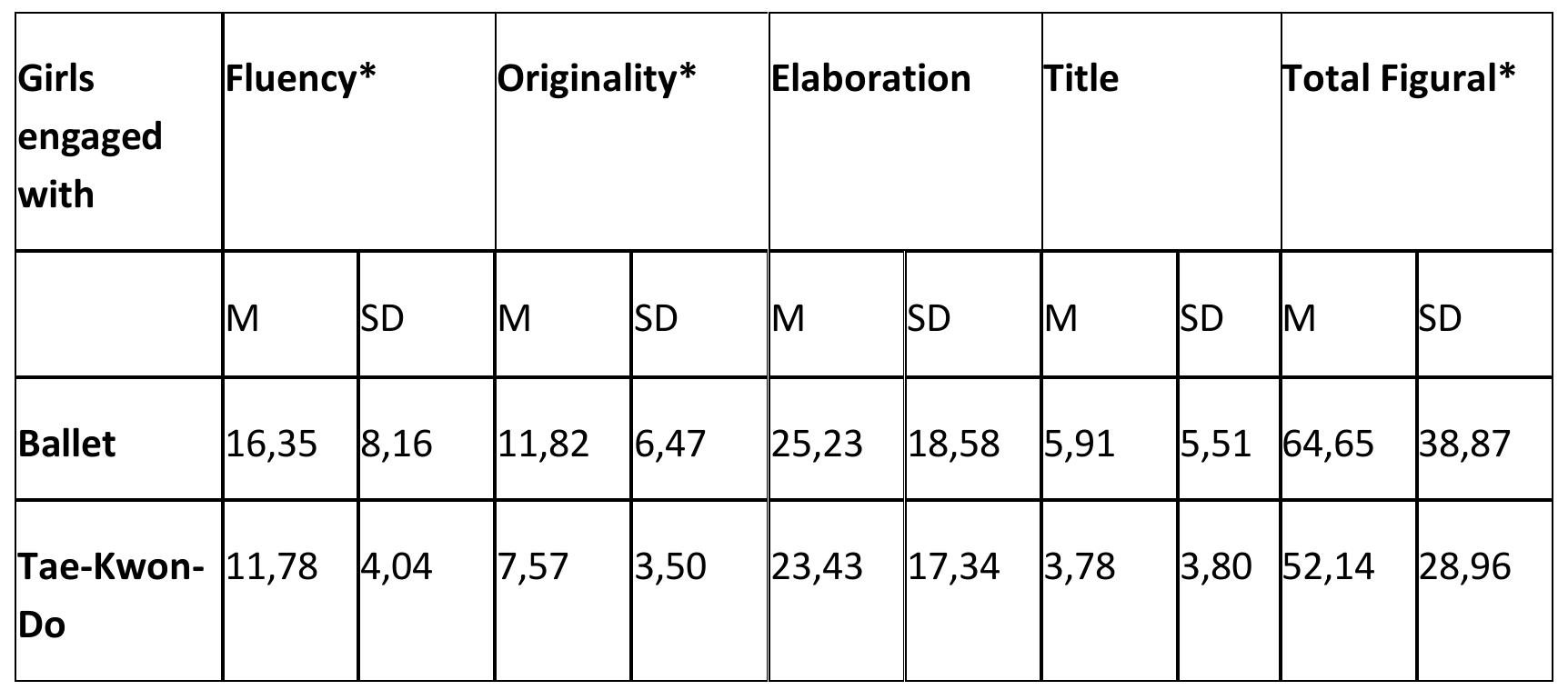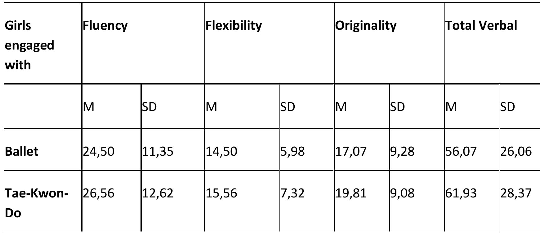 The aim of this study was to compare young girls' performance in terms of creative thinking who w... more The aim of this study was to compare young girls' performance in terms of creative thinking who were involved in ballet and those involved in Taekwondo. On the one hand, teaching ballet to young children is inextricably linked with the use of music and free kinetic expression. On the other hand, Taekwondo is a sport, which includes a rich motor repertoire. A total of 36 girls aged from 7 to 9 years completed the Torrance Tests of Creative Thinking (TTCT) (Form A);18 girls were involved in ballet and 18 were involved in Taekwondo. The TTCT is a highly reliable creativity test and the most widely used test to assess creative thinking and creativity. All participants completed the Verbal TTCT, Thinking Creatively with Words and the Figural TTCT, Thinking Creatively with Pictures. The TTCT is appropriate for all levels, from kindergarten to adulthood and is scored based on four scales: 'Fluency', 'Flexibility', 'Originality' and 'Elaboration'. These scales are considered to be the most important ones for evaluating creative thinking and creativity. To compare the performance between the two groups, Mann-Whitney non-parametric control was used for independent specimens. The results showed statistically significant differences that favored girls who were involved in ballet only in the Figural Test. However, no statistically significant difference was found between the two groups in terms of their performance in the Verbal Test. The discussion focuses on the contribution of music to teaching and free dancing as well as the important role they seem to play in developing young students' imagination and creativity.
