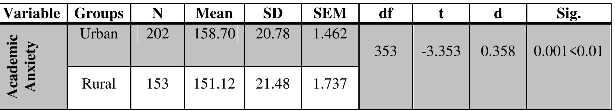 Academic anxiety is the feeling of distraction, worry, fear or being stressed out due to academic... more Academic anxiety is the feeling of distraction, worry, fear or being stressed out due to academics. If anxiety level increases, it hinders the student's academic performance. The present study was carried out to find out the difference in academic anxiety of senior secondary school students in relation to locale (rural and urban) and type of school (government and private). A sample of 355 senior secondary school students from various schools of Aligarh and Agra districts of Uttar Pradesh were selected. Standardized tool developed by Sharma &Shakir (2019) used for measuring the level of academic anxiety of senior secondary school students. The statistical techniques utilized in the present study were mean, standard deviation and t-test. Results revealed a significant difference in the academic anxiety of senior secondary school students in relation to locale. Urban senior secondary school students have more academic anxiety in comparison to their counterparts. Similarly significant difference is found in the academic anxiety of senior secondary school students in relation to type of school. Senior secondary students studying in private schools have more academic anxiety in comparison to government senior secondary school students.