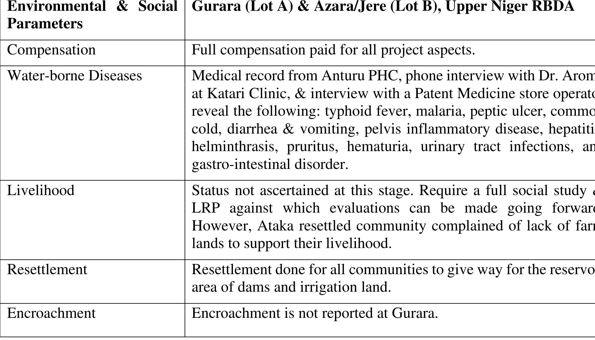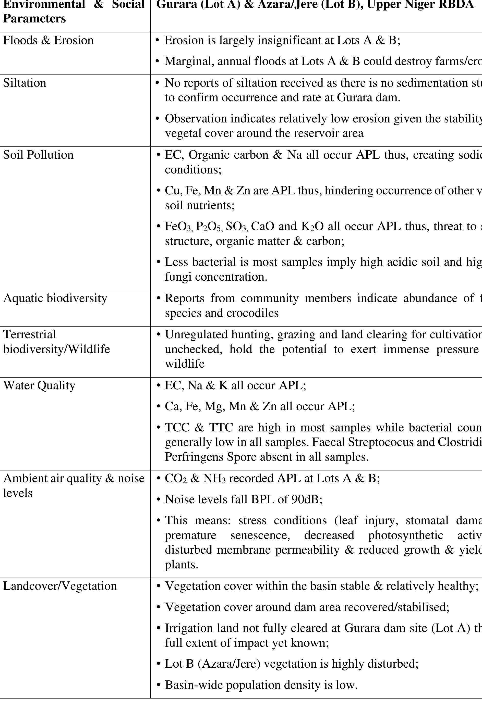 It has been clearly established that development of dams and associated user facilities (such as ... more It has been clearly established that development of dams and associated user facilities (such as irrigation, water transfer and hydro-power infrastructure, aquaculture , etc.) significantly impact the quality of the physical environment and established social networks of host communities. It is therefore, necessary that a holistic and sustainable approach is adopted in the process of planning these projects. This study reviewed the environmental and social impact status of the Gurara and Azara/Jere Irrigation Projects in the Upper Niger River Basin in Kaduna State, NorthWest Nigeria. The study focused on investigating key environmental and social attributes including soil quality, water quality, air quality and noise level, vegetation (landuse) cover analysis, health status, socioeconomic and livelihood appraisal, and social characteristics of host communities using various approaches such as laboratory analysis, insitu assessment, key informant interviews, and document analysis. The findings of the study reveal a range of risks which include pollution of water and soil as well as vulnerability to floods and erosion, and loss of livelihoods. Generally, the outcome of this study serves to advance the importance of assessing environmental impacts from anthropogenic activities, as well as measurement and intervention to relevant criteria/conditions. Among others, the study suggests periodic monitoring and assessment of key environmental and social risks components and the resolution of land related compensation issues at the project sites.