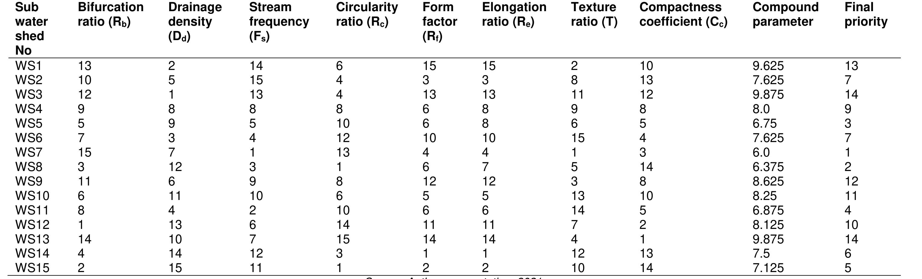Remote sensing and GIS techniques have been increasingly used in characterization of drainage bas... more Remote sensing and GIS techniques have been increasingly used in characterization of drainage basin and prioritization of erosion prone watershed. This study uses remote sensing and GIS to characterise drainage basin morphometry and prioritize soil erosion prone sub watershed in the Lamurde watershed in Taraba state Nigeria. The study adopted standard formulae and methods to compute the morphometric parameters. The Lamurde watershed was delineated to fifteen subwatersheds with each coded as WS1 to WS15. The result of the findings reveals that Lamurde watershed has a dendritic to sub-dendritic drainage pattern with the smaller streams intersecting the main trunk at acute angles. The findings reveal that Lamurde is a ninth order stream with total area of 1,458.66 km 2 and a perimeter of 395.93 km. The basin also has 258,493 total number of streams. The main soil types in the Lamurde basin are fluvisol, lithosol, ferric luvisols and humic nitosols. The surface soil texture of the area is mainly loamy type and particle size classes are fine loamy type. Depth of soil varies from shallow to very deep and having parent material derived from sandstones, mudstones and shales. The findings of the study reveals that watershed: WS7, WS8, WS5, WS11, WS15, WS14, WS2 and WS6 in ascending order are very highly vulnerable to soil erosion. Despite inherent limitation in the use of morphometric parameters to prioritize erosion prone sub watersheds, it is most suitable in the present circumstances because of inadequate
