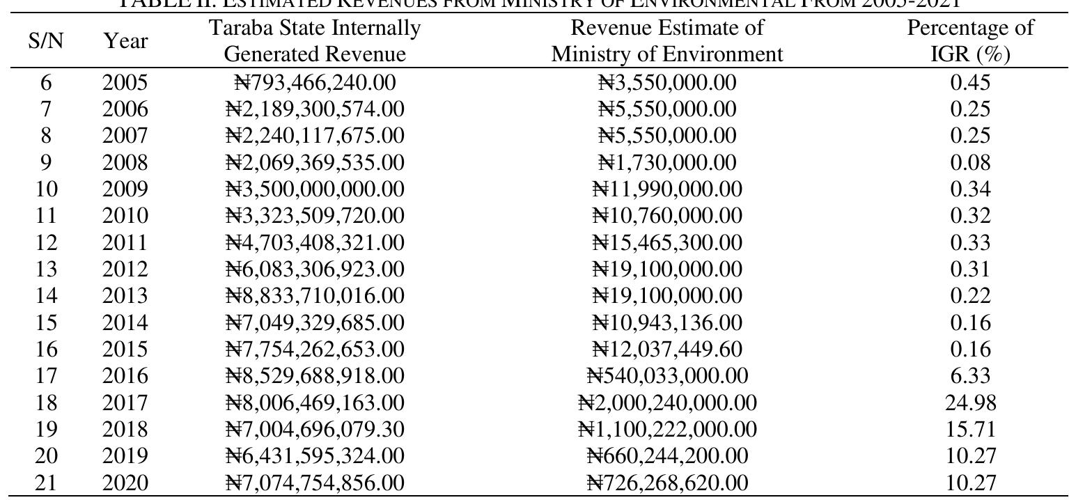 This study examined the performance of State institutions in environmental protection in Taraba S... more This study examined the performance of State institutions in environmental protection in Taraba State with a view to ascertaining their capacity for environmental protection or otherwise and the challenges undermining their efforts. The study is anchored on the theory of Environmentally Responsible Behaviour (ERB). The study adopted survey research design using field observation and interview schedule. Yearly allocations to the two institutions were compiled from the yearly budget documents of the state. The study findings reveal that the state generate the highest revenue of ₦2billion in 2017 which is about 25% and ₦1billion in 2018, 15.17% of the IGR. These were the pick period of the trade in African Rosewood logs in the state. The huge revenue gave legitimacy to the logging activities and explains why the activity persisted despite the existing forest regulations and efforts to stop it. Despite the huge revenue, findings revealed that it was only in the years 2000, 2013, and 201...