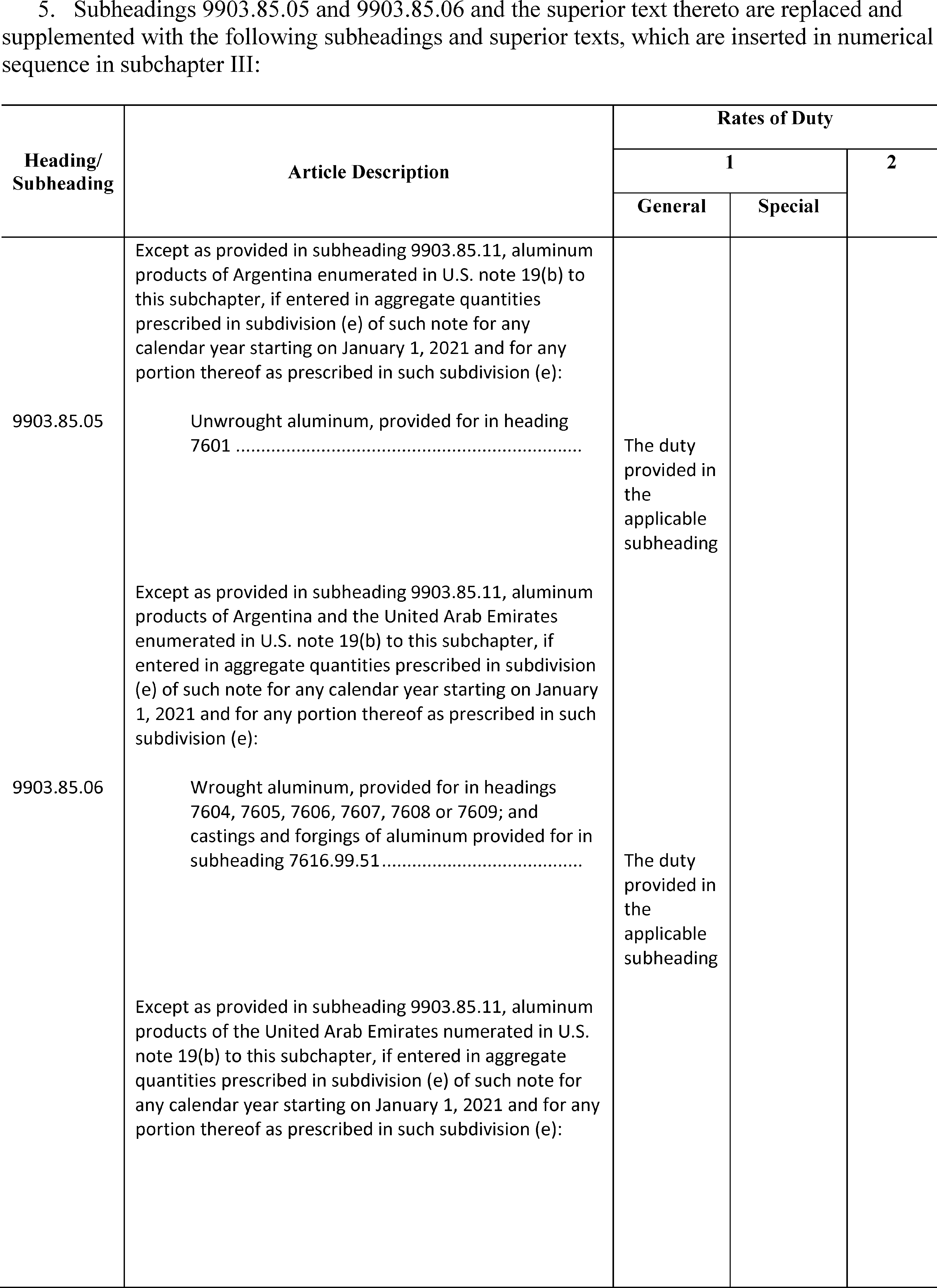 (4) The superior text to subheading 9903.85.11 of the HTSUS is amended by replacing “of Argentina” with “of Argentina and of the United Arab Emirates”, and the “Article Description” for subheading 9903.85.11 of the HTSUS is amended by replacing “9903.85.05 and 9903.85.06” with “9903.85.05 through 9903.85.08”.