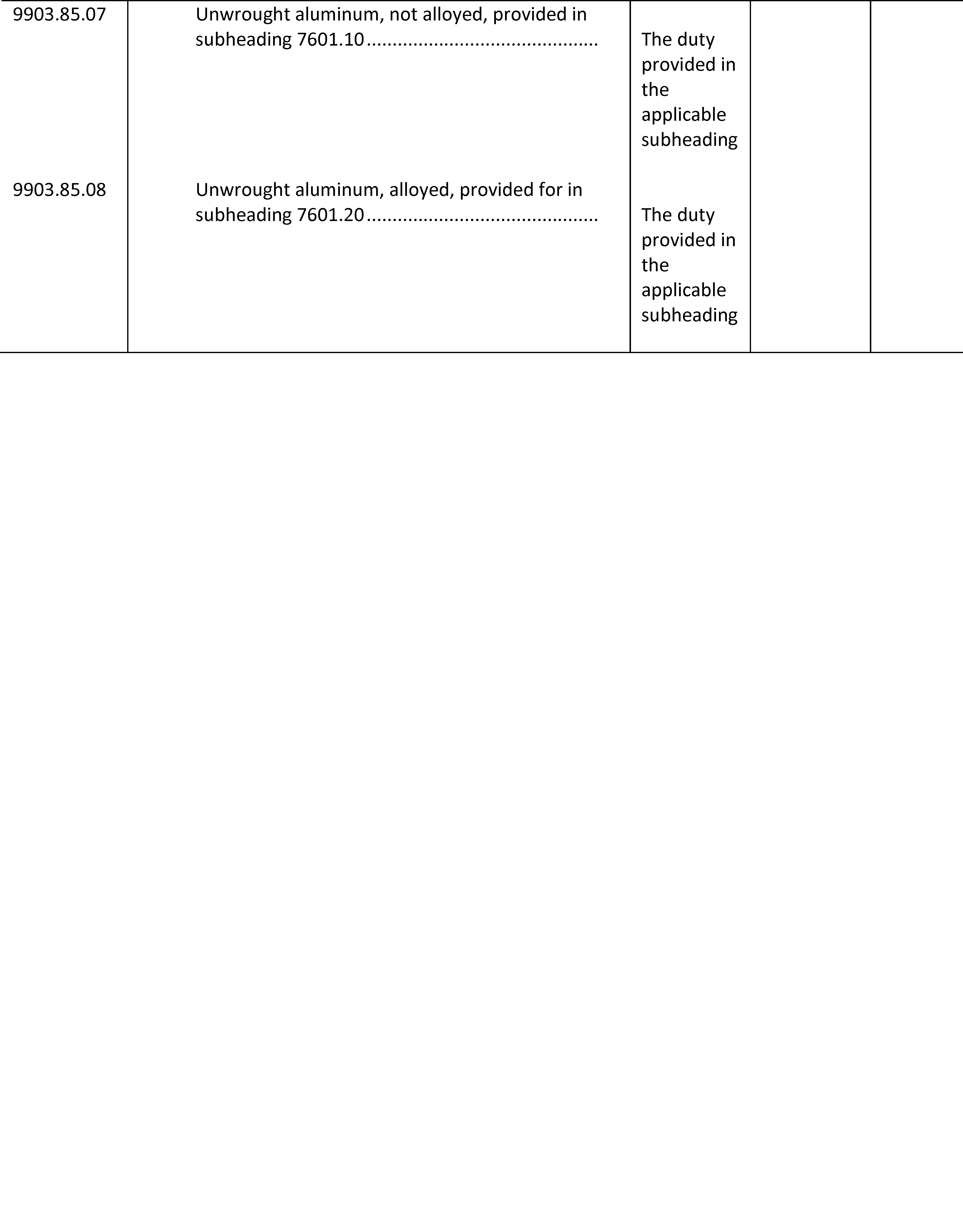 (2) Clauses 1 and 4 of Proclamation 9776 of August 29, 2018 (Adjusting Imports of Aluminum Into the United States) are amended by replacing, in each instance, “subheadings 9903.85.05 and 9903.85.06” with “subheadings 9903.85.05 through 9903.85.08”.