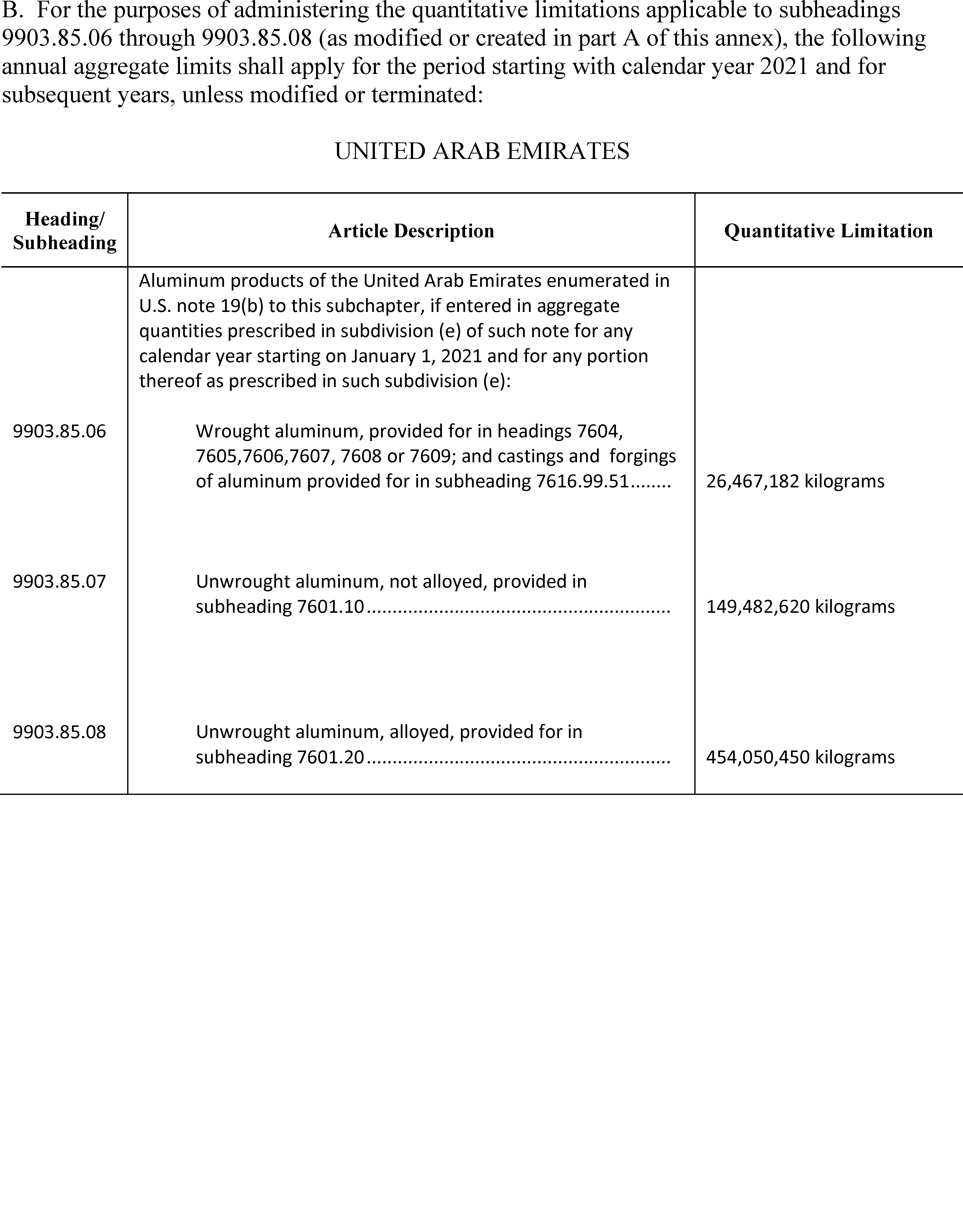 (5) In order to implement quantitative limitations on aluminum article imports from the United Arab Emirates, subchapter III of chapter 99 of the HTSUS is amended as provided for in Part A of the Annex to this proclamation. For purposes of administering these quantitative limitations, the annual aggregate limits set out in Part B of the Annex to this proclamation ( printed page 6827) shall apply for the period starting with calendar year 2021 and for subsequent years, unless modified or terminated. The quantitative limitations for the United Arab Emirates, which for calendar year 2021 shall take into account all aluminum article imports since January 1, 2021, shall be effective for aluminum articles entered for consumption, or withdrawn from warehouse for consumption, on or after 12:01 a.m. eastern standard time on February 3, 2021, and shall be implemented by U.S. Customs and Border Protection (CBP) of the Department of Homeland Security as soon as practicable. The Secretary shall monitor the implementation of these quantitative limitations and shall, in consultation with the United States Trade Representative, inform the President of any circumstance that in the Secretary's opinion might indicate that an adjustment of the quantitative limitations is necessary.