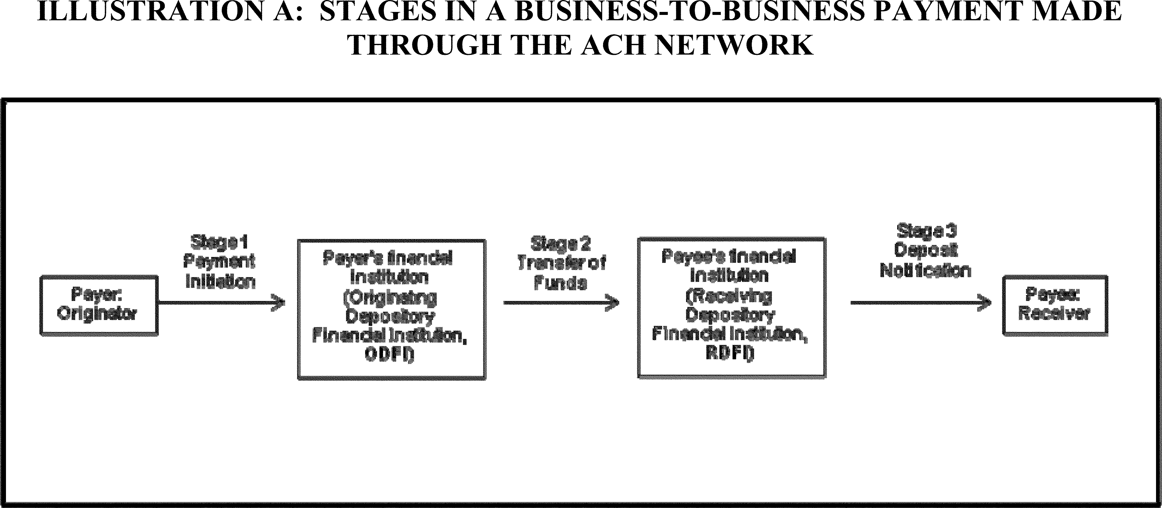 To give context to how EFT are used in the health care industry, we consider here how businesses pay one another by transferring funds and sending related payment information through the ACH Network. We can simplify understanding of the ACH Network payment process by dividing the transaction flow of the EFT into three chronological stages, each of which ( printed page 1559) includes a separate electronic transmission of information (see Illustration A and Table 2).