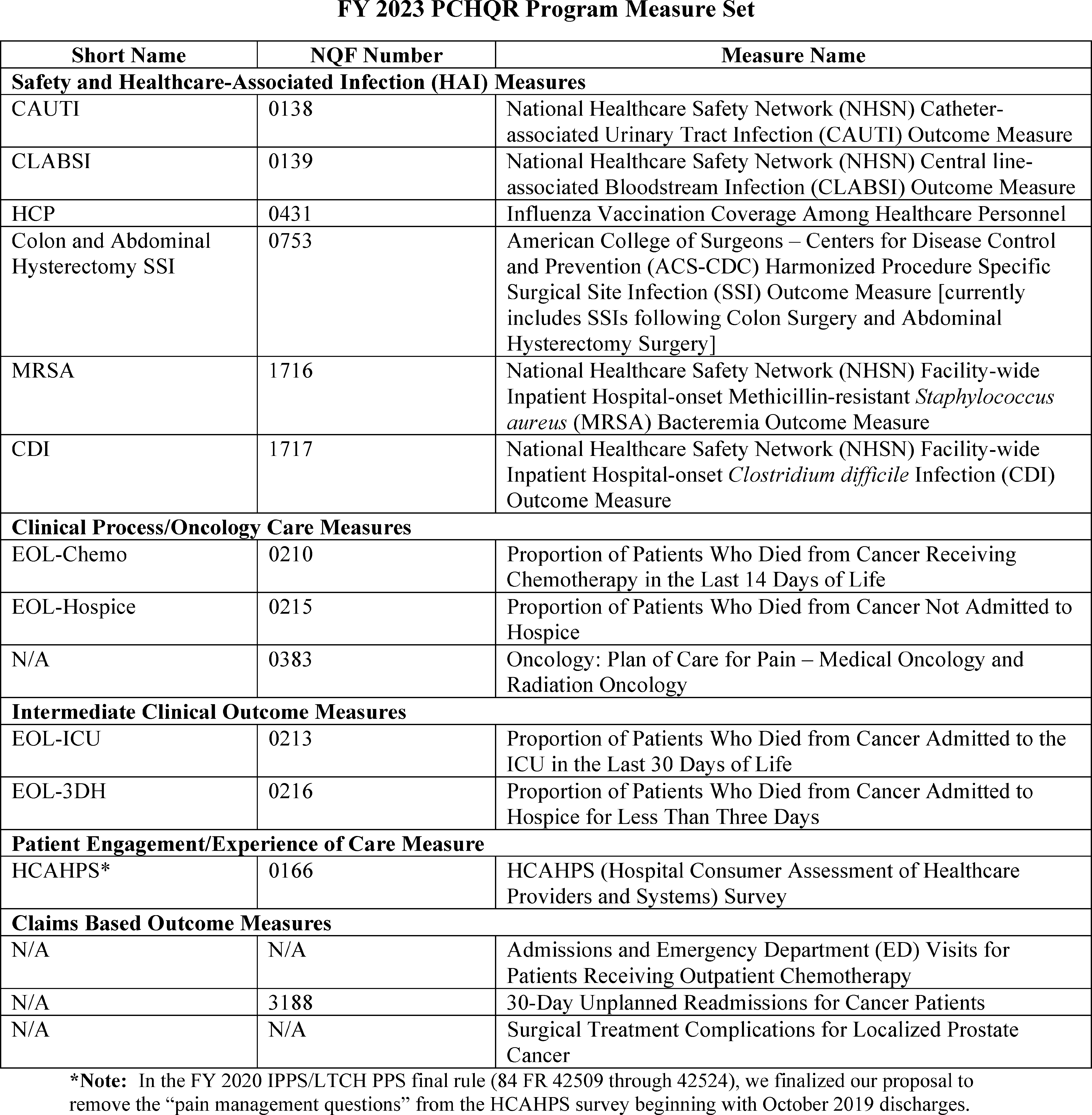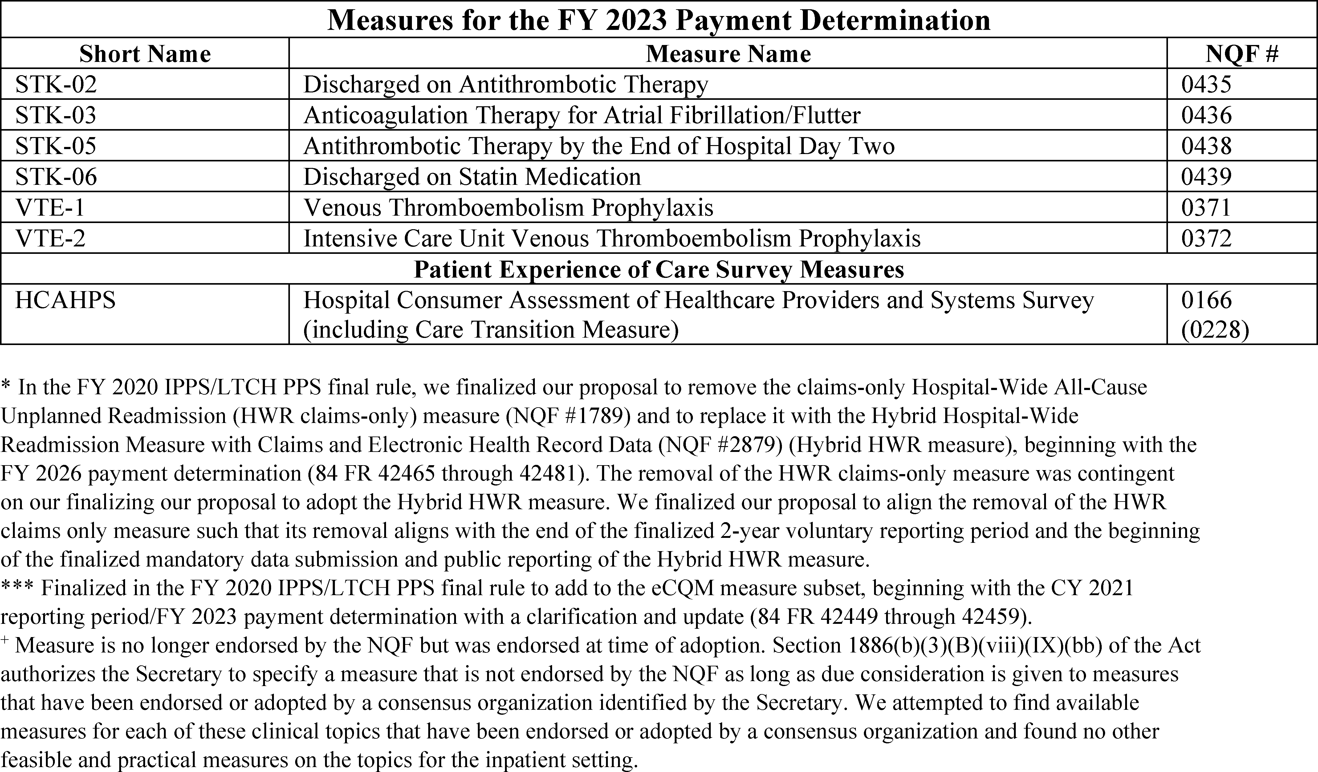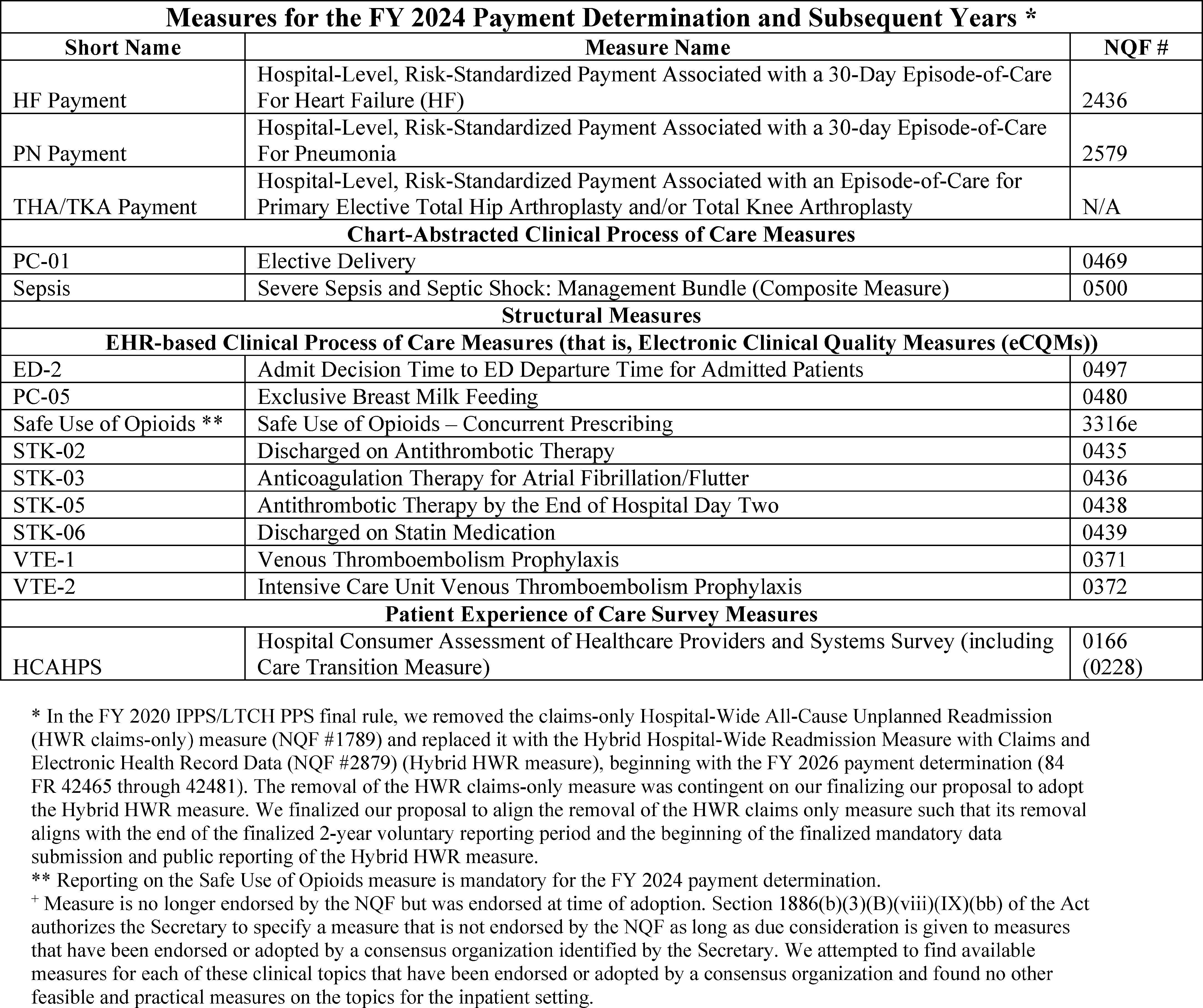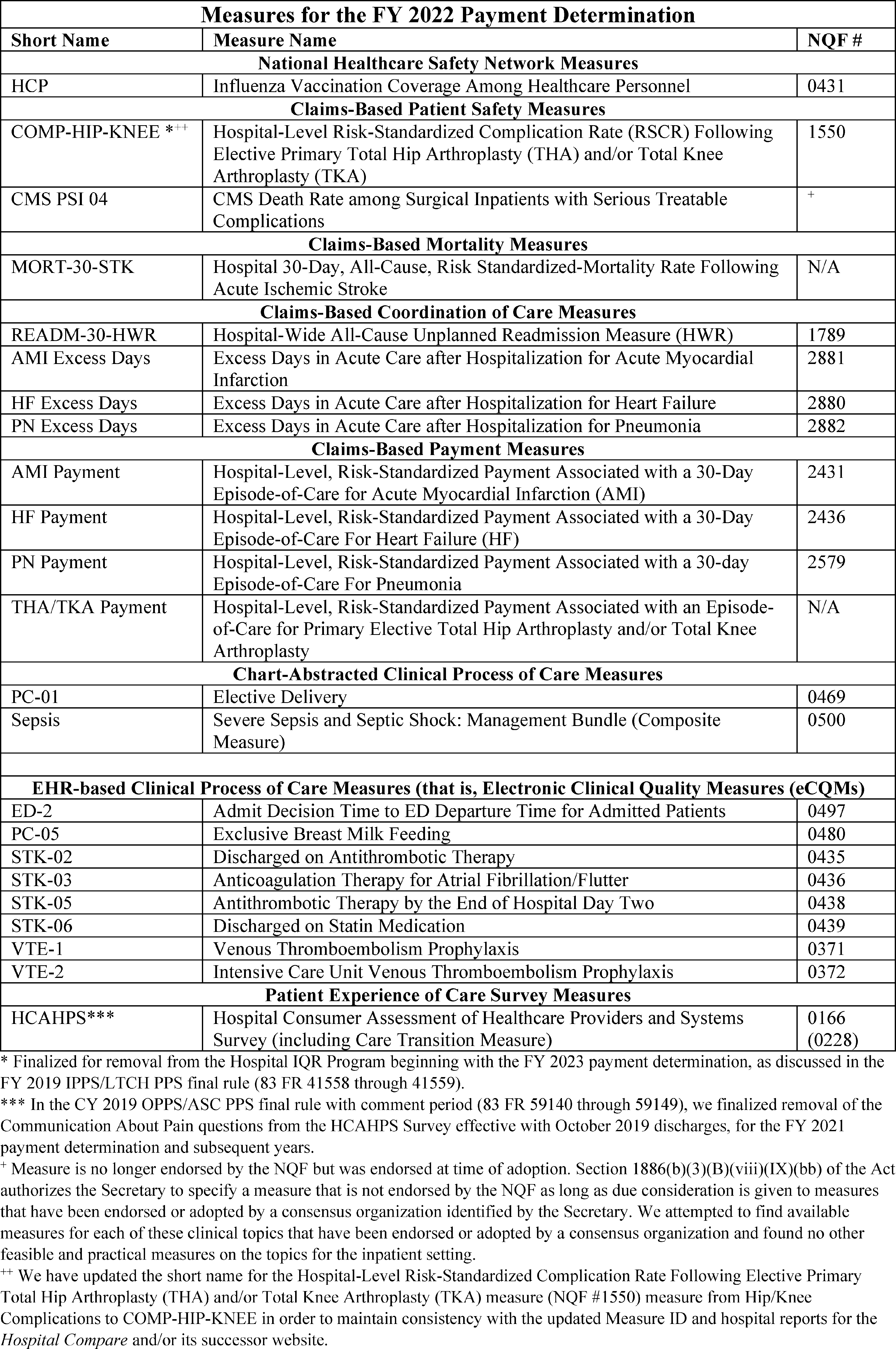 Back to Citation464. In the FY 2019 IPPS/LTCH PPS final rule (83 FR 41562 through 41567), we removed three clinical process-of-care measures (IMM-2, ED-1, and VTE-6) for the CY 2019 reporting period/FY 2021 payment determination and subsequent years, and one clinical process of care measure (ED-2) for the CY 2020 reporting period/FY 2022 payment determination and subsequent years.