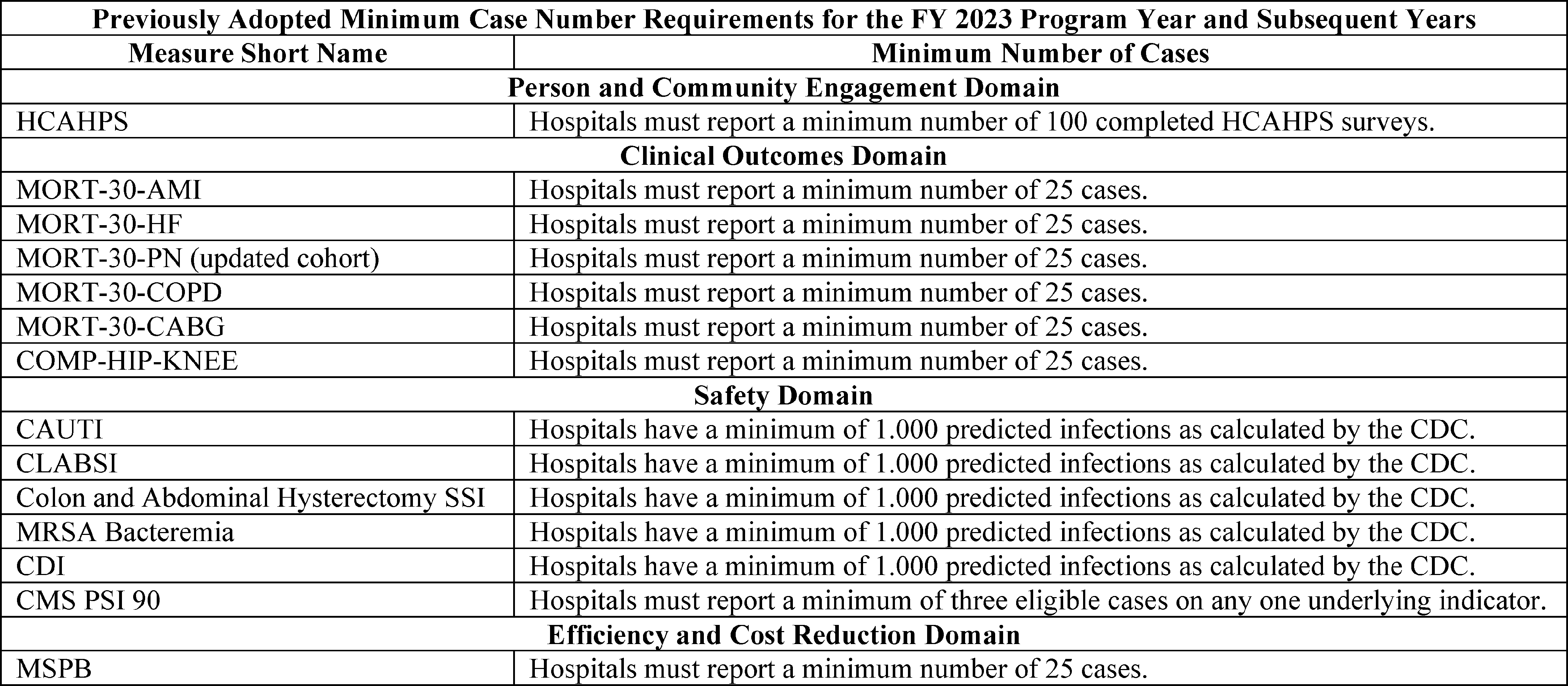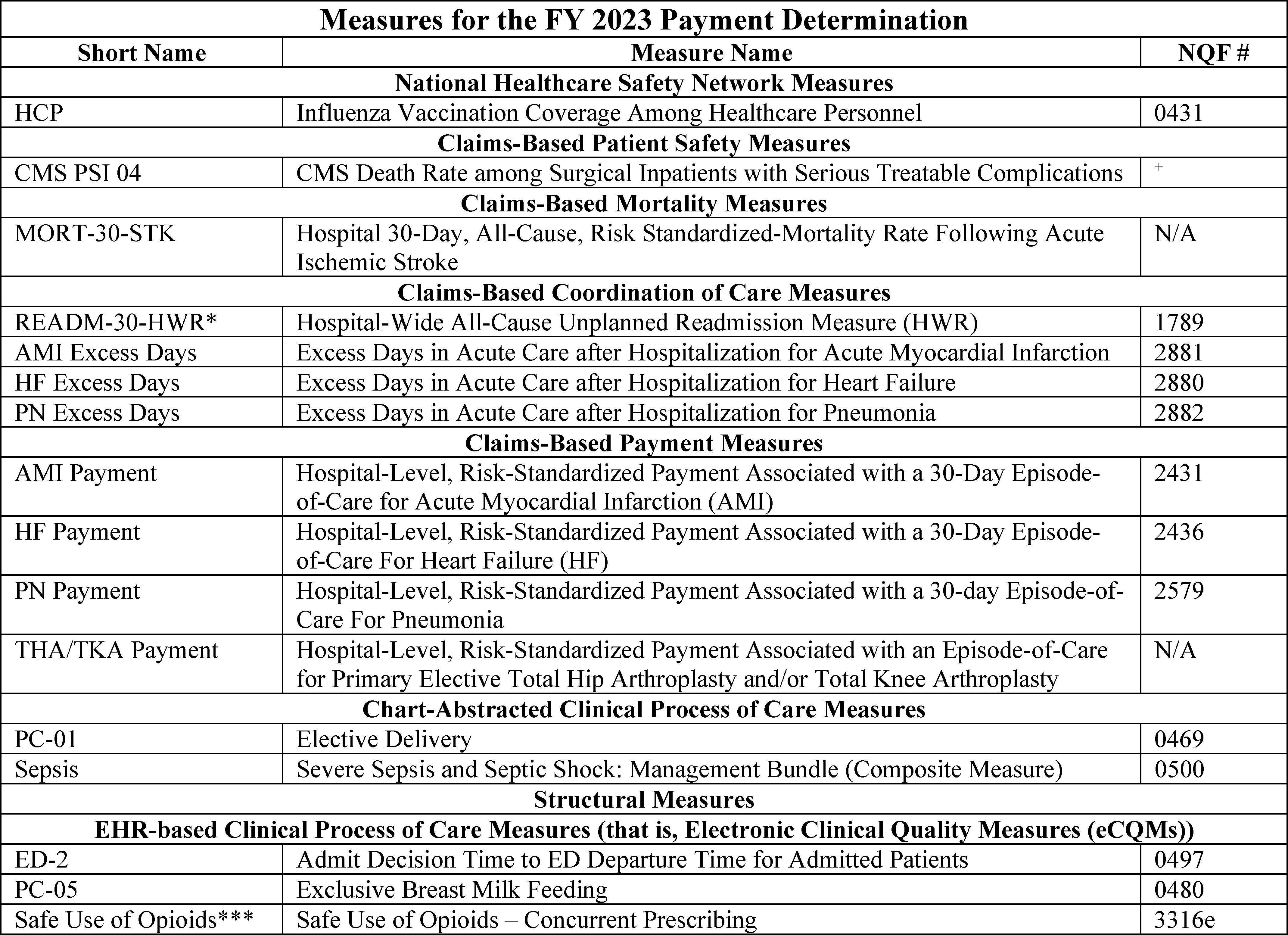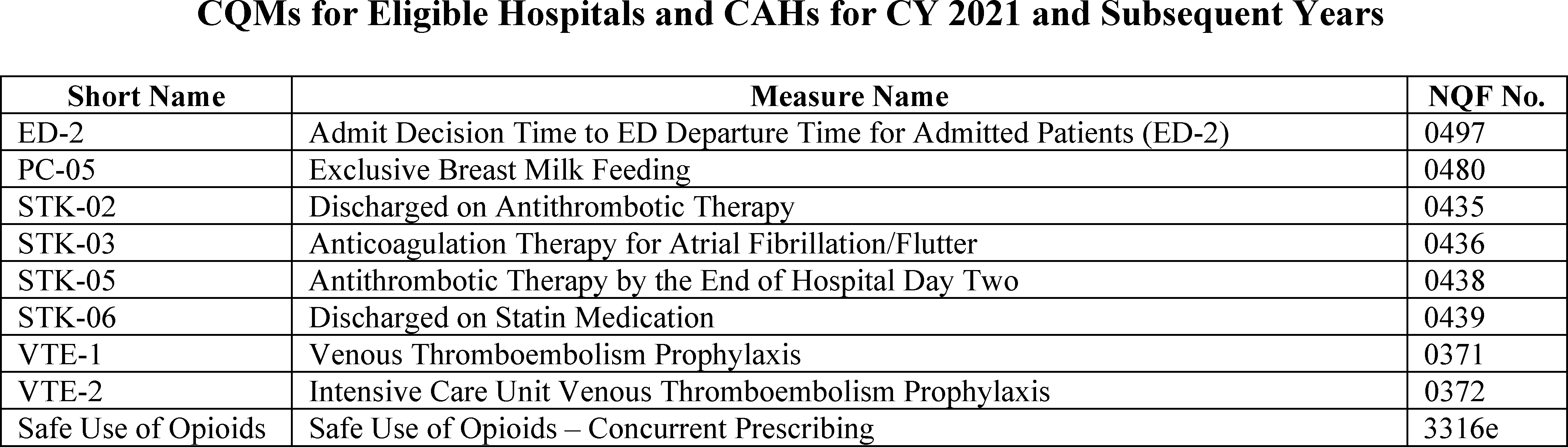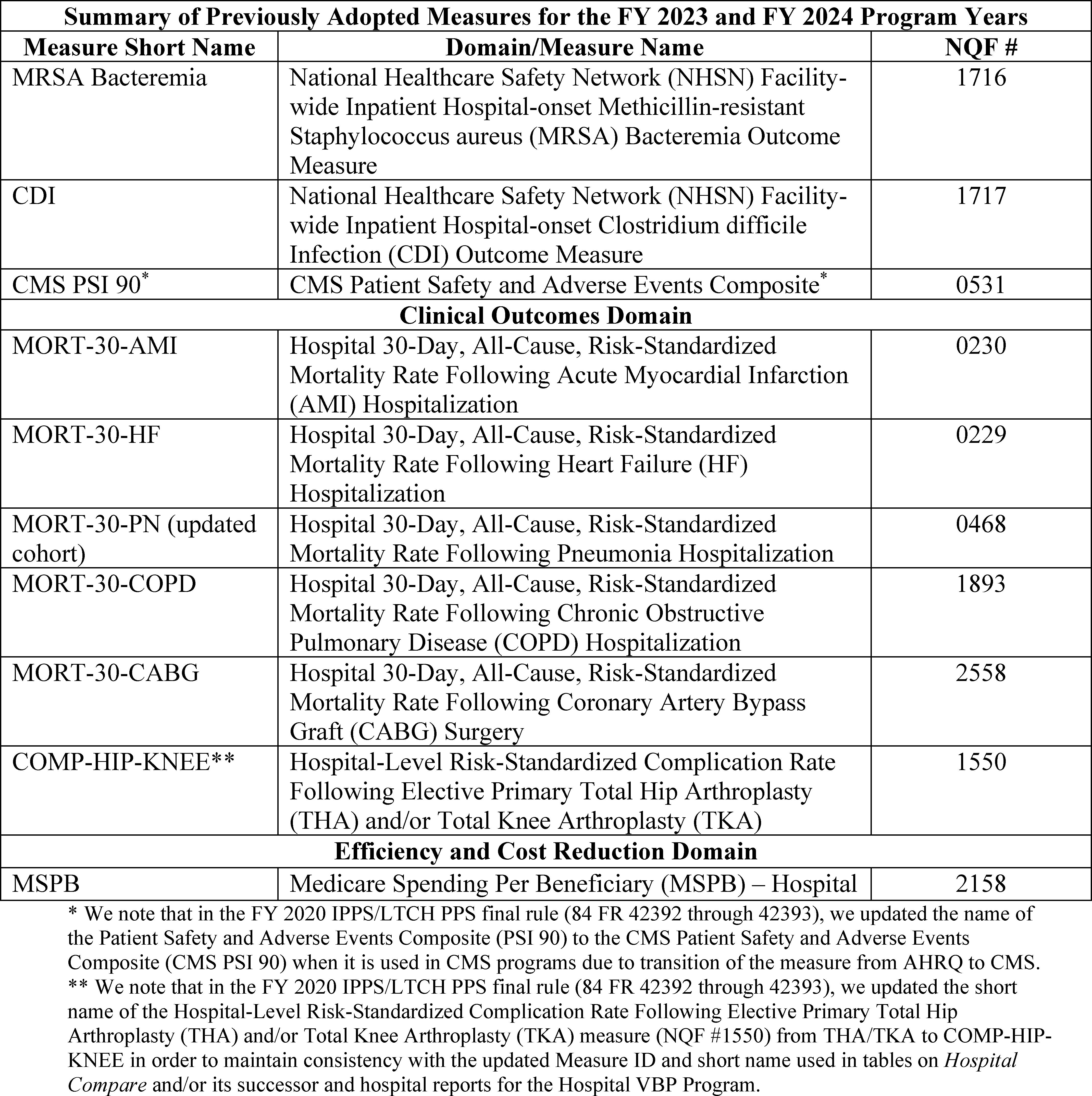 Back to Citation464. In the FY 2019 IPPS/LTCH PPS final rule (83 FR 41562 through 41567), we removed three clinical process-of-care measures (IMM-2, ED-1, and VTE-6) for the CY 2019 reporting period/FY 2021 payment determination and subsequent years, and one clinical process of care measure (ED-2) for the CY 2020 reporting period/FY 2022 payment determination and subsequent years.