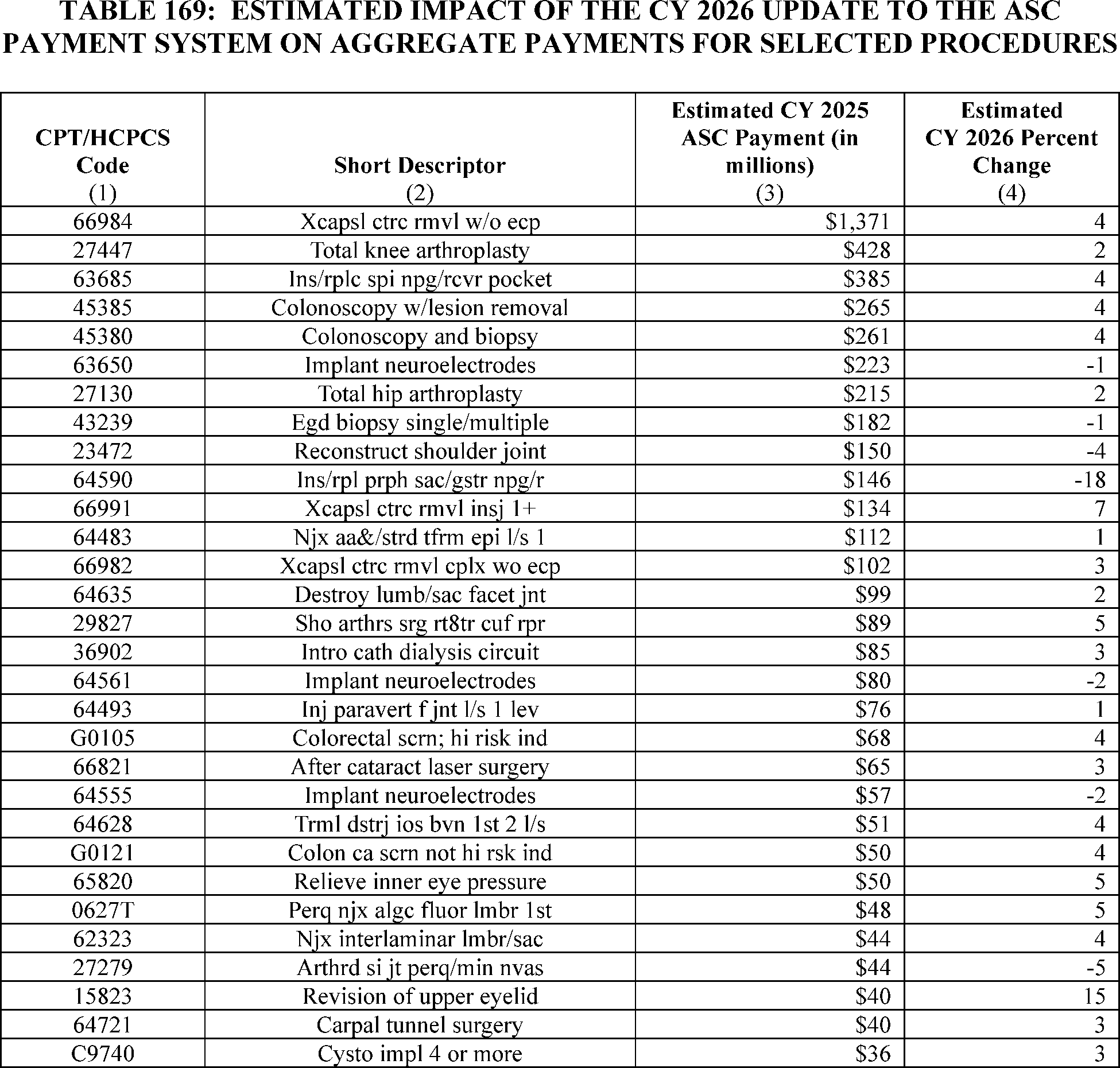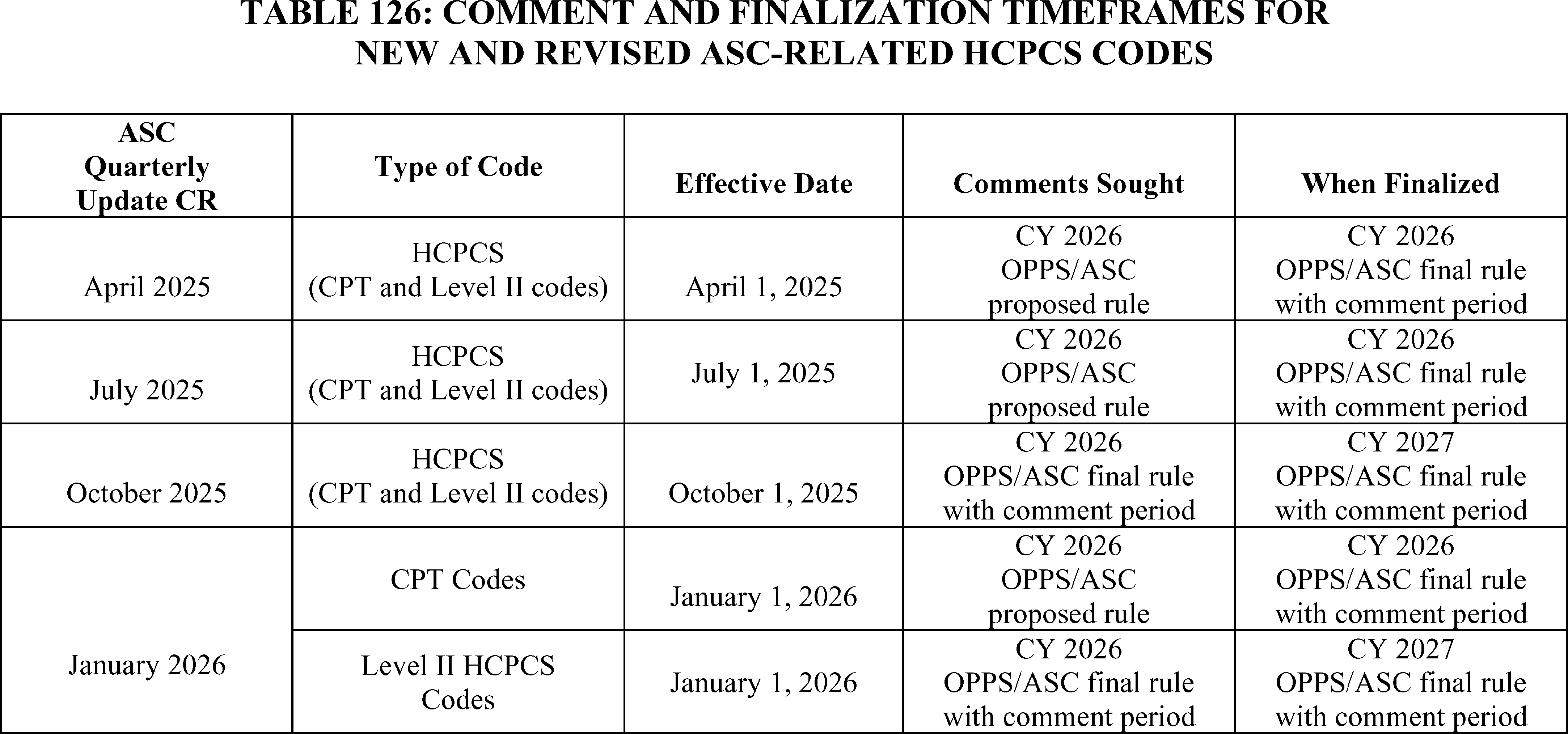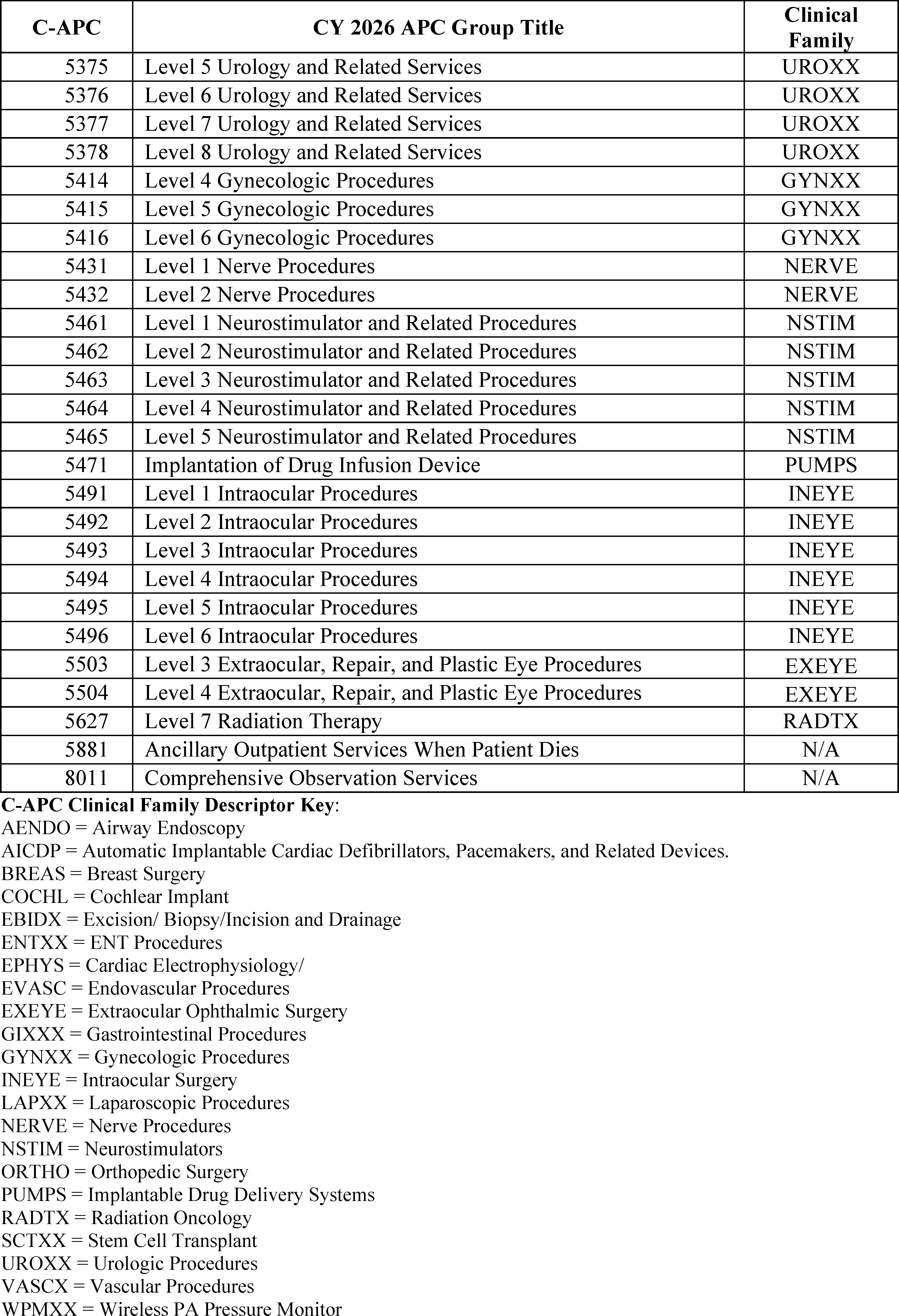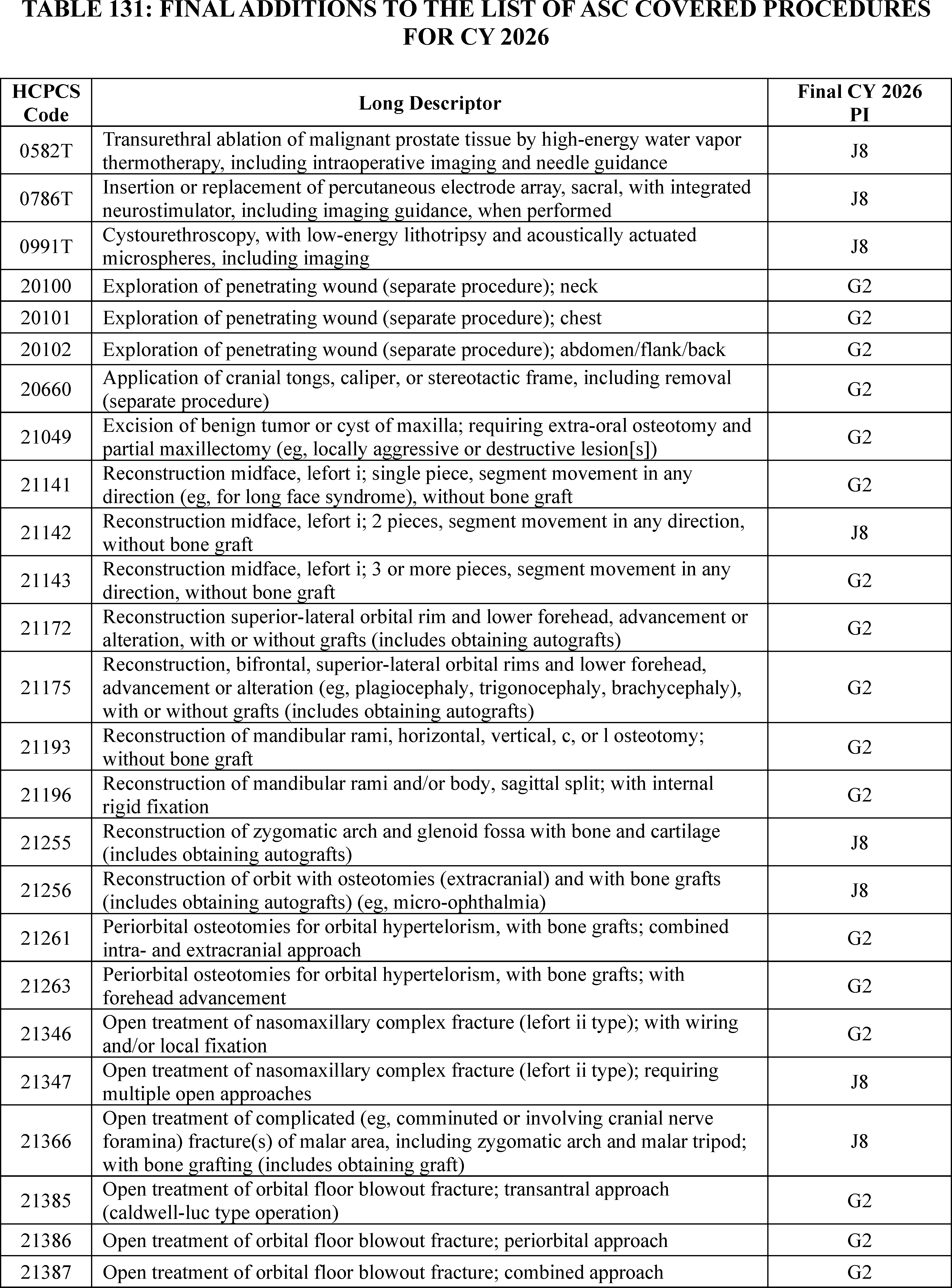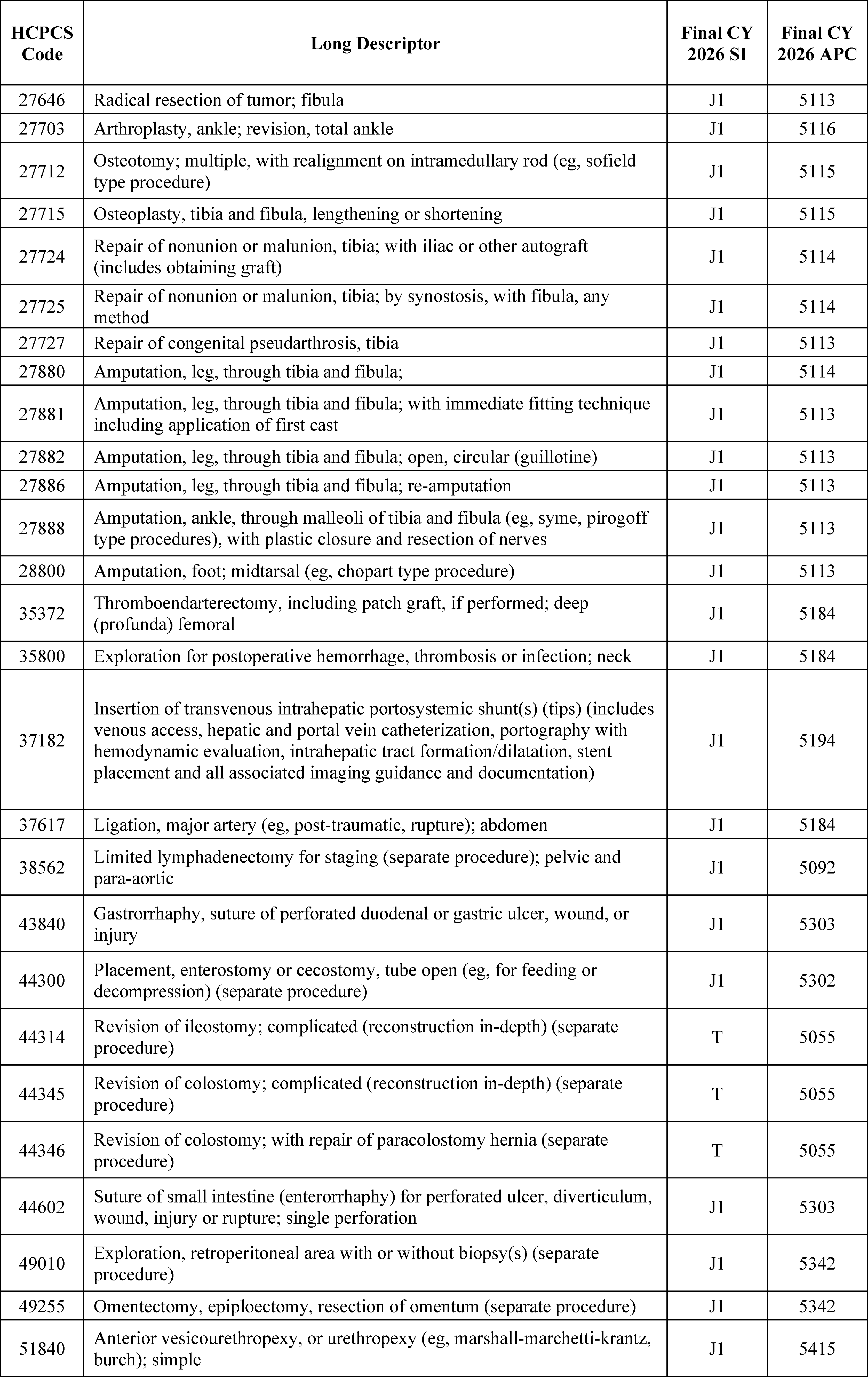 - Changes to the List of ASC Covered Surgical Procedures and Ancillary Services Lists: For CY 2026, we are expanding the ASC covered procedures list (CPL) by revising the criteria under § 416.166 to modify the general standard criteria and to eliminate five of the general exclusion criteria, moving them into a new section as nonbinding physician considerations for patient safety. We also are adding 276 procedures to the ASC CPL based on these criteria changes and adding an additional 271 codes to the ASC CPL that we are finalizing for removal from the IPO list for CY 2026.