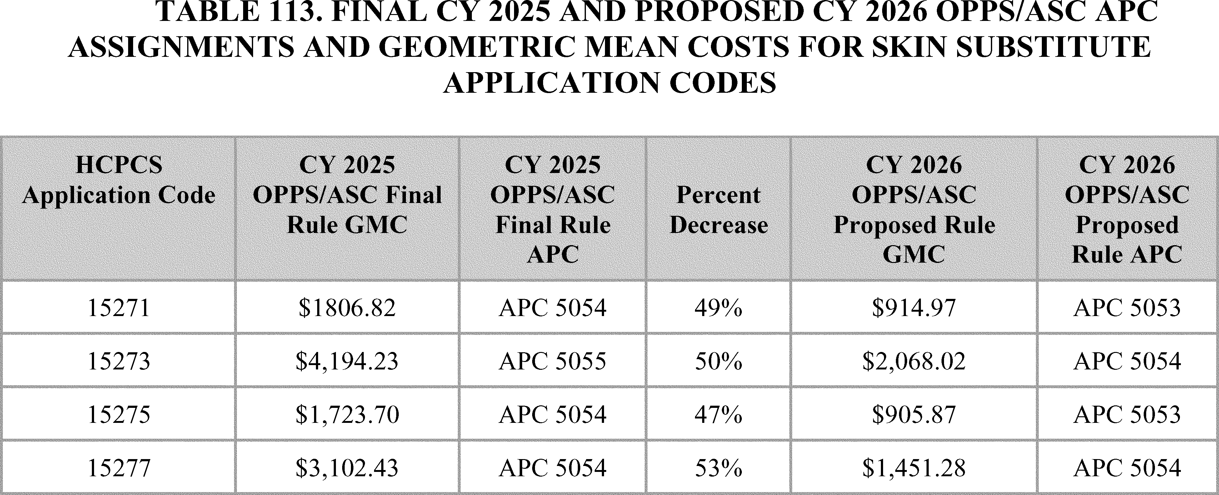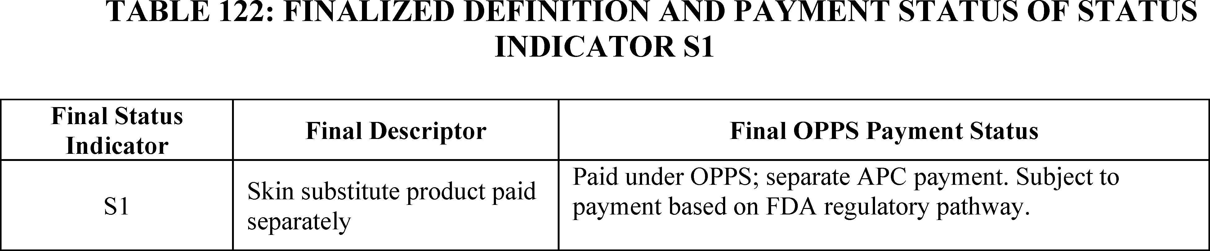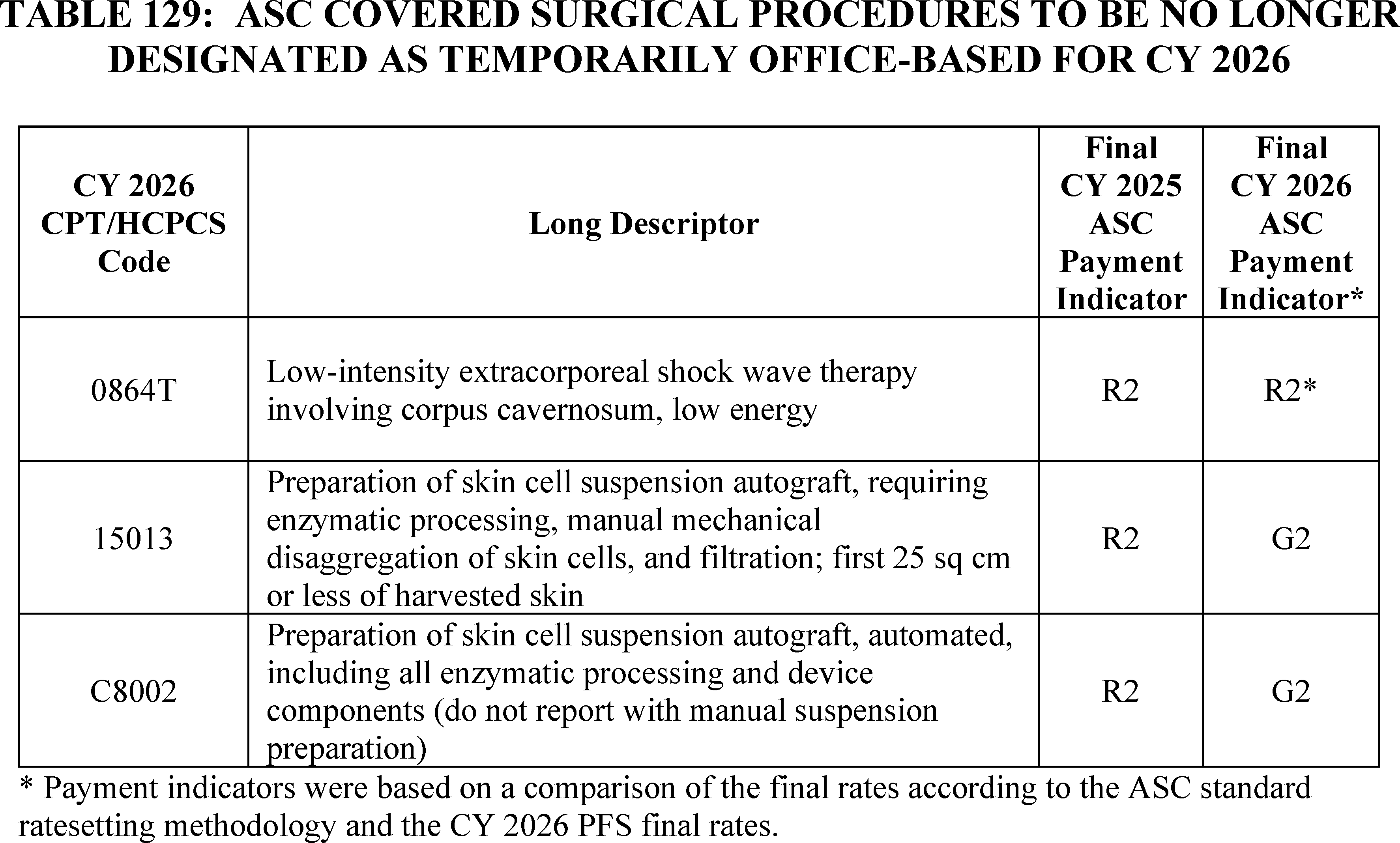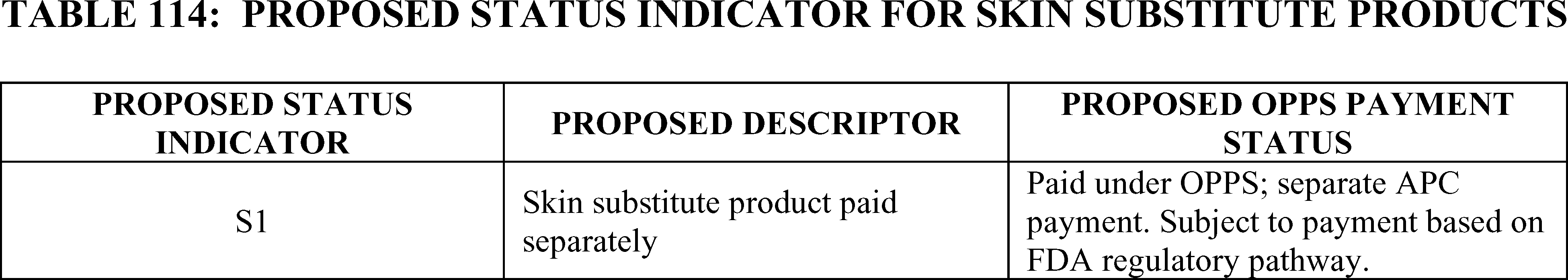 - Payment for Skin Substitute Products under the OPPS. For CY 2026, we are finalizing a policy for CMS to separately pay for the provision of certain groups of skin substitute products as supplies when they are used during a covered application procedure paid under the PFS in the non-facility setting or under the OPPS. We are finalizing a policy to group skin substitutes that are not drugs or biologicals using three FDA regulatory categories (PMAs, 510(k)s, and 361 HCT/Ps) to set payment rates. To effectuate this categorization into a payment policy under the OPPS, we are creating three new APCs for HCPCS codes that describe skin substitute products organized by clinical and resource similarity. These three APCs will divide skin substitutes by their FDA regulatory pathway. Specifically, we are creating: APC 6000 (PMA Skin Substitute Products); APC 6001 (510(k) Skin Substitute Products); and APC 6002 (361 HCT/P Skin Substitute Products). This will result in an initial payment rate of $127.14 for each of the new APCs. We are implementing this policy in both the non-facility, ambulatory surgical center setting, and outpatient hospital settings.