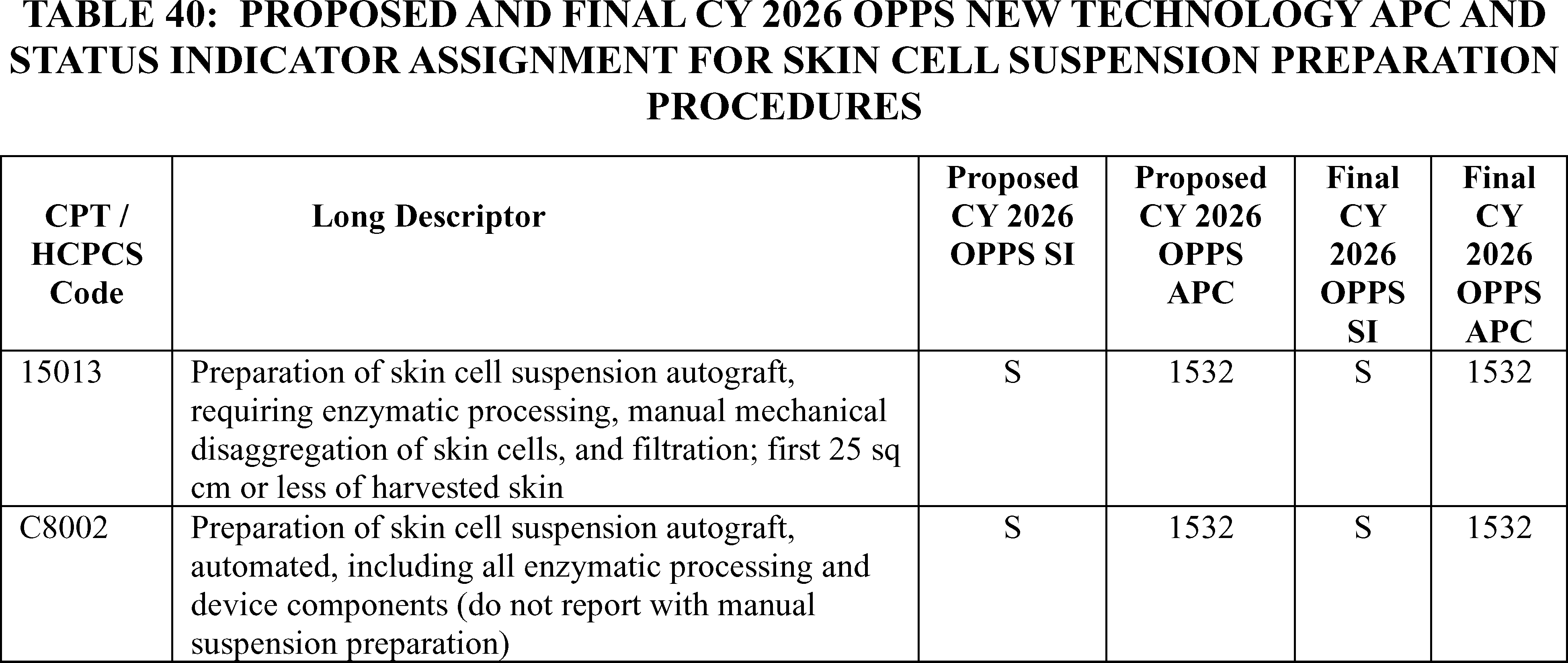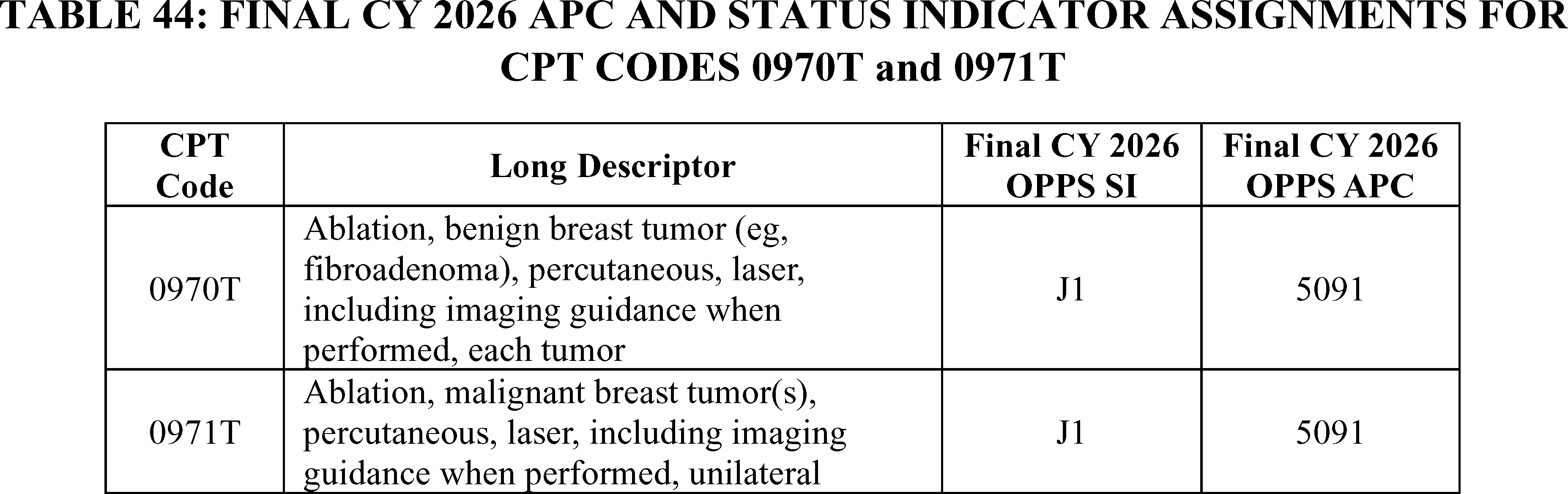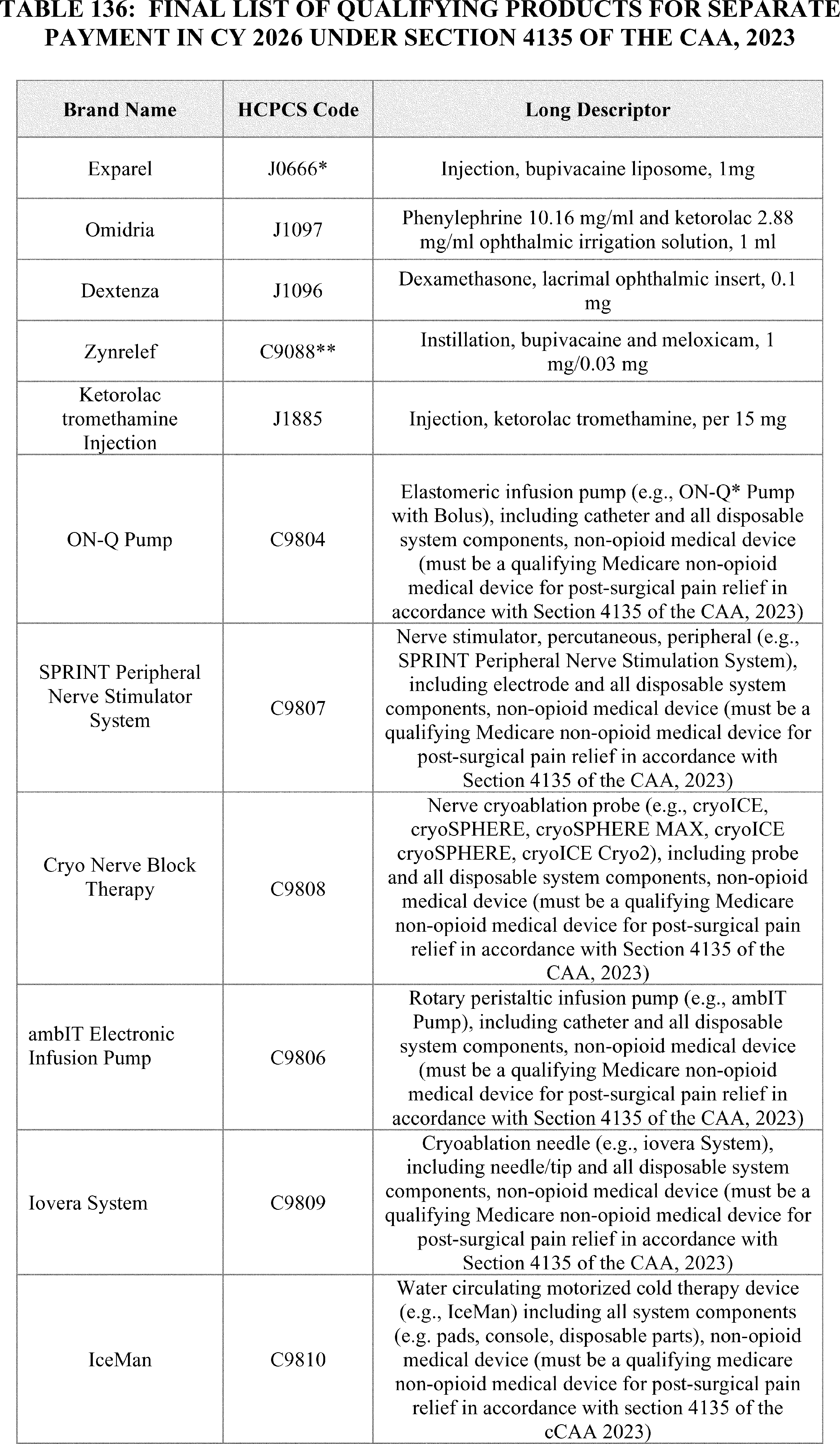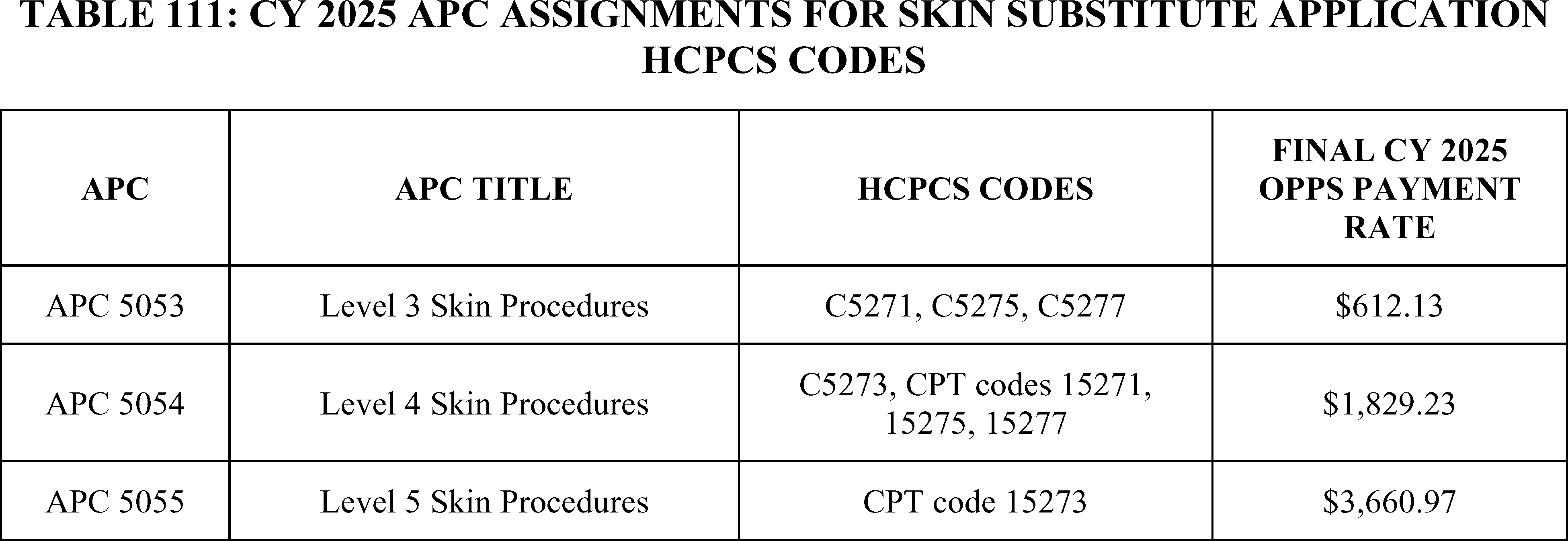 - Payment for Skin Substitute Products under the OPPS. For CY 2026, we are finalizing a policy for CMS to separately pay for the provision of certain groups of skin substitute products as supplies when they are used during a covered application procedure paid under the PFS in the non-facility setting or under the OPPS. We are finalizing a policy to group skin substitutes that are not drugs or biologicals using three FDA regulatory categories (PMAs, 510(k)s, and 361 HCT/Ps) to set payment rates. To effectuate this categorization into a payment policy under the OPPS, we are creating three new APCs for HCPCS codes that describe skin substitute products organized by clinical and resource similarity. These three APCs will divide skin substitutes by their FDA regulatory pathway. Specifically, we are creating: APC 6000 (PMA Skin Substitute Products); APC 6001 (510(k) Skin Substitute Products); and APC 6002 (361 HCT/P Skin Substitute Products). This will result in an initial payment rate of $127.14 for each of the new APCs. We are implementing this policy in both the non-facility, ambulatory surgical center setting, and outpatient hospital settings.
