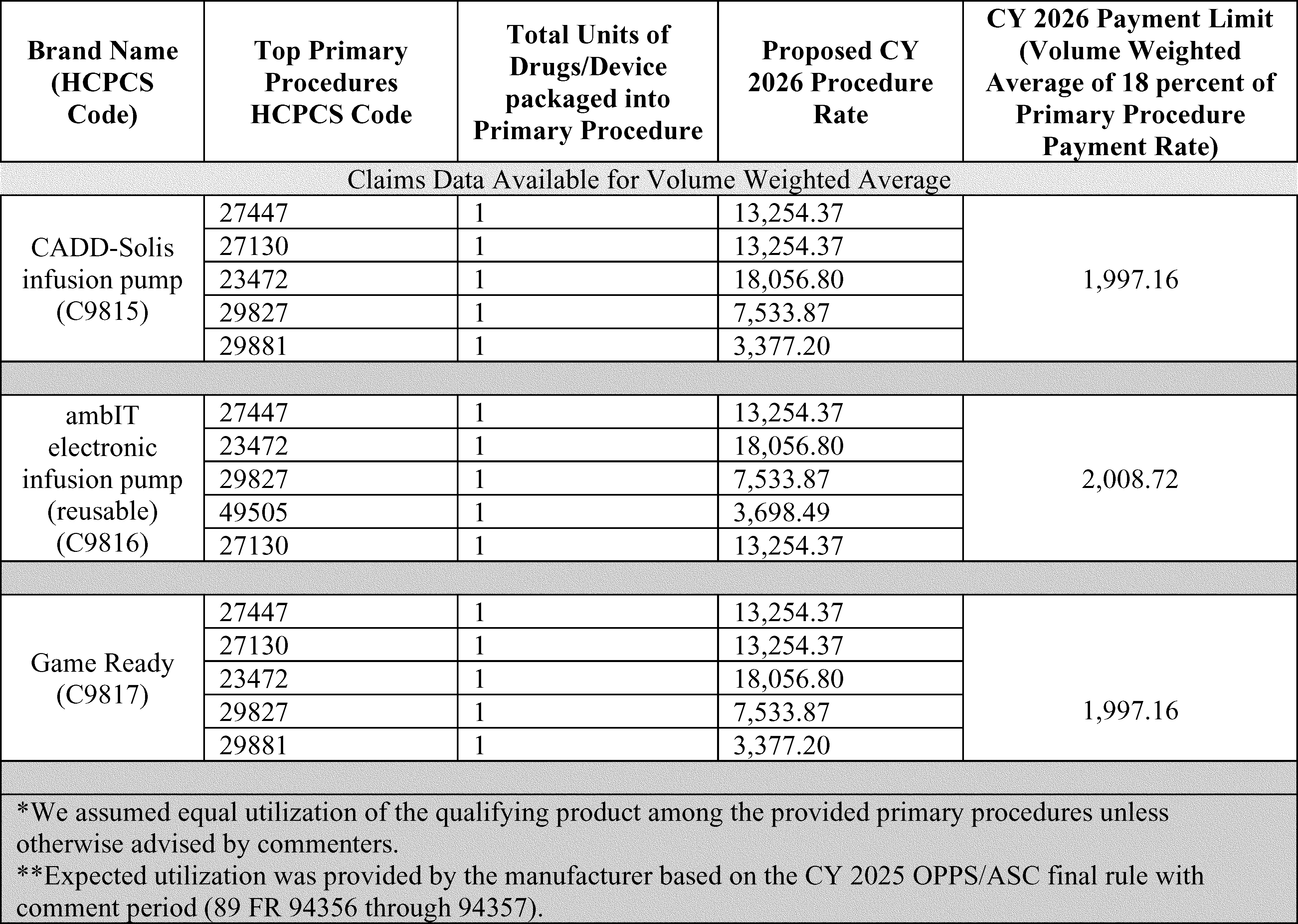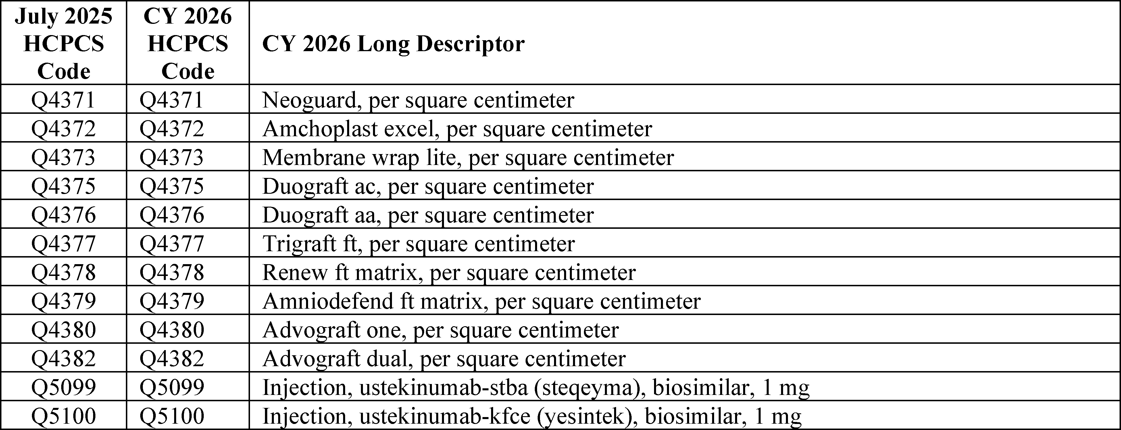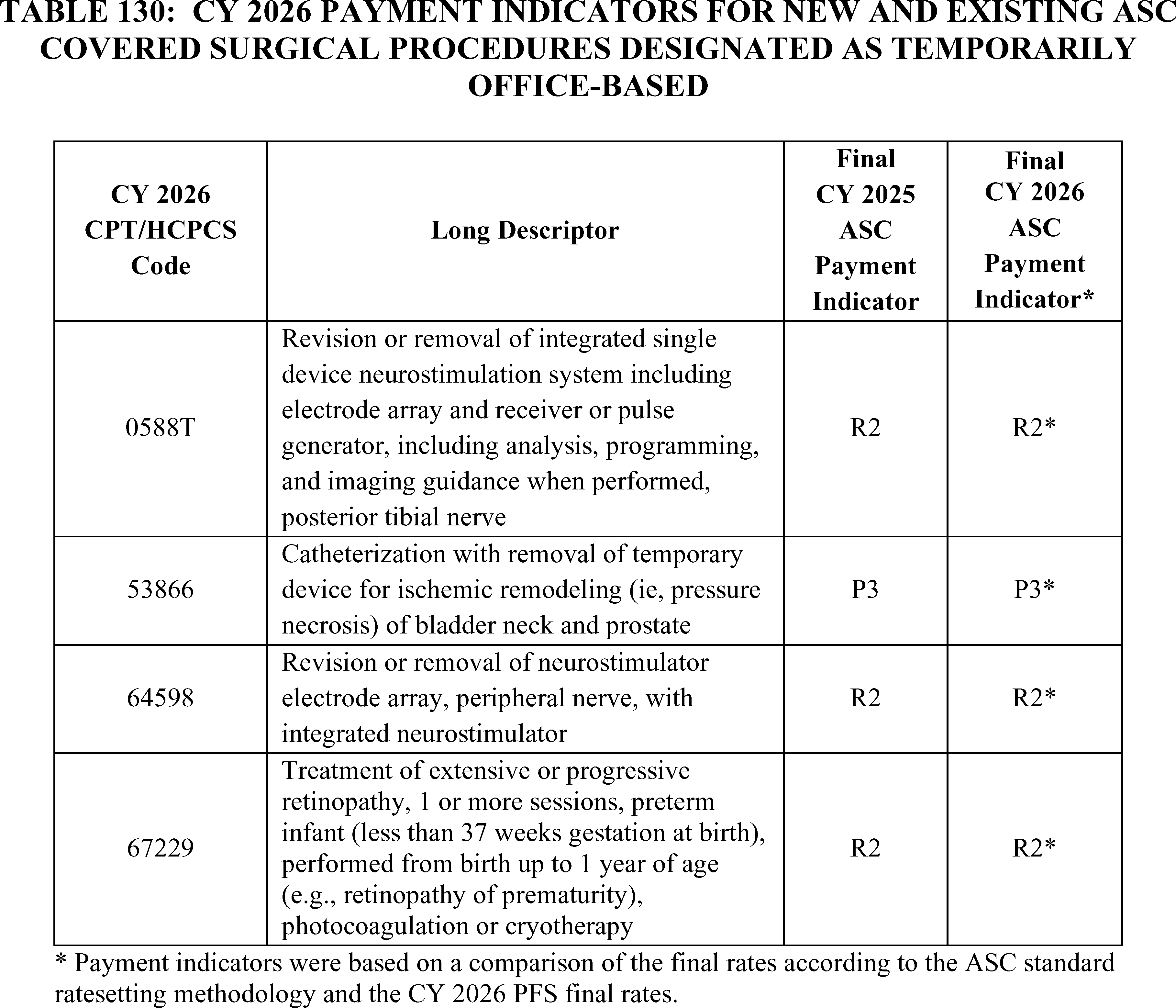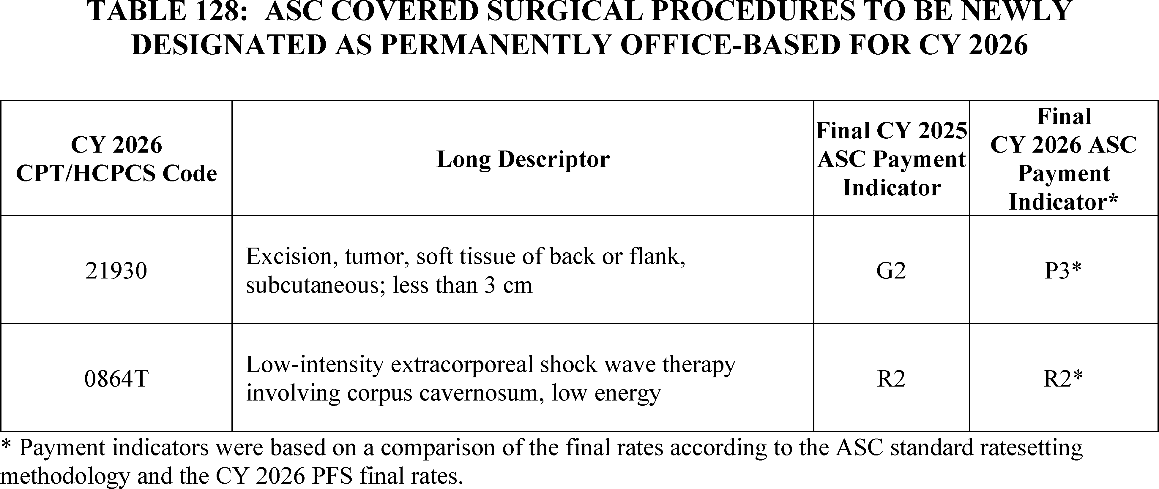 - Payment for Skin Substitute Products under the OPPS. For CY 2026, we are finalizing a policy for CMS to separately pay for the provision of certain groups of skin substitute products as supplies when they are used during a covered application procedure paid under the PFS in the non-facility setting or under the OPPS. We are finalizing a policy to group skin substitutes that are not drugs or biologicals using three FDA regulatory categories (PMAs, 510(k)s, and 361 HCT/Ps) to set payment rates. To effectuate this categorization into a payment policy under the OPPS, we are creating three new APCs for HCPCS codes that describe skin substitute products organized by clinical and resource similarity. These three APCs will divide skin substitutes by their FDA regulatory pathway. Specifically, we are creating: APC 6000 (PMA Skin Substitute Products); APC 6001 (510(k) Skin Substitute Products); and APC 6002 (361 HCT/P Skin Substitute Products). This will result in an initial payment rate of $127.14 for each of the new APCs. We are implementing this policy in both the non-facility, ambulatory surgical center setting, and outpatient hospital settings.
