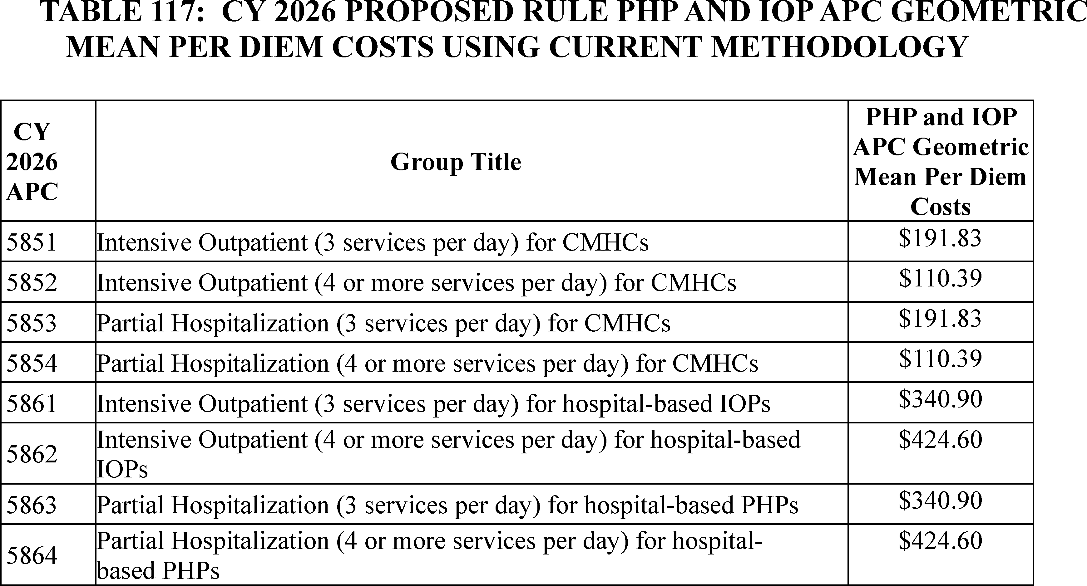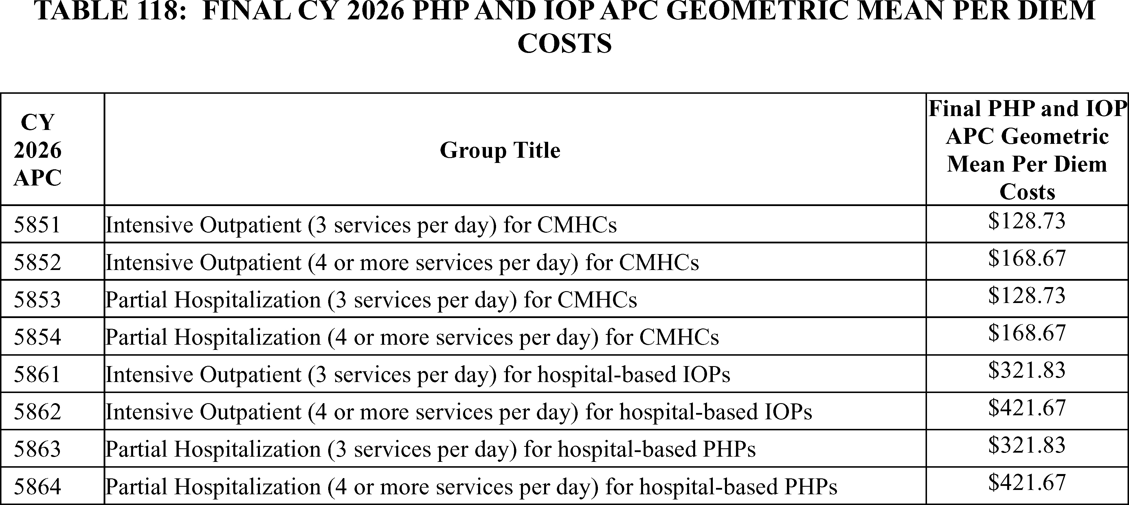 - Partial Hospitalization and Intensive Outpatient Programs: We finalizing changes to our methodology used to calculate the CY 2026 Community Mental Health Center (CMHC) Partial Hospitalization Program (PHP), and Intensive Outpatient Program (IOP) costs based on 40 percent of the corresponding proposed hospital-based PHP and IOP costs. This change will resolve a cost inversion in CMHC cost data that resulted in higher geometric mean costs for 3-service days than for 4-service days. It also stabilizes rates for CMHCs by basing them on data from a much larger set of providers while preserving the adjustment for the structural differences between CMHC and hospital costs.
